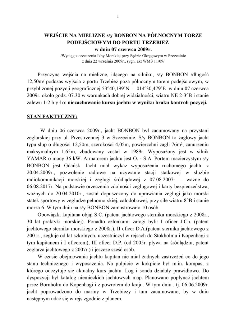 1 WEJŚCIE NA MIELIZNĘ s/y BONBON NA PÓŁNOCNYM TORZE PODEJŚCIOWYM DO PORTU TRZEBIEŻ w dniu 07 czerwca 2009r. /Wyciąg z orzeczenia Izby Morskiej przy Sądzie Okręgowym w Szczecinie z dnia 22 września 2009r., sygn. akt WMS 11/09/ Przyczyną wejścia na mieliznę, idącego na silniku, s/y BONBON /długość 12,50m/ podczas wyjścia z portu Trzebież poza północnym torem podejściowym, w przybliżonej pozycji geograficznej 53°40,199’N i 014º30,479’E w dniu 07 czerwca 2009r. około godz. 07.30 w warunkach dobrej widzialności, wiatru NE 2-3°B i stanie zalewu 1-2 b y ł o: niezachowanie kursu jachtu w wyniku braku kontroli pozycji. STAN FAKTYCZNY: W dniu 06 czerwca 2009r., jacht BONBON był zacumowany na przystani żeglarskiej przy ul. Przestrzennej 3 w Szczecinie. S/y BONBON to żaglowy jacht typu slup o długości 12,50m, szerokości 4,05m, powierzchni żagli 76m², zanurzeniu maksymalnym 1,65m, zbudowany został w 1989r. Wyposażony jest w silnik YAMAR o mocy 36 kW. Armatorem jachtu jest O. - S.A. Portem macierzystym s/y BONBON jest Gdańsk. Jacht miał wykaz wyposażenia ruchomego jachtu z 20.04.2009r., pozwolenie radiowe na używanie stacji statkowej w służbie radiokomunikacji morskiej i żeglugi śródlądowej z 07.08.2007r. – ważne do 06.08.2017r. Na podstawie orzeczenia zdolności żeglugowej i karty bezpieczeństwa, ważnych do 20.04.2010r., został dopuszczony do uprawiania żeglugi jako morski statek sportowy w żegludze pełnomorskiej, całodobowej, przy sile wiatru 8°B i stanie morza 6. W tym dniu na s/y BONBON zamustrowało 10 osób. Obowiązki kapitana objął S.C. (patent jachtowego sternika morskiego z 2008r., 30 lat praktyki morskiej). Ponadto członkami załogi byli: I oficer J.Ch. (patent jachtowego sternika morskiego z 2008r.), II oficer D.A.(patent sternika jachtowego z 2001r., żegluje od lat szkolnych, uczestniczył w rejsach do Stokholmu i Kopenhagi z tym kapitanem i I oficerem), III oficer D.P. (od 2005r. pływa na śródlądziu, patent żeglarza jachtowego z 2007r.) i jeszcze sześć osób. W czasie obejmowania jachtu kapitan nie miał żadnych zastrzeżeń co do jego stanu technicznego i wyposażenia. Na pulpicie w kokpicie był m.in. kompas, z którego odczytuje się aktualny kurs jachtu. Log i sonda działały prawidłowo. Do dyspozycji był katalog niemieckich jachtowych map. Planowano popłynąć jachtem przez Bornholm do Kopenhagi i z powrotem do kraju. W tym dniu , tj. 06.06.2009r. jacht poprowadzono do mariny w Trzebieży i tam zacumowano, by w dniu następnym udać się w rejs zgodnie z planem. 2 Kapitan i I oficer przeglądali Locję Bałtyku nr 502 – Wybrzeże polskie, wydanie z 2001r. i ustalili, że z portu Trzebież na północ prowadzi kurs 330°. O godz. 07.10 (07.06.2009r.) kapitan stanął za sterem jachtu i po odcumowaniu w Trzebieży, wyprowadził s/y BONBON na silniku z portu w kierunku wyjścia, aby udać się w zaplanowany rejs. Północny tor podejściowy ma szerokość 30m. Dystans pomiędzy poszczególnymi zielonymi pławami wyznaczającymi krawędź tego toru, to ok. 1/3 Mm. Oś toru wyznaczona jest przez nabieżnik. Po minięciu główek portu, jacht wszedł na Zalew Szczeciński. Kapitan przekazał ster III oficerowi. Polecił mu obserwować zielone pławy i sterować jachtem w odległości ok. 20m od tych pław na wschód. Podał kurs 330°. Nie polecił jednak sternikowi obserwacji kompasu, względnie nabieżnika. Kapitan po przekazaniu steru III oficerowi pozostał na pokładzie. Jacht szedł na silniku z prędkością 3-4w. III oficer po raz pierwszy sterował na tym jachcie i rozpoczynał swój pierwszy morski rejs. Była dobra widzialność, wiatr NE 2-3°B, stan zalewu 1-2. Wiatr wiał na prawą burtę jachtu. Kurs s/y BONBON kontrolowano na podstawie obserwacji zielonych pław. III oficer sterując nie obserwował wskazań kompasu, ani nie kontrolował nabieżnika. Jacht minął zielone pławy TN-E i TN-D i zaczął powoli wytracać prędkość. Sonda wskazywała głębokość ok. 1m. W tym momencie, tj. ok. godz. 07.30 s/y wszedł na mieliznę. Nie było gwałtownego zatrzymania, uderzenia. Załoga wyszła na pokład. Do momentu wejścia na mieliznę, kapitan nie korygował kursu jachtu i nie wydawał poleceń sternikowi. W momencie wejścia na mieliznę, nie określił pozycji jachtu z GPS, względnie pozycji obserwowanej. Kapitan nie zalecił też wykonania sondażu. Kapitan podjął manewry w celu samodzielnego zejścia z mielizny. Manewrował silnikiem wstecz i do przodu. Wychylał też płetwę steru na lewą i prawą burtę. Podjęto próbę balastowania jachtu przez zgromadzenie załogi na burtach. Manewry te nie przyniosły rezultatu. O godz. 07.50 o wejściu na mieliznę przy północnym torze podejściowym powiadomiony został kapitan portu Trzebież i zwrócono się z prośbą o pomoc holowniczą. Kapitana jachtu poinformowano, że jedyną możliwością jest holowanie jachtu przez statek ratowniczy, który najpierw ściągnie jacht z mielizny. Kapitan wyraził zgodę. W celu rozpoznania sytuacji, o godz. 07.51 z miejsca postoju odcumowała łódź ratownicza R-4 z dwoma ratownikami na pokładzie. O godz.07.53 była już przy jachcie. S/y BONBON był oparty lewą burtą na zachodnim uskoku północnego toru podejściowego do Trzebieży, na północ od pławy TN-D. Załoga jachtu została poinformowana o warunkach finansowych tej operacji, które kapitan jachtu zaakceptował. O godz. 07.55 łódź R-4 powróciła do bazy. O godz. 08.01 statek ratowniczy MONSUN (24 GT, długość 13,15m, szerokość 4,19m, zanurzenie 0,92m) odcumował z miejsca postoju. O godz. 08.05 3 minął trawers główek północnych portu Trzebież i o godz. 08.10 był już przy jachcie. Załoga jachtu była spokojna, nie była pod wpływem alkoholu. S/y BONBON znajdował się na mieliźnie w przybliżonej pozycji geograficznej 53°40,199’ N i 014°30,479’ E. O godz. 08.12 ze statku ratowniczego na jacht podano hol. M/
