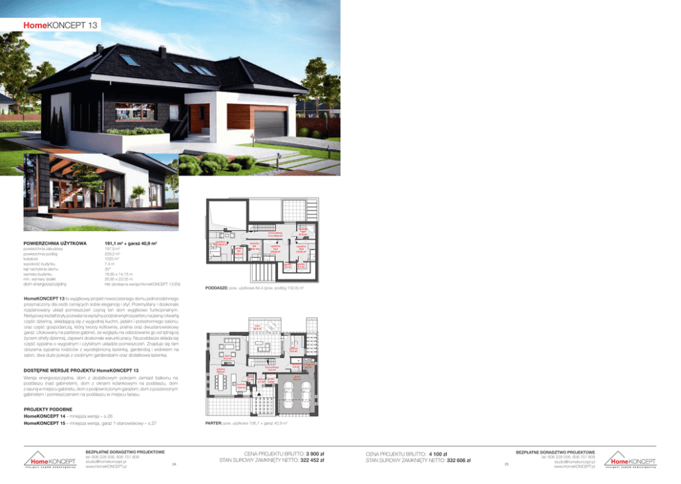 HomeKONCEPT 13 łazienka 3,8 (7,3) m² komunikacja 17,3 (18,0) m² sypialnia 19,3 (25,2) m² POWIERZCHNIA UŻYTKOWA 191,1 m2 + garaż 40,9 m2 powierzchnia zabudowy powierzchnia podłóg kubatura wysokość budynku kąt nachylenia dachu wymiary budynku min. wymiary działki 197,9 m 209,2 m2 1025 m3 7,4 m 35° 18,85 x 14,15 m 26,85 x 22,05 m nie (dostepna wersja HomeKONCEPT 13 EN) dom energooszczędny 2 HomeKONCEPT 13 to wyjątkowy projekt nowoczesnego domu jednorodzinnego przeznaczony dla osób ceniących sobie elegancję i styl. Przemyślany i doskonale rozplanowany układ pomieszczeń czynią ten dom wyjątkowo funkcjonalnym. Nietypowy kształt bryły pozwala na wyraźny podział wnętrza parteru na jasną i otwartą część dzienną, składającą się z wygodnej kuchni, jadalni i przestronnego salonu; oraz część gospodarczą, którą tworzy kotłownia, pralnia oraz dwustanowiskowy garaż. Ulokowany na parterze gabinet, ze względu na odizolowanie go od tętniącej życiem strefy dziennej, zapewni doskonałe warunki pracy. Na poddasze składa się część sypialna o wygodnym i czytelnym układzie pomieszczeń. Znajduje się tam obszerna sypialnia rodziców z wyodrębnioną łazienką, garderobą i widokiem na salon, dwa duże pokoje z osobnymi garderobami oraz dodatkowa łazienka. garder. 3,5 (4,9) m² łazienka 6,9 (8,6) m² Wersja energooszczędna, dom z dodatkowym pokojem zamiast balkonu na poddaszu (nad gabinetem), dom z oknami kolankowymi na poddaszu, dom z sauną w miejscu gabinetu, dom z podpiwniczonym garażem, dom z poszerzonym gabinetem i pomieszczeniem na poddaszu w miejscu tarasu. sypialnia 12,9 (15,6) m² garder. 3,7 m² garder. 3,7 m² PODDASZE: pow. użytkowa 84,4 (pow. podłóg 102,6) m2 taras 32,4 m² gabinet 12,4 m² salon 31,5 m² komunikacja 14,3 m² jadalnia 20,9 m² DOSTĘPNE WERSJE PROJEKTU HomeKONCEPT 13 sypialnia 13,2 (15,6) m² spiżar. 2,1 m² kuchnia 10,6 m² wiatro. 2,7 m² garder. 3,0 m² łazienka 4,4 m² kotł.+pral. 4,8 m² garaż 40,9 m² PROJEKTY PODOBNE HomeKONCEPT 14 – mniejsza wersja – s.26 HomeKONCEPT 15 – mniejsza wersja, garaż 1-stanowiskowy – s.27 BEZPŁATNE DORADZTWO PROJEKTOWE tel: 606 228 556, 606 751 809 [email protected] www.HomeKONCEPT.pl PARTER: pow. użytkowa 106,7 + garaż 40,9 m2 24 CENA PROJEKTU BRUTTO: 3 900 zł STAN SUROWY ZAMKNIĘTY NETTO: 322 452 zł CENA PROJEKTU BRUTTO: 4 100 zł STAN SUROWY ZAMKNIĘTY NETTO: 332 606 zł 25 BEZPŁATNE DORADZTWO PROJEKTOWE tel: 606 228 556, 606 751 809 [email protected] www.HomeKONCEPT.pl HomeKONCEPT 13 ENERGO HomeKONCEPT 13 ENERGO WERSJA ENERGOOSZCZĘDNA Dom HomeKONCEPT 13 zaprojektowaliśmy również w wersji energooszczędnej, oznaczonej ENERGO. Aby polepszyć energooszczędność domu zwiększyliśmy ocieplenie ścian, dachu oraz podłogi na gruncie, zaprojektowaliśmy wentylację mechaniczną z odzyskiem ciepła (rekuperację) oraz zastosowaliśmy stolarkę okienną i drzwiową o podwyższonych parametrach energooszczędnych. Wszystkie wymienione zmiany z pewnością obniżą koszty użytkowania domu w przyszłości przy stosunkowo niewielkich nakładach inwestycyjnych w okresie budowy. DOSTĘPNE WERSJE PROJEKTU HomeKONCEPT 13 EN: POWIERZCHNIA UŻYTKOWA 190,9 m2 + garaż 40,9 m2 PROJEKTY PODOBNE powierzchnia zabudowy powierzchnia podłóg kubatura wysokość budynku kąt nachylenia dachu wymiary budynku min. wymiary działki 193,2 m2 213,8 m2 1237 m3 7,4 m 35° 18,95 x 14,25 m 26,95 x 22,1 m HomeKONCEPT 14 – mniejsza wersja, wentylacja grawitacyjna – s.26 dom energooszczędny BEZPŁATNE DORADZTWO PROJEKTOWE tel: 606 228 556, 606 751 809 [email protected] www.HomeKONCEPT.pl 24 CENA PROJEKTU BRUTTO: 3 900 zł STAN SUROWY ZAMKNIĘTY NETTO: 322 452 zł Wersja z wentylacją grawitacyjną, dom zwężony o 1 metr, dom z poszerzonym gabinetem, dom z rozbudowanym gabinetem, z dodatkową sypialnią i miejscem na saunę na parterze, dom z powiększoną kotłownią, dom zwężony o 2.7 m (bez garażu), dom z zabudowaną antresolą, dom z poszerzonym gabinetem i zabudowanym tarasem (jako ogród zimowy), dom z bramą garażową na bocznej elewacji. HomeKONCEPT 15 – mniejsza wersja, bez antresoli, garaż 1-stanowiskowy, wentylacja grawitacyjna – s.27 tak + wentylacja mechaniczna CENA PROJEKTU BRUTTO: 4 100 zł STAN SUROWY ZAMKNIĘTY NETTO: 332 606 zł 25 BEZPŁATNE DORADZTWO PROJEKTOWE tel: 606 228 556, 606 751 809 [email protected] www.HomeKONCEPT.pl