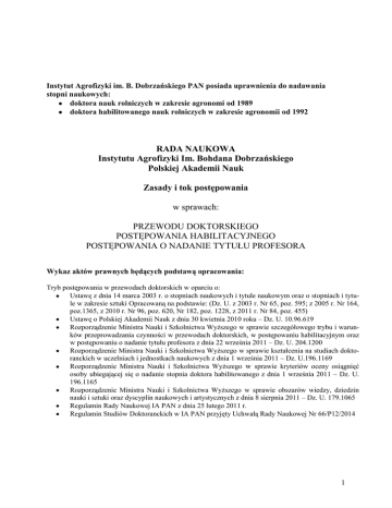 Instytut Agrofizyki im. B. Dobrzańskiego PAN posiada uprawnienia do nadawania stopni naukowych: doktora nauk rolniczych w zakresie agronomi od 1989 doktora habilitowanego nauk rolniczych w zakresie agronomii od 1992 RADA NAUKOWA Instytutu Agrofizyki Im. Bohdana Dobrzańskiego Polskiej Akademii Nauk Zasady i tok postępowania w sprawach: PRZEWODU DOKTORSKIEGO POSTĘPOWANIA HABILITACYJNEGO POSTĘPOWANIA O NADANIE TYTUŁU PROFESORA Wykaz aktów prawnych będących podstawą opracowania: Tryb postępowania w przewodach doktorskich w oparciu o: Ustawę z dnia 14 marca 2003 r. o stopniach naukowych i tytule naukowym oraz o stopniach i tytule w zakresie sztuki Opracowaną na podstawie: (Dz. U. z 2003 r. Nr 65, poz. 595; z 2005 r. Nr 164, poz.1365, z 2010 r. Nr 96, poz. 620, Nr 182, poz. 1228, z 2011 r. Nr 84, poz. 455) Ustawę o Polskiej Akademii Nauk z dnia 30 kwietnia 2010 roku – Dz. U. 10.96.619 Rozporządzenie Ministra Nauki i Szkolnictwa Wyższego w sprawie szczegółowego trybu i warunków przeprowadzania czynności w przewodach doktorskich, w postępowaniu habilitacyjnym oraz w postępowaniu o nadanie tytułu profesora z dnia 22 września 2011 – Dz. U. 204.1200 Rozporządzenie Ministra Nauki i Szkolnictwa Wyższego w sprawie kształcenia na studiach doktoranckich w uczelniach i jednostkach naukowych z dnia 1 września 2011 – Dz. U.196.1169 Rozporządzenie Ministra Nauki i Szkolnictwa Wyższego w sprawie kryteriów oceny osiągnięć osoby ubiegającej się o nadanie stopnia doktora habilitowanego z dnia 1 września 2011 – Dz. U. 196.1165 Rozporządzenie Ministra Nauki i Szkolnictwa Wyższego w sprawie obszarów wiedzy, dziedzin nauki i sztuki oraz dyscyplin naukowych i artystycznych z dnia 8 sierpnia 2011 – Dz. U. 179.1065 Regulamin Rady Naukowej IA PAN z dnia 25 lutego 2011 r. Regulamin Studiów Doktoranckich w IA PAN przyjęty Uchwałą Rady Naukowej Nr 66/P12/2014 1 PRZEWÓD DOKTORSKI Zasady i tok postępowania Kandydat przed otwarciem przewodu wygłasza seminarium w Instytucie, na które zapraszana jest Komisja ds. Rozwoju i Oceny Kadry Naukowej, Członkowie Rady Naukowej, Pracownicy Instytutu. DOKUMENTY DO WSZCZĘCIA PRZEWODU DOKTORSKIEGO Osoba ubiegająca się o nadanie stopnia doktora, zwana dalej ‘kandydatem”, wraz z wnioskiem o wszczęcie przewodu doktorskiego składa Dyrektorowi Instytutu: 1. Oryginał albo poświadczoną przez Instytut kopię dokumentu stwierdzającego posiadanie tytułu zawodowego, o którym mowa w art. 12 ust. 1 pkt 1 ustawy z dnia 14 marca 2003 r. o stopniach naukowych i tytule naukowym oraz o stopniach i tytule w zakresie sztuki, lub dyplomu, o którym mowa w art. 191a ust. 3 i 4 ustawy z dnia 27 lipca 2005 r. - Prawo o szkolnictwie wyższym (Dz. U. nr 164, poz.1365, z późn. zm.). 2. W przypadku osoby, która posiada co najmniej tytuł zawodowy licencjata, inżyniera lub równorzędny i uzyskała „Diamentowy Grant” w ramach programu ustanowionego przez ministra właściwego do spraw nauki kandydat przedstawia Dyrektorowi oryginał albo poświadczoną przez Instytut kopię dokumentu stwierdzającego posiadanie tytułu zawodowego licencjata, inżyniera albo równorzędnego oraz dokumentu potwierdzającego uzyskanie „Diamentowego Grantu” w ramach programu ustanowionego przez ministra właściwego do spraw nauki. 3. Proponowany temat i koncepcję rozprawy doktorskiej z zakresu nauk rolniczych, dyscypliny agronomia-agrofizyka . 4. Kandydat może przedłożyć propozycję osoby promotora wraz z Jego pisemną zgodą, podaniem dyscypliny jaką reprezentuje zgodnie z wykazem w bazie POL-on i ewentualnie uzasadnioną propozycję promotora pomocniczego z określeniem dyscypliny jaką reprezentuje. 5. Propozycje egzaminów z dyscypliny dodatkowej, egzamin z języka obcego jest przeprowadzany zgodnie z regulaminem Studiów Doktoranckich. 6. Kandydat może złożyć certyfikat potwierdzający znajomość języka angielskiego. 7. Kandydat, który złożył odpowiedni certyfikat jest zwolniony z egzaminu doktorskiego z języka angielskiego; wykaz certyfikatów w Zał., 1 rozporządzenia MNiSzW z 22.09.2011r. (Dz. U. z 2011 r., nr 204, poz.1200) 8. Wykaz prac naukowych, twórczych prac zawodowych, informację o działalności popularyzującej naukę. W przypadku publikacji przyjętych do druku należy złożyć tekst pracy wysłanej do druku wraz z zaświadczeniem redakcji o zakwalifikowaniu do druku i planowanym terminie wydania. Minimalnym dorobkiem naukowym niezbędnym do otwarcia przewodu doktorskiego jest posiadanie wydanej lub przyjętej do druku publikacji w czasopiśmie posiadającym Impact Factor. 9. Życiorys uwzględniający przebieg pracy naukowej i zawodowej. 10. Kwestionariusz osobowy (druk do pobrania). 11. Informację o przebiegu przewodu doktorskiego, jeżeli osoba składająca wniosek ubiegała się uprzednio o nadanie stopnia doktora w tej samej dyscyplinie. 2 Dokumenty uzupełniające: Umowa – zobowiązanie do pokrycia kosztów przeprowadzenia procedury przewodu doktorskiego - nie dotyczy pracowników i doktorantów Instytutu. Kandydat dodatkowo może przedstawić: wniosek o wyrażenie zgody na przedstawienie rozprawy doktorskiej w innym języku niż język polski rozporządzenia MNiSzW z 22.09.2011r. (Dz. U. z 2011 r., nr 204, poz.1200) DOKTORATY W RAMACH WSPÓŁPRACY Przewody doktorskie mogą być przeprowadzane wspólnie, na podstawie porozumienia z inną jednostką organizacyjną (Rada Wydziału wyższej uczelni lub Rada Naukowa instytutu), w tym także zagraniczną, jeżeli posiadają one uprawnienia do nadawania stopnia doktora. W przypadku wspólnego przewodu doktorskiego, czynności przewodu doktorskiego kończą się uchwałami podejmowanymi w trybie określonym w porozumieniu, z zachowaniem odpowiednich przepisów. Przewody doktorskie mogą być przeprowadzane wspólnie także w ramach współpracy międzynarodowej. Rada Naukowa może powołać kopromotora – pracownika zagranicznej szkoły wyższej lub instytucji n