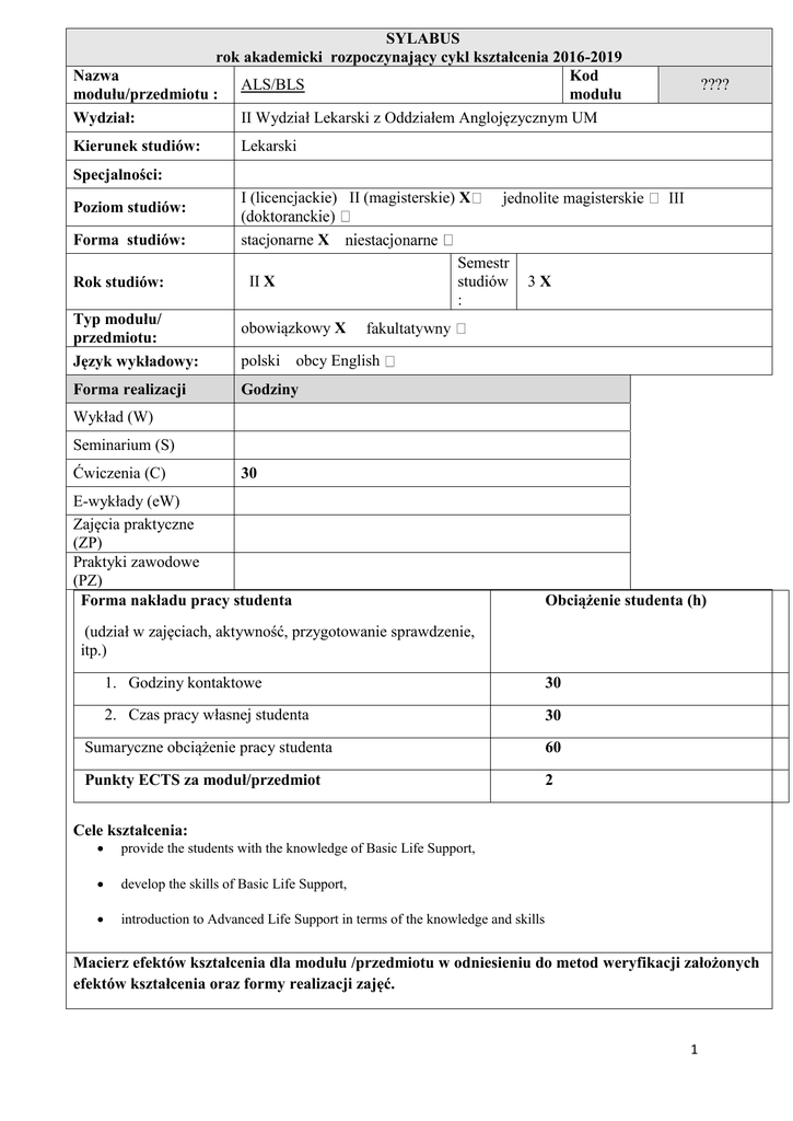 SYLABUS rok akademicki rozpoczynający cykl kształcenia 2016-2019 Nazwa Kod ALS/BLS modułu/przedmiotu : modułu II Wydział Lekarski z Oddziałem Anglojęzycznym UM Wydział: Kierunek studiów: ???? Lekarski Specjalności: Poziom studiów: I (licencjackie) II (magisterskie) X Forma studiów: stacjonarne X Rok studiów: Typ modułu/ przedmiotu: Język wykładowy: Forma realizacji Semestr studiów : II X 3X obowiązkowy X polski obcy English Godziny Wykład (W) Seminarium (S) Ćwiczenia (C) 30 E-wykłady (eW) Zajęcia praktyczne (ZP) Praktyki zawodowe (PZ) Forma nakładu pracy studenta Obciążenie studenta (h) (udział w zajęciach, aktywność, przygotowanie sprawdzenie, itp.) 1. Godziny kontaktowe 30 2. Czas pracy własnej studenta 30 Sumaryczne obciążenie pracy studenta 60 Punkty ECTS za moduł/przedmiot 2 Cele kształcenia: provide the students with the knowledge of Basic Life Support, develop the skills of Basic Life Support, introduction to Advanced Life Support in terms of the knowledge and skills Macierz efektów kształcenia dla modułu /przedmiotu w odniesieniu do metod weryfikacji założonych efektów kształcenia oraz formy realizacji zajęć. 1 Numer efektu kształceni a Student, który zaliczy moduł ( przedmiot) wie/umie/potrafi: Metody weryfikacji osiągnięcia założonych efektów kształcenia: Forma realizacji zajęć dydaktycznyc h * wpisz symbol Test MCQ VI.W 4 Knows principles of the modern circulatory-respiratory resuscitation VI. U 10 Performs basic rescue activities VI. U 11 Can act in the algorithm of advanced rescue activities (ALS, ACLS) i.e. can conduct ventilations with ambu sack, can asses the effectiveness of this ventilation, he is putting the oral-pharyngeal tube on, laryngeal mask and is carrying out simple intubation Zaliczenie praktyczne w formie egzaminu AHA Test MCQ Test MCQ Ć Ć Ć PRZYKŁADOWE METODY WERYFIKACJI EFEKTÓW KSZTAŁCENIA w zakresie wiedzy: Egzamin ustny (niestandaryzowany, standaryzowany, tradycyjny, problemowy); Egzamin pisemny – student generuje / rozpoznaje odpowiedź (esej, raport; krótkie strukturyzowane pytania /SSQ/; test wielokrotnego wyboru /MCQ/; test wielokrotnej odpowiedzi /MRQ/; test dopasowania; test T/N; test uzupełniania odpowiedzi) w zakresie umiejętności: Egzamin praktyczny; Obiektywny Strukturyzowany Egzamin Kliniczny /OSCE/; Mini-CEX (mini – clinical examination) ; Realizacja zleconego zadania; Projekt, prezentacja w zakresie kompetencji społecznych: Esej refleksyjny; Przedłużona obserwacja przez opiekuna / nauczyciela prowadzącego; Ocena 360° (opinie nauczycieli, kolegów/koleżanek, pacjentów, innych współpracowników); Samoocena ( w tym portfolio) Treść zajęć: 1. Intorduction to BLS - chest copressions, ventilation using Bag-Valve Mask 2. BLS for Healthcare Providers AHA course 3. BLS for Healthcare Providers AHA course 4. BLS for Healthcare Providers AHA course 5. Test and practical examination - BLS for Healthcare Providers AHA course - (course partial 1) 6. Introduction to ACLS - team work, ECG interpretation, non-shockable rhythms 7. Introduction to ACLS - non-shockable rhythms scenarios 8. Introduction to ACLS - shockable rhythms 9. Introduction to ACLS - shockable rhythms scenarios 10. Introduction to ACLS - course partial 2 (lab 6-9) 2 Literatura 1. BLS for Healthcare Providers by Mary Fran Hazinski, American Heart Association, 2010/2015 2. Advanced Cardiovascular Life Support: Provider Manual by Elizabeth Sinz, Kenneth Navarro and Erik S. Soderberg, American Heart Association, 2010/2015 Wymagania dotyczące pomocy dydaktycznych (np. laboratorium, rzutnik multimedialny, inne…) 1. Rzutnik multimedialny. 2. Laptop. 3. Fantomy do ćwiczeń BLS, BLS - AED. Środki do dezynfekcji i pielęgnacji fantomów. 4. AED + elektrody. 5. Worki ABMU Warunki uzyskania zaliczenia przedmiotu: 1. In order to complete the course students have to: - obey attendance and behavior policy; - pass partials and final tests. 2. Attendance at the partials and final tests is obligatory. The student has no opportunity to take them at the other term. Only the students who passed the partial tests can take the Final Test. 3. The student can not improve the degree to better one. 4. First partial is American Heart Association BLS for Healthcare Providers examination. To pass it the student has to correctly answer the test questions (21/25) and pass practical part - both according to American Heart Association guidelines. If succesful, AHA certificate will be issued. 5. Second partial is 15 questions theory test. To pass the second partial the students have to achieve 60% (8/15) 6. Final Test – 30 points (theoretical) VI. FINAL TEST 1. Final test takes place in Collegium Maius. The date of the final test cannot be changed. Students who do not attend final test obtain ‘Fail’ score and have to take the test during retake session. The only exception regards absence justified by medical excuse note. In such cases a date will be individually assigned for the student by the Head of the Course. 2. To be allowed to take the First Aid Final Test student must obtain a positive evaluation from the Simulation Center Council Meeting. List of students who pass the course and can take the final test will be posted after final evaluation of the student’s achievements which will take place during Simulation Center Faculty Council Meeting. 3. To enter final test session students must identify themselves with the students’ IDs and any 3 other form of picture ID. 4. Final test consist of 30 multiple choice questions, during which students can obtain maximum of 30 points (students obtain one point for one correctly answered question). 5. Students have 30 minutes to answer examination questions. 6. To pass final test students have to answer at least 51% of questions correctly and successfully complete both partials. In case of failing the final test, student has two retakes: 1st is an theoretical test, 2nd retake is an oral ex