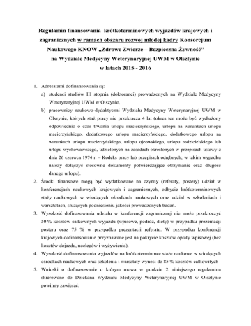 Regulamin finansowania krótkoterminowych wyjazdów krajowych i zagranicznych w ramach obszaru rozwój młodej kadry Konsorcjum Naukowego KNOW „Zdrowe Zwierzę – Bezpieczna Żywność” na Wydziale Medycyny Weterynaryjnej UWM w Olsztynie w latach 2015 - 2016 1. Adresatami dofinansowania są: a) studenci studiów III stopnia (doktoranci) prowadzonych na Wydziale Medycyny Weterynaryjnej UWM w Olszynie, b) pracownicy naukowo-dydaktyczni Wydziału Medycyny Weterynaryjnej UWM w Olszynie, których staż pracy nie przekracza 4 lat (okres ten może być wydłużony odpowiednio o czas trwania urlopu macierzyńskiego, urlopu na warunkach urlopu macierzyńskiego, dodatkowego urlopu macierzyńskiego, dodatkowego urlopu na warunkach urlopu macierzyńskiego, urlopu ojcowskiego, urlopu rodzicielskiego lub urlopu wychowawczego, udzielonych na zasadach określonych w przepisach ustawy z dnia 26 czerwca 1974 r. – Kodeks pracy lub przepisach odrębnych; w takim wypadku należy dołączyć stosowne dokumenty potwierdzające otrzymanie oraz długość danego urlopu). 2. Środki finansowe mogą być wydatkowane na czynny (referaty, postery) udział w konferencjach naukowych krajowych i zagranicznych, odbycie krótkoterminowych staży naukowych w wiodących ośrodkach naukowych oraz udział w szkoleniach i warsztatach, służących podniesieniu jakości prowadzonych badań. 3. Wysokość dofinasowania udziału w konferencji zagranicznej nie może przekroczyć 50 % kosztów całkowitych wyjazdu (wpisowe, podróż, diety) w przypadku prezentacji posteru oraz 75 % w przypadku prezentacji referatu. W przypadku konferencji krajowych dofinansowanie przyznawane jest na pokrycie kosztów opłaty wpisowej (bez kosztów dojazdu, noclegów i wyżywienia). 4. Wysokość dofinansowania wyjazdów na krótkoterminowe staże naukowe w wiodących ośrodkach naukowych oraz szkolenia i warsztaty wynosi do 85 % kosztów całkowitych 5. Wnioski o dofinasowanie o którym mowa w punkcie 2 niniejszego regulaminu skierowane do Dziekana Wydziału Medycyny Weterynaryjnej UWM w Olsztynie powinny zawierać: a) formularz wniosku z informacjami o wnioskodawcy i celu wyjazdu – Załącznik nr 1; b) wykaz dorobku naukowego wnioskodawcy; c) informację o wpływie dofinansowania wyjazdu na jakość prowadzonych badań naukowych (max 1 strona A4); d) załączniki w postaci zaproszenia do udziału w stażu naukowym, informacji o konferencji, itp. 6. Wnioski o których mowa w punkcie 7 przyjmowane są w sposób ciągły w Biurze KNOW „Zdrowe Zwierzę – Bezpieczna Żywność„ Wydziału Medycyny Weterynaryjnej UWM w Olsztynie, mającym swoją siedzibę w Dziekanacie Wydziału. 7. Wnioski są rozpatrywane dofinansowania na jakość w trybie konkursowym, prowadzonych badań uwzględniającym naukowych oraz wpływ dorobek wnioskodawcy. W przypadku zbliżonej oceny merytorycznej wniosków pierwszeństwo będą miały osoby, które dotychczas nie korzystały z dofinansowania określonego w punkcie 2 niniejszego regulaminu. 8. Ocenę wniosków przeprowadza Rada Naukowa KNOW „Zdrowe Zwierzę – Bezpieczna Żywność” Wydziału Medycyny Weterynaryjnej UMW w Olsztynie. 9. Ocena wniosków odbywa się kwartalnie. Jej wyniki będą ogłaszane do 10 października 2015 roku w przypadku wniosków złożonych w III kwartale 2015 roku, do 10 stycznia 2016 w przypadku wniosków złożonych w IV kwartale 2015 roku, do 10 kwietnia 2016 w przypadku wniosków złożonych w I kwartale 2016, do 10 lipca 2016 w przypadku wniosków złożonych w II kwartale 2016, do 10 października 2016 roku w przypadku wniosków złożonych w III kwartale 2016 roku, do 10 stycznia 2017 roku w przypadku wniosków złożonych w III kwartale 2016 roku. 10. W szczególnie uzasadnionych przypadkach wniosek może być rozpatrzony prze komisję w trybie indywidualnym. 11. Decyzję o przyznaniu dofinansowania podejmuje Dziekan w oparciu w rekomendację komisji. Decyzja jest ostateczna i nie przysługuje od niej odwołanie. 12. Sposobem rozliczenia dofinansowania jest sprawozdanie merytoryczne i finansowe wnioskodawcy z wyjazdu, które należy złożyć w ciągu 30 dni od dnia jego zakończenia w Biurze KNOW „Zdrowe Zwierzę – Bezpieczna Żywność” Wydziału Medycyny Weterynaryjnej UWM w Olsztynie. W przypadku konferencji sprawozdanie musi zawierać załączniki dokumentujące formę (referat, poster) prezentacji wyników badań (program, kopie streszczenia, itp.). 13. Na zakończenie każdego roku rozliczeniowego (do 31 stycznia roku następnego) Biuro KNOW Wydziału Medycyny Weterynaryjnej UWM w Olsztynie przekazuje do Centralnego Biura KNOW sprawozdania merytoryczne i finansowe z wykorzystania środków na dofinansowanie krótkoterminowych wyjazdów krajowych i zagranicznych. 14. Wszystkie dzieła (rozprawy doktorskie, publikacje, patenty, itd.) zrealizowane ze środków dotacji KNOW Konsorcjum Naukowego "Zdrowe Zwierzę - Bezpieczna Żywność" muszą zawierać informację o źródle finansowania (Sfinansowano ze środków dotacji KNOW Konsorcjum "Zdrowe Zwierzę - Bezpieczna Żywność", Ministerstwo Nauki i Szkolnictwa Wyższego decyzja nr 05-1/KNOW2/2015). Prof. dr hab. Andrzej Koncicki Dziekan Wydziału Medycyny Weterynaryjnej Olsztyn, 27.07.2015r. Załącznik 1 Dziekan Wydziału Medycyny Weterynaryjnej Uniwersytetu Warmińsko-Mazurskiego w Olsztynie Wniosek o finasowanie krótkoterminowego wyjazdu krajowego lub zagranicznego w ramach obszaru rozwój młodej kadry Konsorcjum Naukowego KNOW „Zdrowe Zwierzę – Bezpieczna Żywność” Imię i nazwisko Wnioskodawcy Miejsce pracy i stanowisko, data zatrudnienia Wnioskodawcy Cel wyjazdu (właściwe - udział w konferencji krajowej podkreślić) - udział w konferencji zagranicznej - staż naukowy - udział w warsztatach lub szkoleniu W przypadku konferencji: Nazwa konferencji, organizator, miejsce, termin Rodzaj prezentacji - referat plenarny (właściwe podkreślić) - referat - poster Tytuł prezentacji i autorzy 