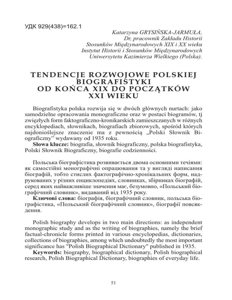 УДК 929(438)=162.1 Katarzyna GRYSIŃSKA-JARMUŁA, Dr, pracownik Zakładu Historii Stosunków Międzynarodowych XIX i XX wieku Instytut Historii i Stosunków Międzynarodowych Uniwersytetu Kazimierza Wielkiego (Polska). T EN DENC J E R O Z W O J O W E P O L S KIE J B I O G R A F I S T Y KI OD K OŃ C A X I X D O P O CZĄTKÓ W XXI WIEKU Biografistyka polska rozwija się w dwóch głównych nurtach: jako samodzielne opracowania monograficzne oraz w postaci biogramów, tj zwięzłych form faktograficzno-kronikarskich zamieszczanych w różnych encyklopediach, słownikach, biografiach zbiorowych, spośród których najdonioślejsze znaczenie ma z pewnością „Polski Słownik Biograficzny” wydawany od 1935 roku. Słowa klucze: biografia, słownik biograficzny, polska biografistyka, Polski Słownik Biograficzny, biografie codzienności. Польська біографістика розвивається двома основними течіями: як самостійні монографічні опрацювання та у вигляді написання біографій, тобто стислих фактографічно-хронікальних форм, надрукованих у різних енциклопедіях, словниках, збірниках біографій, серед яких найважливіше значення має, безумовно, «Польський біографічний словник», видаваний від 1935 року. Ключові слова: біографія, біографічний словник, польська біографістика, «Польський біографічний словник», біографії повсякдення. Polish biography develops in two main directions: as independent monographic study and as the writing of biographies, namely the brief factual-chronicle forms printed in various encyclopedias, dictionaries, collections of biographies, among which undoubtedly the most important significance has "Polish Biographical Dictionary" published in 1935. Keywords: biography, biographical dictionary, Polish biographical research, Polish Biographical Dictionary, biographies of everyday life. 51 Katarzyna GRYSIŃSKA-JARMUŁA Wprowadzenie Pisanie biografii ma wielowiekową tradycję, niezależną od szkół historycznych, kierunków i sytuacji politycznej. Historia opiera się na mniej lub bardziej dosłownie traktowanych biografiach, zaś biografistyka należy do grona najstarszych form pisarstwa historycznego i niemal zawsze zajmowała wiele miejsca w dziejach historiografii. Na zainteresowanie biografistyką zarówno przez badaczy, jak i czytelników wpływa fakt, że ocenie roli poszczególnych jednostek w dziejach niemal zawsze towarzyszą spory i kontrowersje1. Dzięki biografiom historia przestaje być anonimowym procesem, a przez postaci ważne dla historii narodów, ale także i mniejszych społeczności, obejmujących określony region czy wioskę, a nawet jeden ród, rodzinę biografie spełniały rolę wychowawczą i zawsze pociągały swoimi przykładami2. Współcześnie postuluje się, aby badania biograficzne traktować jako «historie życia», narracje opisujące życie jednostek. Winny one obejmować nie tylko biografie indywidualne, portrety, ale również profile biograficzne ukazane w szerszym kontekście historycznym, w zmieniających się strukturach społecznych, gospodarczych politycznych i kulturalnych. Wszystkie te struktury oddziałują na kształtowanie się osobowości postaci, ale jednocześnie same ulegają zmianom wskutek aktywności ludzi. To podwójne uwarunkowanie ukazywane na przykładzie losów konkretnej jednostki pozwala na lepsze, dokładniejsze zrozumienie epoki historycznej i życzących w niej ludzi3. W takim założeniu biografistykę należy wpisać w sferę zainteresowań nie tylko historii, ale także różnych nauk od socjologii, literaturoznawstwa, nauk politycznych po pedagogikę i psychologię społeczną. Najbliżej jest ona jednak związana z historią i tego rodzaju badania dla humanistyki mogą odgrywać rolę pierwszorzędną. Przedmiotem rozważań w niniejszym artykule będą tendencje rozwojowe w biografistyce polskiej począwszy od wieku XIX — do początków XXI wieku. Przy założeniu, że biografistyką obejmuje się „całą tę gałąź piśmiennictwa, a więc zarówno różnego rodzaju wydawnictwa słownikowo-encyklopedyczne ludzi nieżyjących, bądź żyjących (od słowników biograficznych wielu specjalności zawodowych, słowników regionalnych, informatorów typu „Czy wiesz kto to jest?” po „Polski słownik biograficzny”), jak też monografie biograficzne (biografie sensu stricto) przedstawiające jedną bądź więcej osób (biografie 1T. Łepkowski, Kilka uwag o historycznej biografistyce, «Kwartalnik Historyczny» 1964, R. 71, z. 3, s. 711. 2T. Kulak, Uwag nad biografistyką polska XIX wieku, [w:] Stan i perspektywy rozwoju biografistyki polskiej, red. L. Kuberski, Opole 1998, s. 97. 3W. Bieńkowski, Biografistyka w badaniach nad książką, [w:] Książka polska w okresie zaborów, red. M. Kocójowa, Kraków 1991, s. 51. 52 Українська біографістика 13/2016 zbiorowe czy grupowe)”4. Autor postarał się wskazać najważniejsze kierunki rozwoju polskiej biografistyki w ostatnich dwóch stuleciach. Uwzględnione zostały z jednej strony monografie biograficzne, z drugiej zaś wydawnictwa o charakterze słownikowym. Wskazane w tekście konkretne przykładowe prace są wynikiem subiektywnego wyboru i oceny autora i mają na celu ukazanie skali rozwoju tego gatunku piśmiennictwa w Polsce. Pewne zjawiska z uwagi na charakter opracowania zostały jedynie zasygnalizowane i mogą stać się przedmiotem dalszych rozważań. Początki polskiej biografistyki W tradycji polskiej humanistyki biografia jako gatunek pisarski należy przede wszystkim do historii. Początki nowożytnej biog