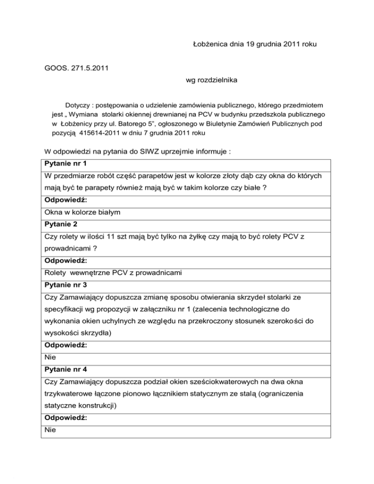 Łobżenica dnia 19 grudnia 2011 roku GOOS. 271.5.2011 wg rozdzielnika Dotyczy : postępowania o udzielenie zamówienia publicznego, którego przedmiotem jest „ Wymiana stolarki okiennej drewnianej na PCV w budynku przedszkola publicznego w Łobżenicy przy ul. Batorego 5”, ogłoszonego w Biuletynie Zamówień Publicznych pod pozycją 415614-2011 w dniu 7 grudnia 2011 roku W odpowiedzi na pytania do SIWZ uprzejmie informuje : Pytanie nr 1 W przedmiarze robót część parapetów jest w kolorze złoty dąb czy okna do których mają być te parapety również mają być w takim kolorze czy białe ? Odpowiedź: Okna w kolorze białym Pytanie 2 Czy rolety w ilości 11 szt mają być tylko na żyłkę czy mają to być rolety PCV z prowadnicami ? Odpowiedź: Rolety wewnętrzne PCV z prowadnicami Pytanie nr 3 Czy Zamawiający dopuszcza zmianę sposobu otwierania skrzydeł stolarki ze specyfikacji wg propozycji w załączniku nr 1 (zalecenia technologiczne do wykonania okien uchylnych ze względu na przekroczony stosunek szerokości do wysokości skrzydła) Odpowiedź: Nie Pytanie nr 4 Czy Zamawiający dopuszcza podział okien sześciokwaterowych na dwa okna trzykwaterowe łączone pionowo łącznikiem statycznym ze stalą (ograniczenia statyczne konstrukcji) Odpowiedź: Nie Pytanie nr 5 Czy stare okna przeznaczone do demontażu są oknami skrzynkowymi czy zespolonymi ? Odpowiedź: Okna z demontaż – drewniane są skrzynkowymi i zespolonymi Pytanie nr 6 Czy stare okna należy poddać utylizacji ? Odpowiedź: Okna z demontażu - drewniane należy przekazać zamawiającemu Pytanie 7 W przedmiarze pozycja 19 i 20 podano metra ż kwadratowy malowania czy dotyczy to malowania ościeży po zamontowaniu okien, całych ścian w których zostały wymienione okna czy całych pomieszczeń w których zostały wymienione okna wraz z sufitami. Odpowiedź Malowanie dotyczy ościeży po zamontowaniu okien i ścian na których będzie następować wymiana stolarki okiennej. (-) Iwona Gajdzińska Dyrektor Przedszkola Publicznego w Łobżenicy