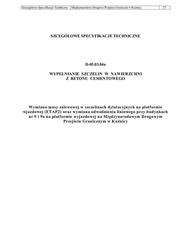 Szczegółowe Specyfikacje Techniczne Międzynarodowe Drogowe Przejście Graniczne w Kuźnicy 27 SZCEGÓŁOWE SPECYFIKACJE TECHNICZNE D-05.03.04a WYPEŁNIANIE SZCZELIN W NAWIERZCHNI Z BETONU CEMENTOWEGO Wymiana masy zalewowej w szczelinach dylatacyjnych na platformie wjazdowej (ETAP2) oraz wymiana odwodnienia liniowego przy budynkach nr 9 i 9a na platformie wyjazdowej na Międzynarodowym Drogowym Przejściu Granicznym w Kuźnicy Szczegółowe Specyfikacje Techniczne Międzynarodowe Drogowe Przejście Graniczne w Kuźnicy 28 Szczegółowe Specyfikacje Techniczne Międzynarodowe Drogowe Przejście Graniczne w Kuźnicy 29 1. WSTĘP 1.1. Przedmiot SST Przedmiotem niniejszej szczegółowej specyfikacji technicznej (ST) są wymagania dotyczące wykonania i odbioru robót związanych z wypełnianiem szczelin masą zalewową na gorąco w nawierzchni z betonu cementowego w ramach wymiany masy zalewowej w szczelinach dylatacyjnych na platformie wjazdowej (ETAP2) oraz wymiany odwodnienia liniowego przy budynkach nr 9 i 9a na platformie wyjazdowej na Międzynarodowym Drogowym Przejściu Granicznym w Kuźnicy. 1.2. Zakres stosowania SST Szczegółowa specyfikacja techniczna jest stosowana jako dokument przetargowy i kontraktowy przy zlecaniu i realizacji robót wymienionych w pkt. 1.1. 1.3. Zakres robót objętych SST Ustalenia zawarte w niniejszej specyfikacji dotyczą zasad prowadzenia robót związanych z wymianą masy zalewowej w szczelinach dylatacyjnych na platformie wjazdowej (ETAP2) oraz wymianą odwodnienia liniowego przy budynkach nr 9 i 9a na platformie wyjazdowej na Międzynarodowym Drogowym Przejściu Granicznym w Kuźnicy i obejmują 4036 m + 3290 m /platforma wjazdowa/ oraz 16 m /platforma wyjazdowa/ w zakresie: - usunięcie mechaniczne istniejącego wypełnienia szczelin wraz z zebraniem i utylizacją wytworzonych odpadów, - oczyszczenie krawędzi i płaszczyzn bocznych szczelin, - oczyszczenie płyty pilśniowej (szczeliny przy krawężnikach), - oczyszczenie szczelin z okruchów betonu, - osuszenie i podgrzanie ścianek szczelin, - naprawa sporadycznie występujących uszkodzeń krawędzi dylatacji poprzez gruntowanie i uzupełnienie zaprawą żywiczną, - wciśnięcie sznura dylatacyjnego z polipropylenu śr. 15 lub 30 mm, - wypełnienie szczeliny na gorąco masą zalewową do szczelin dylatacyjnych /szczeliny skurczowe szer. 8 mm ok. 75%, szczeliny rozszerzania szer. 20 mm ok. 25% na głębokości 25 mm/, szczeliny dylatacyjne przy krawężnikach szer. 15 mm na głębokości 30 mm, - oczyszczenie płyt platformy po wykonanej pracy. 1.4. Określenia podstawowe 1.4. Określenia podstawowe 1.4.1. Szczelina rozszerzania (poprzeczna i podłużna) - szczelina dzieląca płyty betonowe na całej ich grubości umożliwiająca wydłużenie i kurczenie się płyt. Szczelina rozszerzania podłużna wykonywana jest także jako szczelina przy opaskach i krawężnikach. 1.4.2. Szczelina skurczowa pozorna - szczelina dzieląca płyty betonowe na części ich grubości i umożliwiająca tylko kurczenie się płyt. Wykonywana najczęściej poprzez nacięcie płyty betonowej na głębokość równą około 1/3 jej grubości. 1.4.3. Szczelina skurczowa pełna - szczelina dzieląca płyty betonowe na całej ich grubości i umożliwiająca tylko kurczenie się płyt. 1.4.4. Masa zalewowa, zalewa (na gorąco) - specjalny materiał asfaltowo-polimerowy do wypełniania szczelin po rozgrzaniu do temperatury roboczej, który po wypełnieniu zachowuje pełną szczelność i elastyczność oraz nie ulega oderwaniu od ścianek szczeliny lub rozerwaniu w najniższych temperaturach osiąganych przez uszczelnioną nawierzchnię betonową w okresie zimowym. 1.4.5. Gruntownik, primer - roztwór gruntujący, składający się ze specjalnych substancji nanoszonych na boczne ścianki szczeliny w celu zwiększenia przyczepności zalewy do tych ścianek. 1.4.6. Sznur uszczelniający (kord) - wkładka z materiału syntetycznego lub innego materiału o walcowatym kształcie do wstępnego uszczelnienia; wciskana do szczeliny w celu uzyskania podparcia dla masy zalewowej, utrzymania odpowiedniej głębokości właściwego uszczelnienia i zabezpieczenia przed głębszym wnikaniem zalewy w trakcie wypełniania nią szczeliny oraz wyeliminowania trójpłaszczyznowej przyczepności zalewy w szczelinie.. 1.4.7. Lanca gorącego powietrza - urządzenie służące do oczyszczania szczelin z zanieczyszczeń, słabo związanych z resztą nawierzchni ziaren i wysuszenia szczeliny za pomocą podgrzanego do temperatury od 100 do 250oC wąskiego strumienia sprężonego powietrza (0,4 do 0,6 MPa) w ilości od 2,5 do 4,0 m3/min. 1.4.8. Szczotka mechaniczna – urządzenie do oczyszczania ścianek szczelin z luźnych cząstek i mleczka cementowego za pomocą wymiennej tarczowej szczotki ze splatanego drutu o średnicy minimum 180 mm napędzanej silnikiem elektrycznym lub spalinowym. 1.4.9. Kocioł do masy zalewowej - urządzenie do rozgrzewania masy zalewowej do wymaganej temperatury roboczej z zapewnieniem ciągłego mieszania i utrzymania temperatury roboczej podgrzewanej zalewy, wyposażone w pośredni (olejowy) system ogrzewania, ze źródłem ciepła, którym jest palnik na gaz propan-butan lub olej opałowy. Szczegółowe Specyfikacje Techniczne Międzynarodowe Drogowe Przejście Graniczne w Kuźnicy 30 1.4.10. Pozostałe określenia podstawowe są zgodne z obowiązującymi, odpowiednimi polskimi normami i z definicjami podanymi w SST D-00.00.00 „Wymagania ogólne” pkt 1.4. 1.5. Ogólne wymagania dotyczące robót Ogólne wymagania dotyczące robót podano w SST D-00.00.00 „Wymagania ogólne” pkt 1.5. 2. MATERIAŁY 2.1. Ogólne wymagania dotyczące materiałów Ogólne wymagania dotyczące materiałów, ich pozyskiwania i składowania, podano w SST D-00.00.00 „Wymagania ogólne” pkt 2. 2.2. Masa zalewowa „na gorąco” Do uszczelniania „na gorąco” szczelin w nawierzchni z betonu cementowego należy stosować masy 