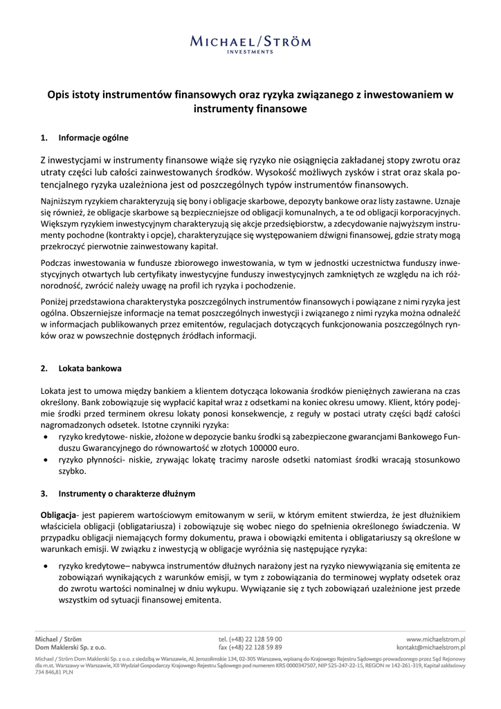 Opis istoty instrumentów finansowych oraz ryzyka związanego z inwestowaniem w instrumenty finansowe 1. Informacje ogólne Z inwestycjami w instrumenty finansowe wiąże się ryzyko nie osiągnięcia zakładanej stopy zwrotu oraz utraty części lub całości zainwestowanych środków. Wysokość możliwych zysków i strat oraz skala potencjalnego ryzyka uzależniona jest od poszczególnych typów instrumentów finansowych. Najniższym ryzykiem charakteryzują się bony i obligacje skarbowe, depozyty bankowe oraz listy zastawne. Uznaje się również, że obligacje skarbowe są bezpieczniejsze od obligacji komunalnych, a te od obligacji korporacyjnych. Większym ryzykiem inwestycyjnym charakteryzują się akcje przedsiębiorstw, a zdecydowanie najwyższym instrumenty pochodne (kontrakty i opcje), charakteryzujące się występowaniem dźwigni finansowej, gdzie straty mogą przekroczyć pierwotnie zainwestowany kapitał. Podczas inwestowania w fundusze zbiorowego inwestowania, w tym w jednostki uczestnictwa funduszy inwestycyjnych otwartych lub certyfikaty inwestycyjne funduszy inwestycyjnych zamkniętych ze względu na ich różnorodność, zwrócić należy uwagę na profil ich ryzyka i pochodzenie. Poniżej przedstawiona charakterystyka poszczególnych instrumentów finansowych i powiązane z nimi ryzyka jest ogólna. Obszerniejsze informacje na temat poszczególnych inwestycji i związanego z nimi ryzyka można odnaleźć w informacjach publikowanych przez emitentów, regulacjach dotyczących funkcjonowania poszczególnych rynków oraz w powszechnie dostępnych źródłach informacji. 2. Lokata bankowa Lokata jest to umowa między bankiem a klientem dotycząca lokowania środków pieniężnych zawierana na czas określony. Bank zobowiązuje się wypłacić kapitał wraz z odsetkami na koniec okresu umowy. Klient, który podejmie środki przed terminem okresu lokaty ponosi konsekwencje, z reguły w postaci utraty części bądź całości nagromadzonych odsetek. Istotne czynniki ryzyka: ryzyko kredytowe- niskie, złożone w depozycie banku środki są zabezpieczone gwarancjami Bankowego Funduszu Gwarancyjnego do równowartość w złotych 100000 euro. ryzyko płynności- niskie, zrywając lokatę tracimy narosłe odsetki natomiast środki wracają stosunkowo szybko. 3. Instrumenty o charakterze dłużnym Obligacja- jest papierem wartościowym emitowanym w serii, w którym emitent stwierdza, że jest dłużnikiem właściciela obligacji (obligatariusza) i zobowiązuje się wobec niego do spełnienia określonego świadczenia. W przypadku obligacji niemających formy dokumentu, prawa i obowiązki emitenta i obligatariuszy są określone w warunkach emisji. W związku z inwestycją w obligacje wyróżnia się następujące ryzyka: ryzyko kredytowe– nabywca instrumentów dłużnych narażony jest na ryzyko niewywiązania się emitenta ze zobowiązań wynikających z warunków emisji, w tym z zobowiązania do terminowej wypłaty odsetek oraz do zwrotu wartości nominalnej w dniu wykupu. Wywiązanie się z tych zobowiązań uzależnione jest przede wszystkim od sytuacji finansowej emitenta. ryzyko wartości rynkowej obligacji– związane jest z możliwym spadkiem wyceny instrumentów, co może być związane z sytuacją finansową Emitenta i zmiennymi makroekonomicznymi, popytem rynkowym na tę kategorię instrumentów. ryzyko stopy procentowej i inflacji- w przypadku obligacji o oprocentowaniu zmiennym zmiana stopy bazowej w konsekwencji może spowodować, że inwestor zrealizuje dochód niższy od oczekiwanego. W przypadku obligacji o oprocentowaniu stałym wzrost/spadek stóp procentowych jest czynnikiem negatywnie/pozytywnie wpływającym na ich wycenę. ryzyko płynności– nabywcy instrumentów dłużnych powinni liczyć się z ryzykiem, że ich sprzedaż przed terminem wykupu może być utrudniona, zaś cena sprzedaży może nie być satysfakcjonująca. Również mimo wprowadzenia obligacji/listów zastawnych na rynek Catalyst płynność może okazać się niesatysfakcjonująca. ryzyko przedterminowego wykupu- dotyczy obligacji zawierających opcję wcześniejszego wykupu, która pozwala emitentowi spłacić część lub całość emisji przed terminem wymagalności. Listy zastawne- dłużny papier wartościowy, imienny lub na okaziciela. Do emitowania listów zastawnych w Polsce uprawnione są tylko banki hipoteczne oraz Bank Gospodarstwa Krajowego w celu realizacji programów rządowych dotyczących wspierania rozwoju budownictwa mieszkaniowego. Wyróżniamy dwa rodzaje listów zastawnych: hipoteczne listy zastawne, których podstawą emisji są hipoteki na kredytowanych nieruchomościach oraz publiczne listy zastawne, których podstawą emisji są wierzytelności banku z tytułu kredytów dla sektora publicznego. W związku z inwestycją w listy zastawne wyróżnia się następujące ryzyka: 4. ryzyko kredytowe– niskie. ryzyko wartości rynkowej– związane jest z możliwym spadkiem wyceny instrumentu, zależnie od terminu do wykupu oraz mechanizmu oprocentowania. ryzyko stopy procentowej i inflacji- umiarkowane, zależne od terminu wykupu i mechanizmu oprocentowania. ryzyko płynności– umiarkowane, zależne od rynku obrotu i kształtowania się popytu i podaży. Instrumenty o charakterze udziałowym Akcje - udziałowy papier wartościowy emitowany przez spółkę akcyjną, stwierdzający ułamkową własność kapitału akcyjnego. Akcje zwykłe przyznają ich posiadaczowi prawa majątkowe, takie jak: prawo do udziału w rocznych zyskach wypracowanych przez spółkę akcyjną (dywidenda), prawo pierwszeństwa do objęcia akcji nowej emisji (prawo poboru), prawo do określonej części majątku spółki (w przypadku jej likwidacji), oraz prawa korporacyjne umożliwiające wpływ na funkcjonowanie spółki (np. prawo do uczestnictwa na Walnym Zgromadzeniu wraz z prawem głosu). Wyróżnia się następujące ryzyka związane z akcjami: ryzyko rynkowe– związane z sytuacj