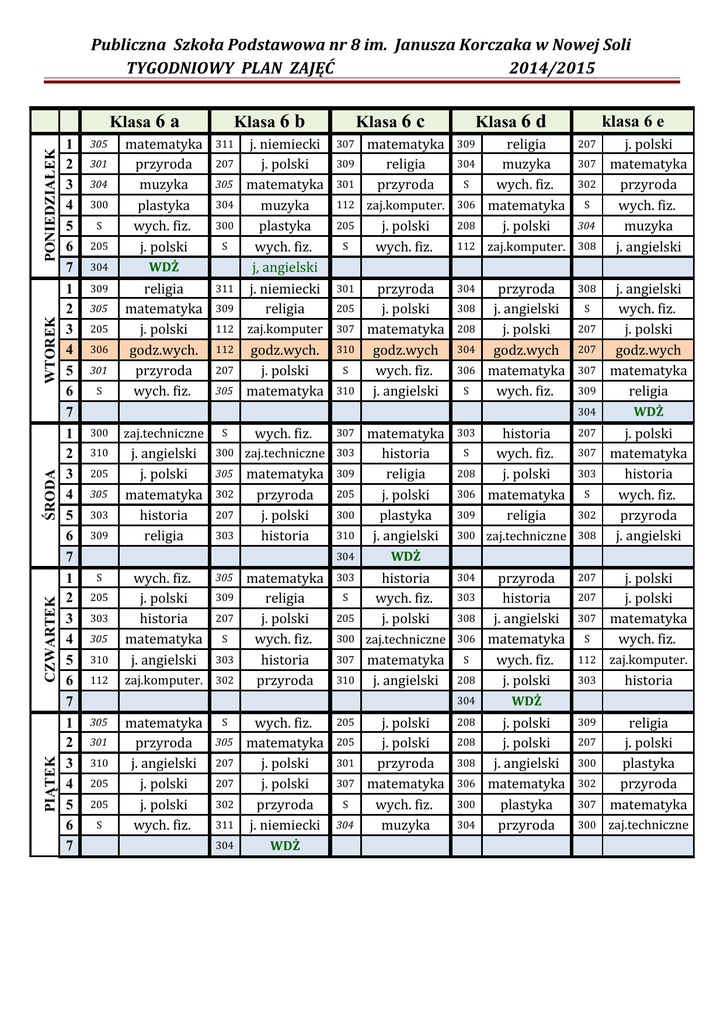 Publiczna Szkoła Podstawowa nr 8 im. Janusza Korczaka w Nowej Soli TYGODNIOWY PLAN ZAJĘĆ 2014/2015 PIĄTEK CZWARTEK ŚRODA WTOREK PONIEDZIAŁEK Klasa 6 a 1 2 3 4 5 6 7 1 2 3 4 5 6 7 1 2 3 4 5 6 7 1 2 3 4 5 6 7 1 2 3 4 5 6 7 205 matematyka przyroda muzyka plastyka wych. fiz. j. polski 304 WDŻ 309 religia matematyka j. polski godz.wych. przyroda wych. fiz. 305 301 304 300 S 305 205 306 301 S Klasa 6 b Klasa 6 c 307 309 j. niemiecki j. polski matematyka muzyka plastyka wych. fiz. j, angielski j. niemiecki religia 112 zaj.komputer 307 112 godz.wych. j. polski matematyka 310 311 207 305 304 300 S 311 207 305 301 matematyka religia przyroda 112 zaj.komputer. 306 309 205 S 301 205 S 310 300 zaj.techniczne S wych. fiz. 307 310 j. angielski j. polski matematyka historia religia 300 zaj.techniczne 303 305 matematyka przyroda j. polski historia 309 205 305 303 309 302 207 303 310 wych. fiz. j. polski historia matematyka j. angielski 112 zaj.komputer. 302 S 205 303 305 305 301 310 205 205 S matematyka przyroda j. angielski j. polski j. polski wych. fiz. 305 309 207 S 303 matematyka religia j. polski wych. fiz. historia przyroda 311 wych. fiz. matematyka j. polski j. polski przyroda j. niemiecki 304 WDŻ S 305 207 207 302 Klasa 6 d j. polski wych. fiz. 208 religia muzyka wych. fiz. matematyka j. polski 112 zaj.komputer. 308 j. polski matematyka przyroda wych. fiz. muzyka j. angielski przyroda j. polski matematyka godz.wych wych. fiz. j. angielski 304 przyroda j. angielski j. polski godz.wych matematyka wych. fiz. 309 j. angielski wych. fiz. j. polski godz.wych matematyka religia 304 WDŻ 207 j. polski matematyka historia wych. fiz. przyroda j. angielski 310 matematyka historia religia j. polski plastyka j. angielski 304 WDŻ 303 historia wych. fiz. j. polski 205 300 S 205 309 304 S 308 208 304 306 S 301 307 S 304 S 304 308 S 207 207 307 zaj.techniczne 308 304 208 przyroda historia j. angielski matematyka wych. fiz. j. polski 304 WDŻ 208 j. polski j. polski j. angielski matematyka plastyka przyroda 306 303 308 matematyka j. angielski 205 302 300 208 307 j. polski j. polski przyroda matematyka wych. fiz. muzyka 307 309 S zaj.techniczne 306 205 207 historia wych. fiz. j. polski matematyka religia 303 300 310 klasa 6 e S 208 308 306 300 304 307 303 S 302 S j. polski j. polski matematyka wych. fiz. 112 zaj.komputer. 303 historia 309 307 religia j. polski plastyka przyroda matematyka 300 zaj.techniczne 207 207 307 207 300 302