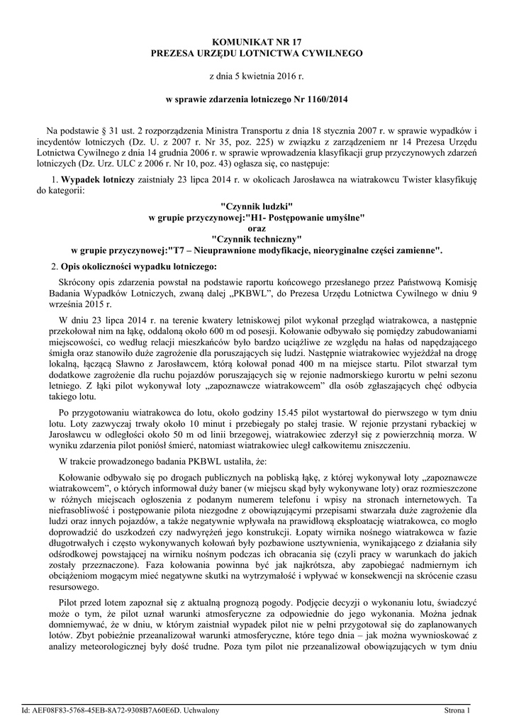 KOMUNIKAT NR 17 PREZESA URZĘDU LOTNICTWA CYWILNEGO z dnia 5 kwietnia 2016 r. w sprawie zdarzenia lotniczego Nr 1160/2014 Na podstawie § 31 ust. 2 rozporządzenia Ministra Transportu z dnia 18 stycznia 2007 r. w sprawie wypadków i incydentów lotniczych (Dz. U. z 2007 r. Nr 35, poz. 225) w związku z zarządzeniem nr 14 Prezesa Urzędu Lotnictwa Cywilnego z dnia 14 grudnia 2006 r. w sprawie wprowadzenia klasyfikacji grup przyczynowych zdarzeń lotniczych (Dz. Urz. ULC z 2006 r. Nr 10, poz. 43) ogłasza się, co następuje: 1. Wypadek lotniczy zaistniały 23 lipca 2014 r. w okolicach Jarosławca na wiatrakowcu Twister klasyfikuję do kategorii: "Czynnik ludzki" w grupie przyczynowej:"H1- Postępowanie umyślne" oraz "Czynnik techniczny" w grupie przyczynowej:"T7 – Nieuprawnione modyfikacje, nieoryginalne części zamienne". 2. Opis okoliczności wypadku lotniczego: Skrócony opis zdarzenia powstał na podstawie raportu końcowego przesłanego przez Państwową Komisję Badania Wypadków Lotniczych, zwaną dalej „PKBWL”, do Prezesa Urzędu Lotnictwa Cywilnego w dniu 9 września 2015 r. W dniu 23 lipca 2014 r. na terenie kwatery letniskowej pilot wykonał przegląd wiatrakowca, a następnie przekołował nim na łąkę, oddaloną około 600 m od posesji. Kołowanie odbywało się pomiędzy zabudowaniami miejscowości, co według relacji mieszkańców było bardzo uciążliwe ze względu na hałas od napędzającego śmigła oraz stanowiło duże zagrożenie dla poruszających się ludzi. Następnie wiatrakowiec wyjeżdżał na drogę lokalną, łączącą Sławno z Jarosławcem, którą kołował ponad 400 m na miejsce startu. Pilot stwarzał tym dodatkowe zagrożenie dla ruchu pojazdów poruszających się w rejonie nadmorskiego kurortu w pełni sezonu letniego. Z łąki pilot wykonywał loty „zapoznawcze wiatrakowcem” dla osób zgłaszających chęć odbycia takiego lotu. Po przygotowaniu wiatrakowca do lotu, około godziny 15.45 pilot wystartował do pierwszego w tym dniu lotu. Loty zazwyczaj trwały około 10 minut i przebiegały po stałej trasie. W rejonie przystani rybackiej w Jarosławcu w odległości około 50 m od linii brzegowej, wiatrakowiec zderzył się z powierzchnią morza. W wyniku zdarzenia pilot poniósł śmierć, natomiast wiatrakowiec uległ całkowitemu zniszczeniu. W trakcie prowadzonego badania PKBWL ustaliła, że: Kołowanie odbywało się po drogach publicznych na pobliską łąkę, z której wykonywał loty „zapoznawcze wiatrakowcem”, o których informował duży baner (w miejscu skąd były wykonywane loty) oraz rozmieszczone w różnych miejscach ogłoszenia z podanym numerem telefonu i wpisy na stronach internetowych. Ta niefrasobliwość i postępowanie pilota niezgodne z obowiązującymi przepisami stwarzała duże zagrożenie dla ludzi oraz innych pojazdów, a także negatywnie wpływała na prawidłową eksploatację wiatrakowca, co mogło doprowadzić do uszkodzeń czy nadwyrężeń jego konstrukcji. Łopaty wirnika nośnego wiatrakowca w fazie długotrwałych i często wykonywanych kołowań były pozbawione usztywnienia, wynikającego z działania siły odśrodkowej powstającej na wirniku nośnym podczas ich obracania się (czyli pracy w warunkach do jakich zostały przeznaczone). Faza kołowania powinna być jak najkrótsza, aby zapobiegać nadmiernym ich obciążeniom mogącym mieć negatywne skutki na wytrzymałość i wpływać w konsekwencji na skrócenie czasu resursowego. Pilot przed lotem zapoznał się z aktualną prognozą pogody. Podjęcie decyzji o wykonaniu lotu, świadczyć może o tym, że pilot uznał warunki atmosferyczne za odpowiednie do jego wykonania. Można jednak domniemywać, że w dniu, w którym zaistniał wypadek pilot nie w pełni przygotował się do zaplanowanych lotów. Zbyt pobieżnie przeanalizował warunki atmosferyczne, które tego dnia – jak można wywnioskować z analizy meteorologicznej były dość trudne. Poza tym pilot nie przeanalizował obowiązujących w tym dniu Id: AEF08F83-5768-45EB-8A72-9308B7A60E6D. Uchwalony Strona 1 ograniczeń w ruchu lotniczym, o czym może świadczyć fakt, że lot był wykonywany wewnątrz aktywnej strefy EPD53 (GND-2000 ft. alt) bez łączności radiowej i bez wiedzy służb ruchu lotniczego. W dniu 09.11.2011 r. do Urzędu Lotnictwa Cywilnego wpłynęło zgłoszenie, w którym budowniczowie wiatrakowca „Dragonfly” (pierwotna nazwa wiatrakowca) wnioskowali o objęcie nadzorem lotniczym prac i czynności związanych z jego budową oraz uznanie zdatności do lotu opisanej konstrukcji lotniczej. Przychylając się do wniosku budowniczych, Urząd Lotnictwa Cywilnego w grudniu 2011 r. postanowił objąć powyższe przedsięwzięcie nadzorem, o czym został powiadomiony w piśnie współbudowniczy-właściciel wiatrakowca. Zgłoszony do budowy wiatrakowiec został zaliczony do kategorii ultralekki i podkategorii U1. W ramach nadzoru nad budową statku powietrznego Urząd Lotnictwa Cywilnego nie wydał budowniczym wiatrakowca pozwolenia na wykonywanie lotów ani prób w locie. Budowniczowie, pomimo zarejestrowania wiatrakowca w ASC, nie wnioskowali o zakończenie lub rezygnację z nadzoru Urzędu Lotnictwa Cywilnego nad jego budową. Na etapie prowadzenia procesu badawczego właściciel statku powietrznego nie przedstawił PKBWL żadnych dokumentów związanych z budową, eksploatacją i zdatnością do lotu wiatrakowca. Brak Instrukcji Użytkowania w Locie, tym samym brak wiedzy pilota o podstawowych danych eksploatacyjnych wiatrakowca (ograniczeń ze względu na wiatr), zbagatelizowanie warunków atmosferycznych w rejonie samego wypadku (silne, chwilowe podmuchy powietrza ze zmiennych kierunków) mogły doprowadzić w trakcie wykonywania lotu (nie można wykluczyć ewolucji) do wyjścia płaszczyzny wirnika nośnego z dodatniego opływu i chwilowej utraty siły nośnej. Pilot gwałtownie zmieniając kierunek i wysokość lotu, co przy niekorzystnym, wiejącym z 