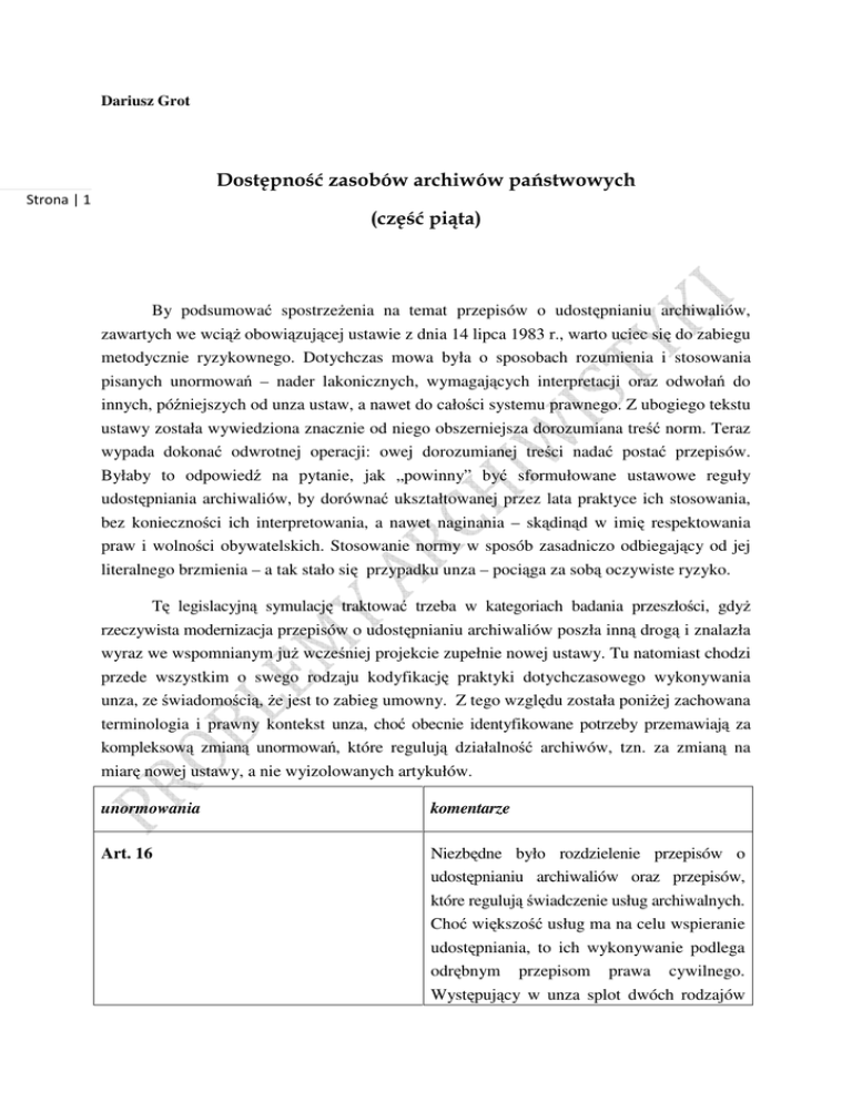 Dariusz Grot Dostępność zasobów archiwów państwowych Strona | 1 (część piąta) By podsumować spostrzeżenia na temat przepisów o udostępnianiu archiwaliów, zawartych we wciąż obowiązującej ustawie z dnia 14 lipca 1983 r., warto uciec się do zabiegu metodycznie ryzykownego. Dotychczas mowa była o sposobach rozumienia i stosowania pisanych unormowań – nader lakonicznych, wymagających interpretacji oraz odwołań do innych, późniejszych od unza ustaw, a nawet do całości systemu prawnego. Z ubogiego tekstu ustawy została wywiedziona znacznie od niego obszerniejsza dorozumiana treść norm. Teraz wypada dokonać odwrotnej operacji: owej dorozumianej treści nadać postać przepisów. Byłaby to odpowiedź na pytanie, jak „powinny” być sformułowane ustawowe reguły udostępniania archiwaliów, by dorównać ukształtowanej przez lata praktyce ich stosowania, bez konieczności ich interpretowania, a nawet naginania – skądinąd w imię respektowania praw i wolności obywatelskich. Stosowanie normy w sposób zasadniczo odbiegający od jej literalnego brzmienia – a tak stało się przypadku unza – pociąga za sobą oczywiste ryzyko. Tę legislacyjną symulację traktować trzeba w kategoriach badania przeszłości, gdyż rzeczywista modernizacja przepisów o udostępnianiu archiwaliów poszła inną drogą i znalazła wyraz we wspomnianym już wcześniej projekcie zupełnie nowej ustawy. Tu natomiast chodzi przede wszystkim o swego rodzaju kodyfikację praktyki dotychczasowego wykonywania unza, ze świadomością, że jest to zabieg umowny. Z tego względu została poniżej zachowana terminologia i prawny kontekst unza, choć obecnie identyfikowane potrzeby przemawiają za kompleksową zmianą unormowań, które regulują działalność archiwów, tzn. za zmianą na miarę nowej ustawy, a nie wyizolowanych artykułów. unormowania komentarze Art. 16 Niezbędne było rozdzielenie przepisów o udostępnianiu archiwaliów oraz przepisów, które regulują świadczenie usług archiwalnych. Choć większość usług ma na celu wspieranie udostępniania, to ich wykonywanie podlega odrębnym przepisom prawa cywilnego. Występujący w unza splot dwóch rodzajów unormowania komentarze wykonywanych przez archiwa czynności był wyłącznie rezultatem kontrowersyjnej techniki nowelizowania przepisów. Niniejszy artykuł dotyczy udostępniania archiwaliów Strona | 2 1. Każdy ma prawo dostępu do materiałów Obowiązujące przepisy nie dopuszczają archiwalnych stanowiących państwowy podmiotowych wyłączeń w dziedzinie dostępu zasób archiwalny, z zastrzeżeniem ust. 4 i 6 do państwowego zasobu archiwalnego, oraz 11. włącznie z zakazem – co jest źródłem najgorętszych sporów – stosowania kryterium niezbędnych kwalifikacji użytkownika. Katalog form udostępniania 2. Udostępnienie materiałów archiwalnych stanowiących państwowy zasób archiwalny może nastąpić poprzez: 1) umożliwienie osobie materiałów archiwalnych ma wagę definicji terminu „udostępnianie”. Polega ono na umożliwieniu określonej osobie korzystania z archiwaliów w zainteresowanej, zwanej dalej użytkownikiem, wglądu w oryginalne materiały archiwalne albo ich kopie w siedzibie co najmniej jednej z wyliczonych form, natomiast inne, nieuwzględnione tu formy korzystania nie stanowią udostępniania w rozumieniu ustawy. Wyraźnie wyłączono m.in. podmiotu państwowej sieci wydawanie uwierzytelnionych kopii archiwalnej (zwanego dalej (zwielokrotnień), gdyż zalicza się ono do podmiotem sieci archiwów), który odrębnej dziedziny urzędowych poświadczeń. te materiały przechowuje, Katalog obejmuje bezpośrednie udostępnianie 2) umożliwienie użytkownikowi wglądu w kopie materiałów archiwalnych, w szczególności mikrofilmy, w siedzibie podmiotu sieci archiwów innego niż podmiot, który te materiały oryginalnych archiwaliów, a także różne aspekty pośredniego komunikowania zawartej w archiwaliach informacji. Granica między udostępnianiem bezpośrednim i pośrednim jest umowna: do tej drugiej kategorii zaliczać można wszelkie formy udostępniania przechowuje, informacji w postaci innej niż ta, w jakiej 3) przekazanie użytkownikowi kopii, informacja stanowi składnik zasobu. odpisów lub wypisów ze Niemniej z prawnego punktu widzenia wskazanych przezeń materiałów archiwalnych, także przy użyciu systemów teleinformatycznych, bez ich uwierzytelnienia, zasadnicze znaczenie ma to, czy użytkownik otrzymał informację wyłącznie do wglądu, czy też uzyskał możność dysponowania jej wtórnymi zapisami – w postaci kopii unormowania Strona | 3 komentarze 4) przekazanie użytkownikowi (zwielokrotnień) archiwaliów albo wyników przetworzonych informacji o treści kwerendy przeprowadzonej przez archiwum. wskazanych przezeń materiałów W ust. 2 pkt. 1 pojawia się termin „podmiot archiwalnych, także przy użyciu państwowej sieci archiwalnej” (podmiot sieci systemów teleinformatycznych, bez archiwów). Ma to na celu jednoznaczne uwierzytelnienia tych informacji. ustalenie – czego brakuje w „prawdziwej” unza – jakie podmioty zostały zobowiązane do stosowania przepisów o udostępnianiu. W przyjętym tu brzmieniu: wszystkie, które legalnie przechowują państwowy zasób archiwalny, bez wykluczenia szczególnych uregulowań dla archiwów wyodrębnionych. 3. Materiały archiwalne stanowiące Przepis państwowy zasób archiwalny udostępniane są nieodpłatnie, z tym że wyszukiwanie i przetwarzanie przez podmiot sieci archiwów tych materiałów deklaruje zasadę nieodpłatności korzystania z archiwaliów, a zarazem ma na celu wyznaczenie jej granic, poprzez wskazanie tych czynności archiwum, które mają charakter usług, niestanowiących udostępniania, a albo zawartych w nich informacji, a także jedynie je wspierających. sporządzanie kopii, odpisów i wypisów z tych materiałów następuje, jeśli zostało podjęte na wnio