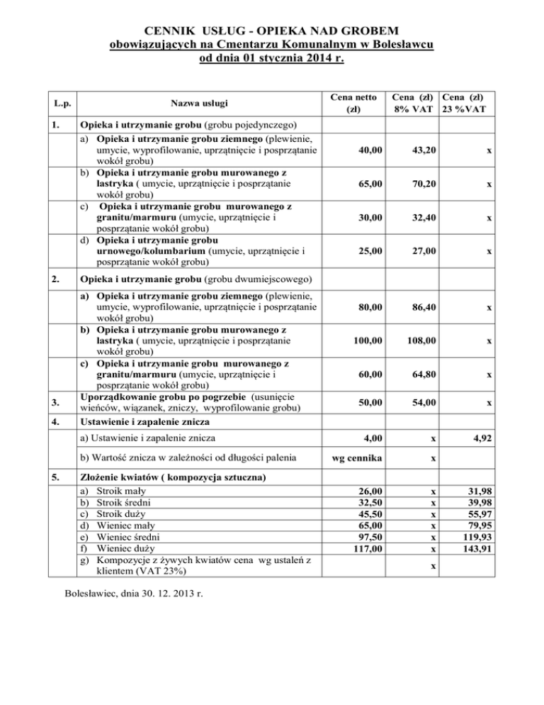CENNIK USŁUG - OPIEKA NAD GROBEM obowiązujących na Cmentarzu Komunalnym w Bolesławcu od dnia 01 stycznia 2014 r. L.p. 1. 2. 3. 4. Nazwa usługi Opieka i utrzymanie grobu (grobu pojedynczego) a) Opieka i utrzymanie grobu ziemnego (plewienie, umycie, wyprofilowanie, uprzątnięcie i posprzątanie wokół grobu) b) Opieka i utrzymanie grobu murowanego z lastryka ( umycie, uprzątnięcie i posprzątanie wokół grobu) c) Opieka i utrzymanie grobu murowanego z granitu/marmuru (umycie, uprzątnięcie i posprzątanie wokół grobu) d) Opieka i utrzymanie grobu urnowego/kolumbarium (umycie, uprzątnięcie i posprzątanie wokół grobu) Cena (zł) Cena (zł) 8% VAT 23 %VAT 40,00 43,20 x 65,00 70,20 x 30,00 32,40 x 25,00 27,00 x 80,00 86,40 x 100,00 108,00 x 60,00 64,80 x 50,00 54,00 x 4,00 x 4,92 wg cennika x 26,00 32,50 45,50 65,00 97,50 117,00 x x x x x x Opieka i utrzymanie grobu (grobu dwumiejscowego) a) Opieka i utrzymanie grobu ziemnego (plewienie, umycie, wyprofilowanie, uprzątnięcie i posprzątanie wokół grobu) b) Opieka i utrzymanie grobu murowanego z lastryka ( umycie, uprzątnięcie i posprzątanie wokół grobu) c) Opieka i utrzymanie grobu murowanego z granitu/marmuru (umycie, uprzątnięcie i posprzątanie wokół grobu) Uporządkowanie grobu po pogrzebie (usunięcie wieńców, wiązanek, zniczy, wyprofilowanie grobu) Ustawienie i zapalenie znicza a) Ustawienie i zapalenie znicza b) Wartość znicza w zależności od długości palenia 5. Cena netto (zł) Złożenie kwiatów ( kompozycja sztuczna) a) Stroik mały b) Stroik średni c) Stroik duży d) Wieniec mały e) Wieniec średni f) Wieniec duży g) Kompozycje z żywych kwiatów cena wg ustaleń z klientem (VAT 23%) Bolesławiec, dnia 30. 12. 2013 r. x 31,98 39,98 55,97 79,95 119,93 143,91