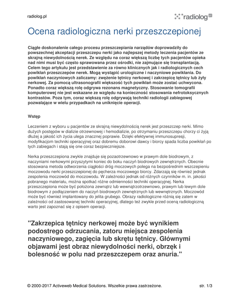 radiolog.pl Ocena radiologiczna nerki przeszczepionej Ciągłe doskonalenie całego procesu przeszczepiania narządów doprowadziły do powszechnej akceptacji przeszczepu nerki jako najlepszej metody leczenia pacjentów ze skrajną niewydolnością nerek. Ze względu na coraz większą liczbę tych pacjentów opieka nad nimi musi być często sprawowana przez ośrodki, nie zajmujące się transplantacją. Celem tego artykułu jest przedstawienie za równo klinicznych jak i radiologicznych cech powikłań przeszczepów nerek. Mogą wystąpić urologiczne i naczyniowe powikłania. Do powikłań naczyniowych zaliczamy: zwężenie tętnicy nerkowej i zakrzepicę tętnicy lub żyły nerkowej. Za pomocą ultrasonografii większość tych powikłań może zostać uchwycona. Ponadto coraz większą rolę odgrywa rezonans magnetyczny. Stosowanie tomografii komputerowej nie jest wskazane ze względu na konieczność stosowania nefrotoksycznych kontrastów. Poza tym, coraz większą rolę odgrywają techniki radiologii zabiegowej pozwalające w wielu przypadkach na uniknięcie operacji. Wstęp Leczeniem z wyboru u pacjentów ze skrajną niewydolnością nerek jest przeszczep nerki. Mimo dużych postępów w dializie otrzewnowej i hemodializie, po otrzymaniu przeszczepu chorzy ci żyją dłużej a jakość ich życia ulega znacznej poprawie. Dzięki efektywnej immunosupresji, modyfikacjom techniki operacyjnej oraz dobremu doborowi dawcy i biorcy spada liczba powikłań po tych zabiegach i stają się one coraz bezpieczniejsze. Nerka przeszczepiona zwykle znajduje się pozaotrzewnowo w prawym dole biodrowym, z naczyniami nerkowymi przyszytymi koniec do boku naczyń biodrowych zewnętrznych. Obecnie stosowana metoda odtworzenia ciągłości dróg moczowych polega na bezpośrednim wszczepieniu moczowodu nerki przeszczepionej do pęcherza moczowego biorcy. Zdarzają się również jednak zespolenia moczowód do moczowodu. W zależności jednak od różnych czynników m. in. jakości pobranego materiału, można spotkać różne odmienności techniki operacyjnej. Nerka przeszczepiona może być położona zewnątrz lub wewnątrzotrzewnowo, prawym lub lewym dole biodrowym z podłączeniem do naczyń biodrowych zewnętrznych lub wewnętrznych. Moczowód może być również implantowany do jelita grubego. Obrazy radiologiczne różnią się zatem w zależności od zastosowanej techniki operacyjnej, dlatego też zwykle przed oceną radiologiczną warto jest zapoznać się z opisem operacji. "Zakrzepica tętnicy nerkowej może być wynikiem podostrego odrzucania, zatoru miejsca zespolenia naczyniowego, zagięcia lub skrętu tętnicy. Głównymi objawami jest obraz niewydolności nerki, obrzęk i bolesność w polu nad przeszczepem oraz anuria." © 2000-2017 Activeweb Medical Solutions. Wszelkie prawa zastrzeżone. str. 1/3 radiolog.pl Powikłania urologiczne: Obecnie, kiedy najczęściej moczowód wszczepiany jest bezpośrednio do pęcherza moczowego, powikłania urologiczne występują u 4 - 8% chorych. Dawniej, kiedy stosowano zespolenia moczowodów, liczba tych powikłań była znacznie większa. Wyciek moczu i torbiele zawierające mocz są relatywnie rzadkim powikłaniem i zwykle występują w krótkim czasie po operacji. Wyciek moczu może występować w okolicy miedniczki nerkowej, moczowodu lub zespolenia moczowodowo - pęcherzowego. Wyciek moczu jest najczęściej związany z martwicą dróg moczowych, spowodowaną ich niedokrwieniem lub wzrostem ciśnienia moczu związanym z występującym poniżej zwężeniem. Wyciek na wysokości kielichów nerkowych występuje bardzo rzadko i jest wtórny do zawału segmentu nerki, najczęściej w wyniku podwiązania dodatkowej tętnicy nerkowej. Torbiele zawierające mocz najczęściej rozpoznawane są w czasie pierwszych dwóch tygodni po operacji i lokalizują się między nerką przeszczepioną a pęcherzem. Możliwe są też jednak mniej typowe lokalizacje, takie jak moszna czy udo. W ultrasonografii wyciek moczu przedstawia się jako dobrze odgraniczony bezechowy obszar, bez przegród, który powiększa się w dużym tempie. Pod kontrolą USG taki zbiornik może zostać zdrenowany. Duża zawartość kreatyniny w porównaniu do surowicy pozwala odróżnić wyciek moczu od zbiorników innych płynów, np. chłonki. Duże torbiele zawierające mocz mogą ulec rozdarciu i powodować powstanie moczowego wodobrzusza lub też ulec zakażeniu i zmieniać się w ropień. Pielografia jest badaniem koniecznym do rozpoznania miejsca wycieku moczu i do planowania interwencji operacyjnej. Niedrożność moczowodu pojawia się u około 2% operowanych i zwykle występuje w czasie pierwszych 6 miesięcy po operacji. Niedrożność może wystąpić na każdej wysokości, najczęściej jednak występuje w miejscu wszczepienia moczowodu do pęcherza moczowego. Ponieważ przeszczepiona nerka jest odnerwiona, pacjent nie będzie się skarżył na typowy kolkowy ból. Głównym objawem będzie wzrost poziomu kreatyniny w surowicy, co sprawia, że odróżnienie tego stanu od przewlekłego odrzucania nie jest proste. USG może służyć rozpoznaniu wodonercza, jednak włóknienie i obrzęk związany z odrzucaniem przeszczepu mogą hamować powstawanie wodonercza. Możliwe jest istotne zwężenie dróg moczowych z bardzo niewielkim lub bez poszerzenia nerki. Z drugiej strony poszerzenie układu kielichowo - miedniczkowego oraz moczowodu może wystąpić przy przepełnieniu pęcherza moczowego. W związku z tym, jeżeli badanie wykonane było przy pełnym pęcherzu, zawsze należy je powtórzyć po jego opróżnieniu. Także badanie scyntygraficzne może posłużyć rozpoznaniu zwężenia moczowodu. Najlepiej do oceny służą obrazy opóźnione, uzyskane 2-4 godziny po podaniu znacznika i pozwalają one odróżnić zwężony moczowód od poszerzonego, ale nie zwężonego moczowodu. Badanie urograficzne nie jest przydatne w ocenie miejsca zwężenia dróg moczowych. Przezskórna nef