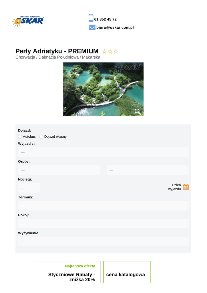 61 852 45 72 [email protected] Perły Adriatyku - PREMIUM Chorwacja / Dalmacja Południowa / Makarska Dojazd: Autobus Dojazd własny Wyjazd z: Osoby: Noclegi: Dzień wyjazdu Terminy: Pokój: Wyżywienie: Najtańsza oferta Styczniowe Rabaty zniżka 20% cena katalogowa Suma: do 6 marca 2017: 1399,00 zł do 6 marca 2017: 419,70 zł do 14 września 2017: 0,00 zł do 14 września 2017: 979,30 zł 1399,00 zł Suma: 1399,00 zł Opis oferty Miejscowość Przejazd autokarem PREMIUM autokar-premium-oskar-tablet-gniazdko-usb-wygodne-fotele Opinie Realizacja imprezy autokarami PREMIUM to gwarancja: transportu autokarami z roczników 2015 i 2016 produkcji Irizar i VDL Rozkład jazdy indywidualnego, multimedialnego systemu rozrywki - tablet z dotykowym ekranem w każdym zagłówku (filmy, gry, muzyka itp.). Możliwość podłączenia własnego nośnika danych poprzez wejście AUX lub USB. najwyższej klasy skórzanych lub półskórzanych foteli z możliwością regulacji oparcia lub/i zagłówka największej w Polsce przestrzeni między siedzeniami małej półki przed każdym siedzeniem + siateczki na czasopisma, książki czy telefon bezpłatnego dostępu do sieci WiFi na terenie Polski* gniazdek elektrycznych 230V wydajnej klimatyzacji sterowanej indywidualnie bogato wyposażonego barku udostępnionego w czasie jazdy WC na pokładzie autokaru Idealna i komfortowa podróż… ZAWSZE! Na ternie Polski GWARANTUJEMY, że wszystkie przejazdy realizowane są autobusem, busem lub samochodem osobowym. Zapewnimy komfortowy transport na każdym etapie podróży. Ważne: Autokar Premium jest autokarem docelowym. *jakość usług internetowych może różnić się w zależności od jakości sygnału TOUR GUIDE oprowadzanie z indywidualnym systemem nagłośnieniowym Mobilny zestaw audio: indywidulany zestaw słuchawkowy połączony bezprzewodowo z mikrofonem pilota/przewodnika. Zakwaterowanie Pokoje i apartamenty znajdujące się w prywatnych willach położonych w spokojnej dzielnicy Makarskiej – Zelence, w odległości 500-800 m od plaży. W okolicy znajdują się market, kawiarnie i stragany z owocami. Pokoje i apartamenty z łazienkami i dostępem do aneksu kuchennego (lodówka, kuchenka elektryczna, garnki, naczynia, sztućce). Należy zabrać własne ręczniki. Oferta obejmuje sprzątanie początkowe i końcowe, w trakcie pobytu sprzątanie we własnym zakresie. Większość pokoi posiada balkon lub taras. Restauracja znajduje się ok. 500 m od miejsca zakwaterowania. Idealne miejsce by móc zwiedzać i odpoczywać. Dostępne opcje zakwaterowania: pokój 2 - osobowy pokój 3 - osobowy apartament 4 - osobowy [2+2] dokwaterowanie (bez dopłat*) lub pokój 1 - osobowy (dopłata) Dostępne opcje wyżywienia wyżywienie BB: 6 śniadań wyżywienie HB: 6 śniadań + 6 obiadokolacji; możliwość dokonania rezerwacji w wersji HB lub + opcjonalna dopłata do obiadokolacji 50 €/os. (płatne u pilota w autokarze) Śniadania bufet: pieczywo, ser, szynka, jajka lub parówki itp., napoje: kawa, herbata, sok, obiadokolacje serwowane: zupa, danie główne, sałatka, deser, owoc; napoje do obiadokolacji dodatkowo płatne Pakiet KOMFORT gwarancja wyboru miejsca w autokarze napoje w autokarze w cenie (6 x do wyboru: kawa, herbata, zimny napój 0,2l) cena: 50 zł/os Pakiet PRESTIGE gwarancja wyboru miejsca w autokarze napoje w autokarze w cenie (6 x do wyboru: kawa, herbata, zimny napój 0,2l) pierwszeństwo wejścia na pokład autokaru nadbagaż 5 kg w cenie napoje do obiadokolacji (0,2l) cena: 100 zł/os Karta Dużej Rodziny www.oskar.com.pl/zalaczniki/karta_duzej_rodziny Warunki promocji FIRST MINUTE www.oskar.com.pl/zalaczniki/warunki_promocji Ubezpieczenie Warunki ubezpieczenia Bezpieczne Podróże Signal Iduna dokument do pobrania www.oskar.com.pl/zalaczniki/owu Warunki ubezpieczenia Kosztów Imprezy Turystycznej Signal Iduna dokument do pobrania www.oskar.com.pl/zalaczniki/owurg Turystyczny Fundusz Gwarancyjny W związku z powołaniem do życia w dniu 26.11.2016 Turystycznego Funduszu Gwarancyjnego każdy klient Biura Podróży Oskar zobowiązany jest do zapłaty kwoty w wysokości 10zł/os. przy każdorazowej rezerwacji imprezy turystycznej (obowiązuje od dnia 26.11.2016). Kwota przeznaczona na Turystyczny Fundusz Gwarancyjny zostanie automatycznie doliczona do wartości rezerwacji (w momencie jej dokonania). Wyjątkiem są imprezy turystyczne odbywające się w krajach posiadających granicę z Rzeczpospolitą Polską. Składka nie jest przychodem biura. Udogodnienia Klimatyzacja Regulowane fotele Tacki GPS Multimedia Nowoczesna flota Zawodowy kierowca Pasy bezpieczeństwa Toaleta w autokarze Podnóżki Wi-Fi Bez paszportu Premium Elite Tour guide Program ramowy DZIEŃ 1 (sobota) Wyjazd z Polski zgodnie z rozkładem jazdy autokarów. Przejazd przez Czechy, Austrię i Słowenię lub Czechy, Słowację, Węgry. (Trasa ok. 850 km) DZIEŃ 2 (niedziela) Przejazd do Plitvickiego Parku Narodowego – zespołu szesnastu tarasowo położonych jezior, połączonych wodospadami. Wodne krajobrazy ciągle zmieniają swoje barwy, czyniąc to miejsce niepowtarzalnym i wyjątkowym. W Parku, wśród bujnej roślinności, żyje wiele gatunków zwierząt. Przyjazd do Makarskiej w godzinach wieczornych. Obiadokolacja. Nocleg. (Trasa ok. 300 km) DZIEŃ 3 (poniedziałek) Śniadanie. Pobyt w M akarskiej – czas wolny na indywidualne zwiedzanie oraz kąpiele morskie i słoneczne. Obiadokolacja. Nocleg. DZIEŃ 4 (wtorek) Śniadanie. Przejazd do M edjugorje (Bośnia i Hercegowina). Według świadectwa sześciu młodych wierzących, od 24.06.1981 r., w parafii Medjugorje ukazuje się Błogosławiona Dziewica Maryja – w programie zwiedzanie Kościoła oraz wejście na Górę Objawień. Następnie przejazd do M ostaru – miasta, które zainteresuje Państwa specyficzną architekturą i atmosferą - z wpływami tureckimi. W programie wycieczki - zwiedzanie starego miasta, przepięknie położonego nad Neretwą, słynnego Starego Mostu