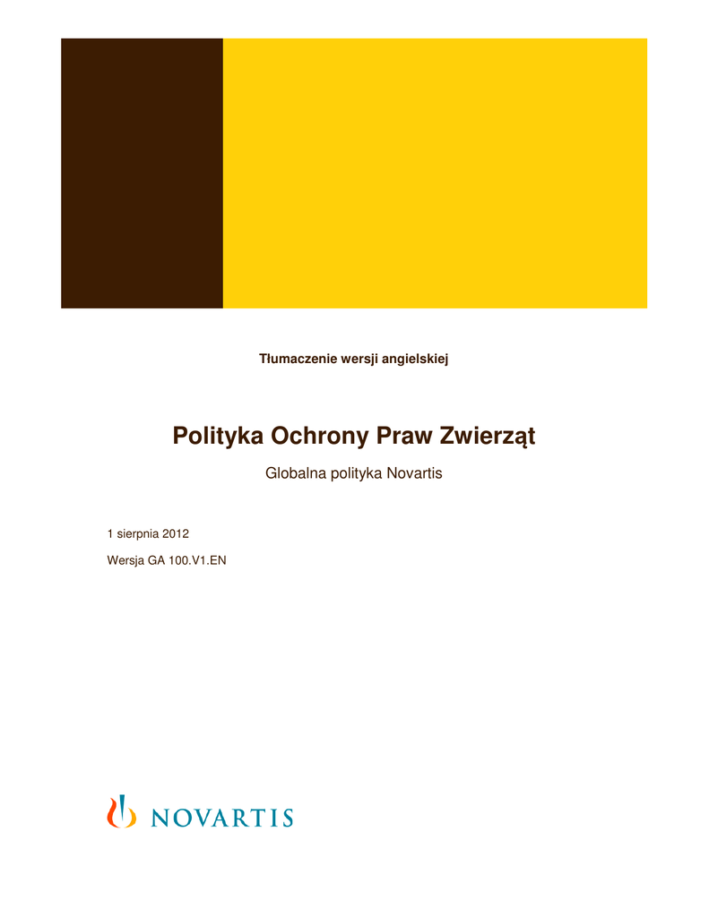 Tłumaczenie wersji angielskiej Polityka Ochrony Praw Zwierząt Globalna polityka Novartis 1 sierpnia 2012 Wersja GA 100.V1.EN 1. Wprowadzenie Novartis jest wielonarodowościową firmą opartą na badaniach, której celem jest odkrywanie, opracowywanie oraz skuteczne wprowadzanie na rynek innowacyjnych produktów umożliwiających zapobieganie chorobom lub ich leczenie, uśmierzanie bólu oraz poprawianie jakości życia. Novartis oferuje portfolio zróżnicowanych produktów, które w jak największym stopniu powinny sprostać tym potrzebom. Portfolio obejmuje następujące produkty, innowacyjne leki dla ludzi i zwierząt, produkty do pielęgnacji oczu, generyczne środki farmaceutyczne pozwalające na ograniczenie kosztów, produkty ochrony zdrowia dostępne bez recepty, szczepionki oraz narzędzia diagnostyczne. W celu umożliwienia odkrywania nowych terapii oraz zapewnienia ich skuteczności i bezpieczeństwa, działalność firmy Novartis opiera się na wykorzystaniu wiedzy, którą można zdobyć tylko w wyniku badań nad zwierzętami. W wielu przypadkach eksperymenty na zwierzętach są konieczne, po to by określić skuteczność terapeutyczną nowych sposobów leczenia wielu chorób dotykających ludzi i zwierząt. Ponadto, zgodnie z międzynarodowymi konwencjami oraz organami regulacyjnymi w zakresie ochrony zdrowia i/lub regulacjami rządowymi i wytycznymi w krajach, w których Novartis prowadzi działalność, wymagane jest wykonywanie badań na zwierzętach w celu określenia skuteczności oraz bezpieczeństwa produktów. 1.1. Cel Niniejsza polityka opisuje podstawowe zasady, wymagania oraz odpowiedzialność związaną z ochroną praw zwierząt w trakcie przeprowadzania badań na zwierzętach zainicjowanych przez Novartis oraz procedur, bez względu na to, czy są one prowadzone w firmie Novartis, czy przez Stronę Trzecią. Ta polityka opiera się na zobowiązaniu firmy Novartis do przeanalizowania, ograniczenia i zastąpienia zwierząt w badaniach oraz do utrzymania najwyższych standardów w zakresie ochrony praw zwierząt. Gwarantuje to również Kodeks postępowania, zgodnie z którym jesteśmy zobowiązani do ograniczenia dyskomfortu oraz bólu zwierząt wykorzystywanych w firmie Novartis oraz tam, gdzie to możliwe, do stosowania rozwiązań alternatywnych. Niniejsza polityka ustanawia zasady wdrażania tych zobowiązań. 1.2. Zakres i możliwość zastosowania Ta polityka jest obowiązująca dla wszystkich Oddziałów, Jednostek, Instytucji Novartis oraz Stron Trzecich, z którymi firma Novartis współpracuje w zakresie badań na zwierzętach oraz powiązanych procedur. Polityka zawiera ogólne zasady oraz wymagania, które ukierunkowują działania firmy w zakresie zapewnienia ochrony praw zwierzętom oraz odpowiedniego ich wykorzystywania. Polityka określa również zakres odpowiedzialności operacyjnej za jej wdrożenie na poziomie globalnym oraz lokalnym. Niniejsza Polityka opiera się na wąskiej wykładni przepisów obowiązujących w Stanach Zjednoczonych dotyczących ochrony praw zwierząt oraz jest zgodna z przepisami i kodeksami obowiązującymi w branży przemysłowej. Ma ona zostać wdrożona w krajach o mniej lub równie rygorystycznych przepisach oraz kodeksach postępowania 2 Globalna Polityka Novartis – Ochrona Praw Zwierząt w branży przemysłowej, w porównaniu z przepisami obowiązującymi w Stanach Zjednoczonych. W niektórych krajach regulacje prawne mogą być bardziej rygorystyczne niż zasady określone w niniejszej polityce. W takich przypadkach obowiązują bardziej zaostrzone przepisy. Dobre praktyki naukowe oraz etyczne wymagają, aby kwestie dotyczące ochrony praw zwierząt były w odpowiednim stopniu uwzględniane oraz szanowane. Ochrona praw zwierząt stanowi nadrzędną kwestię wobec dokładności oraz przydatności wszystkich badań naukowych. Niniejsza polityka wchodzi w życie z dniem 1 sierpnia 2012. Zastępuje Politykę w zakresie Ochrony Praw Zwierząt Novartis przyjętą w 2005 roku (zmodyfikowaną w 2007). Polityka musi zostać wdrożona przez wszystkie filie Novartis. 2. Zasady 2.1 Podstawowe zasady obowiązujące wszystkich pracowników I. Novartis, tam gdzie to możliwe, promuje ochronę praw zwierząt wykorzystywanych do badań i procedur. II. Novartis zobowiązuje się do przestrzegania obecnie obowiązujących wymagań o charakterze naukowym, prawnym, regulacyjnym oraz etycznym, wytycznych oraz polityk zapewniających ochronę praw zwierząt. Badania są wykonywane przez osoby, które (a) odbyły szkolenia i posiadają odpowiednie kwalifikacje w dziedzinie nauki, oraz z zachowaniem zasad odpowiedniej praktyki, postępowania ze zwierzętami oraz wykorzystywania ich, a także (b) posiadają doświadczenie w zakresie gatunków wykorzystywanych do badań. III. Novartis zobowiązuje się do przestrzegania zasad 3R (z ang. Reduce, Refine, Replace – Ograniczenia, Analizy, Zastąpienia), które aktywnie będzie promował. IV. Novartis gwarantuje, że zwierzęta wykorzystywane do wszystkich badań oraz procedur są traktowane z szacunkiem. Szczególną uwagę zwraca się na specyficzne potrzeby różnych gatunków (np. trzymanie zwierząt w grupach, wzbogacenie ich środowiska) określone przez lekarza weterynarii, który sprawuje bieżącą opiekę nad zwierzętami oraz kontrolę nad praktycznymi wytycznymi dotyczącymi zwierząt wykorzystywanych w eksperymentach. V. Novartis zobowiązuje się do podejmowania wszelkich niezbędnych środków, zgodnie z bieżącymi zaleceniami lekarza weterynarii, po to by zwierzęta doświadczały minimum dyskomfortu, stresu oraz/lub bólu. Tam gdzie to możliwe, metody sedacji, analgezji lub znieczulenia zostaną odpowiednio dostosowane. VI. Novartis zobowiązuje się do zamawiania oraz wykorzystywania tylko tych zwierząt, które są hodowane specjalnie do badań przez własne oddziały lub przez certyfikowanych hodowców, z wyjątkiem zwierząt gospodarskich oraz ryb, w przypadku kt