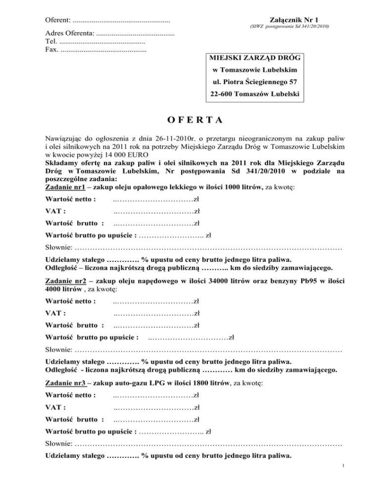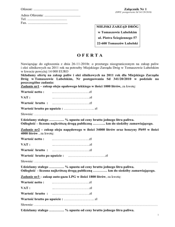 Oferent: ................................................... Załącznik Nr 1 (SIWZ postępowanie Sd 341/20/2010) Adres Oferenta: ......................................... Tel. ............................................. Fax. ............................................. MIEJSKI ZARZĄD DRÓG w Tomaszowie Lubelskim ul. Piotra Ściegiennego 57 22-600 Tomaszów Lubelski OFERTA Nawiązując do ogłoszenia z dnia 26-11-2010r. o przetargu nieograniczonym na zakup paliw i olei silnikowych na 2011 rok na potrzeby Miejskiego Zarządu Dróg w Tomaszowie Lubelskim w kwocie powyżej 14 000 EURO Składamy ofertę na zakup paliw i olei silnikowych na 2011 rok dla Miejskiego Zarządu Dróg w Tomaszowie Lubelskim, Nr postępowania Sd 341/20/2010 w podziale na poszczególne zadania: Zadanie nr1 – zakup oleju opałowego lekkiego w ilości 1000 litrów, za kwotę: Wartość netto : ..…………………………zł VAT : ..…………………………zł Wartość brutto : ..…………………………zł Wartość brutto po upuście : …………………….. zł Słownie: …………………………………………………………………………………………… Udzielamy stałego …………. % upustu od ceny brutto jednego litra paliwa. Odległość – liczona najkrótszą drogą publiczną ……….. km do siedziby zamawiającego. Zadanie nr2 – zakup oleju napędowego w ilości 34000 litrów oraz benzyny Pb95 w ilości 4000 litrów , za kwotę: Wartość netto : ..…………………………zł VAT : ..…………………………zł Wartość brutto : ..…………………………zł Wartość brutto po upuście : ..…………………………zł Słownie: …………………………………………………………………………………………… Udzielamy stałego …………. % upustu od ceny brutto jednego litra paliwa. Odległość - liczona najkrótszą drogą publiczną ………… km do siedziby zamawiającego. Zadanie nr3 – zakup auto-gazu LPG w ilości 1800 litrów, za kwotę: Wartość netto : ..…………………………zł VAT : ..…………………………zł Wartość brutto : ..…………………………zł Wartość brutto po upuście : …………………….. zł Słownie: …………………………………………………………………………………………… Udzielamy stałego …………. % upustu od ceny brutto jednego litra paliwa. 1 Odległość – liczona najkrótszą drogą publiczną ……….. km do siedziby zamawiającego. Zadanie nr4 – zakup olei silnikowych oraz innych olei smarnych w przewidywanych ilościach i określonych parametrach, za kwotę: Wartość netto : ..…………………………zł VAT : ..…………………………zł Wartość brutto : ..…………………………zł Wartość brutto po upuście : ..…………………………zł Słownie: …………………………………………………………………………………………… Udzielamy stałego …………. % upustu od ceny brutto jednego litra oleju. Oświadczenie dotyczące postanowień Specyfikacji Istotnych Warunków Zamówienia : 1. Oświadczamy, że zapoznaliśmy się ze Specyfikacją Istotnych Warunków Zamówienia oraz uzyskaliśmy niezbędne informacje potrzebne do przygotowania oferty i nie wnosimy żadnych zastrzeżeń; 2. Oświadczamy, że uważamy się za związanych niniejszą ofertą na czas wskazany w SIWZ; 3. Oświadczamy, że załączone do Specyfikacji Istotnych Warunków Zamówienia wymagania stawiane dostawcy oraz postanowienia umowy zostały przez nas zaakceptowane i zobowiązujemy się w przypadku wyboru naszej oferty do zawarcia umowy w miejscu i terminie wyznaczonym przez zamawiającego; 4. Podana w ofercie cena zawiera wszystkie koszty konieczne do prawidłowego zrealizowania przedmiotu zamówienia; 5. Ofertę niniejszą składamy na kolejno ........................ ponumerowanych stronach. Załącznikami do niniejszej oferty są: 1………………………………………….. 2………………………………………….. 3….………………………………………. 4……………………………………….…. 5.…………………………………………. 6………………………………………….. 7………………………………………….. 8………………………………………….. ………………………………………….. Czytelne podpisy osób uprawnionych do reprezentowania wykonawcy 2