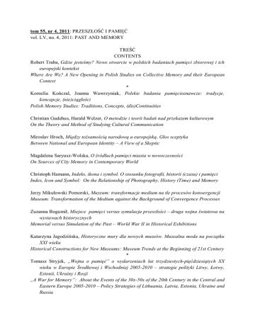 tom 55, nr 4, 2011: PRZESZŁOŚĆ I PAMIĘĆ vol. LV, no. 4, 2011: PAST AND MEMORY TREŚĆ CONTENTS Robert Traba, Gdzie jesteśmy? Nowe otwarcie w polskich badaniach pamięci zbiorowej i ich europejski kontekst Where Are We? A New Opening in Polish Studies on Collective Memory and their European Context * Kornelia Kończal, Joanna Wawrzyniak, Polskie badania pamięcioznawcze: tradycje, koncepcje, (nie)ciągłości Polish Memory Studies: Traditions, Concepts, (dis)Continuities Christian Gudehus, Harald Welzer, O metodzie i teorii badań nad przekazem kulturowym On the Theory and Method of Studying Cultural Communication Miroslav Hroch, Między tożsamością narodową a europejską. Głos sceptyka Between National and European Identity – A View of a Skeptic Magdalena Saryusz-Wolska, O źródłach pamięci miasta w nowoczesności On Sources of City Memory in Contemporary World Christoph Hamann, Indeks, ikona i symbol. O stosunku fotografii, historii (czasu) i pamięci Index, Icon and Symbol: On the Relationship of Photography, History (Time) and Memory Jerzy Mikułowski Pomorski, Muzeum: transformacje medium na tle procesów konwergencji Museum: Transformation of the Medium against the Background of Convergence Processes Zuzanna Bogumił, Miejsce pamięci versus symulacja przeszłości – druga wojna światowa na wystawach historycznych Memorial versus Simulation of the Past – World War II in Historical Exhibitions Katarzyna Jagodzińska, Historyczne mury dla nowych muzeów. Muzealna moda na początku XXI wieku Historical Constructions for New Museums: Museum Trends at the Beginning of 21st Century * Tomasz Stryjek, „Wojna o pamięć” o wydarzeniach lat trzydziestych-pięćdziesiątych XX wieku w Europie Środkowej i Wschodniej 2005-2010 – strategie polityki Litwy, Łotwy, Estonii, Ukrainy i Rosji „A War for Memory”: About the Events of the 30s-50s of the 20th Century in the Central and Eastern Europe 2005-2010 – Policy Strategies of Lithuania, Latvia, Estonia, Ukraine and Russia Joanna Michlic, „Pamiętanie dla upamiętnienia,” „pamiętanie dla korzyści” i „pamiętanie, żeby zapomnieć”: różne modele pamięci o Żydach i Zagładzie w postkomunistycznej Polsce Remembering to Remember,” “Remembering to Benefit,” “Remembering to Forget:” The Variety of Memories of Jews and the Holocaust in Post-Communist Poland Antoni Sułek, Żniwa „Złotych żniw Harvest of „Golden Harvest” Jakub Knyżewski, Konstruowanie historii regionu. Przeszłość i pamięć na łamach olsztyńskiej „Borussii” Constructing a Region’s History: Past and Memory in the Olsztyn „Borussia” Magazine * Modi Memorandi: Interdyscyplinarny Leksykon Terminów Pamięci Zbiorowej Modi Memorandi: An Interdisciplinary Lexicon of Collective Memory Terms * Omówienia, polemiki, recenzje Books Review and Discussoins Magdalena Saryusz-Wolska, Czy istnieje pamięć europejska? (rec.: M. Pakier, B. Strath, A European Memory? Conteasted Histories and Politics of Remembrance, New YorkOxford 2010) Maria Patrycja Wacławik, Kanadyjska lokalność miejsc pamięci? (rec.: James Opp, John C. Walsh [red.], Placing Memory and Remembering Place in Canada, Vancouver-Toronto 2010) Marcin Kula, Każdy ma prawo wybrać dowolnego mercedesa, byle był czarny? Aż tak to nie, ja tylko namawiam! (rec.: Bartosz Korzeniewski, Transformacja pamięci. Przewartościowania w pamięci przeszłości a wybrane aspekty dyskursu publicznego o przeszłości w Polsce po 1989 roku, Poznań 2010) Marcin Kula, Dzieje jako materiał dla socjologów (rec.: Łukasz Piotr Wojakowski, Państwo i zmiana społeczna w teoriach amerykańskiej socjologii historycznej, Kraków 2011) Tomasz Stryjek, Czy pamięć może uzdrawiać? Historia jako remedium na bolączki współczesnej Ukrainy (rec.: Jacek Nowak, Społeczne reguły pamiętania. Antropologia pamięci zbiorowej, Kraków 2011) ABSTRAKTY Kornelia Kończal, Joanna Wawrzyniak Artykuł jest krytycznym omówieniem historii i rozwoju polskich badań pamięcioznawczych w ostatnich latach. Autorzy przypominają rodowód tej dziedziny intelektualnej, poczynając od kategorii sformułowanych przez Stefana Czarnowskiego, Marcelego Handelsmana, Kazimierza Kelles-Kraussa, Ludwika Krzywickiego, Floriana Znanieckiego i Niny Assorodbraj-Kuli. Następnie opisują proces przedefiniowania i różnorodność zastosowania metodologicznych koncepcji pamięcioznawczych, 2 rozwijanych w polskich studiach historycznych, kulturowych, oraz w socjologii ilościowej i jakościowej. Autorzy podsumowują także główne tematy badawcze oraz dotychczas przeprowadzone projekty. Na koniec wskazują pewne braki w tej dziedzinie, związane z jej słabością instytucjonalną i selektywnym odbiorem zachodnich tradycji intelektualnych. S u m m a ry The article critically examines the history and recent developments of the Polish memory studies. The authors trace the genealogies of this intellectual field, starting with categories forged by Stefan Czarnowski, Marceli Handelsman, Kazimierz Kelles-Krauss, Ludwik Krzywicki, Florian Znaniecki, and Nina Assorodbraj-Kula. Then, they describe reformulations and varied methodological application of memory concepts within Polish historical studies, cultural studies, as well as within qualitative and quantitative sociology. They also summarize main research themes and projects conducted up to date. Finally, they point out to some flaws within the field having to do with its institutional weakness and the selective reception of western intellectual traditions. Key words / słowa kluczowe history of Polish social sciences and humanities ; historia polskich nauk społecznych i humanistycznych; memory studies / studia pamięcioznawcze; methodology / metodologia Christian Gudehus, Harald Welzer Kwestie związane z historią i konstruowaniem obrazów przeszłości zawsze miały znaczenie dla samoidentyfikacji jednostek, grup społecznych, instytucji władzy, państw, a zw