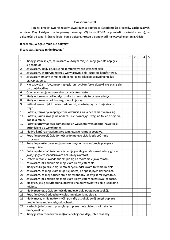 Kwestionariusz II Poniżej przedstawione zostały stwierdzenia dotyczące świadomości procesów zachodzących w ciele. Przy każdym zdaniu proszę zaznaczyć (X) tylko JEDNĄ odpowiedź (spośród sześciu), w zależności od tego, która najlepiej Panią opisuje. Proszę o odpowiedź na wszystkie pytania. Gdzie: 0 oznacza „w ogóle mnie nie dotyczy” 5 oznacza „ bardzo mnie dotyczy” 1 2 3 4 5 6 7 8 9 10 11 12 13 14 15 16 17 18 19 20 21 22 23 24 25 26 27 28 Kiedy jestem spięta, zauważam w którym miejscu mojego ciała napięcie się znajduje. Zauważam, kiedy czuje się niekomfortowo we własnym ciele. Zauważam, w którym miejscu we własnym ciele czuję się komfortowo. Zauważam zmiany w moim oddechu, takie jak jego spowolnienie lub przyspieszenie. Nie zauważam fizycznego napięcia ani dyskomfortu dopóki nie staną się bardziej dotkliwe. Odwracam moją uwagę od uczucia dyskomfortu. Kiedy odczuwam ból lub dyskomfort, staram się to przezwyciężyć. Kiedy odczuwam ból fizyczny, niepokoję się. Jeśli odczuwam jakikolwiek dyskomfort, martwię się, że dzieje się coś złego. Potrafię zauważyć nieprzyjemne odczucia z ciała bez zamartwiania się. Potrafię skupić uwagę na oddechu nie zwracając uwagi na to, co dzieje się dookoła mnie. Potrafię utrzymać świadomość moich wewnętrznych odczuć nawet jeśli dużo dzieje się wokół mnie. Kiedy z kimś rozmawiam zwracam, uwagę na moją postawę. Potrafię powrócić świadomością do mojego ciała kiedy coś mnie rozprasza. Potrafię przekierować moją uwagę z myślenia na odczucia płynące z mojego ciała. Potrafię utrzymać świadomość mojego całego ciała nawet wtedy gdy w jakiejś jego części odczuwam ból lub dyskomfort. Jestem w stanie świadomie skupić się na moim ciele jako całości. Zauważam jak zmienia się moje ciało kiedy jestem zła. Kiedy coś złego dzieje się w moim życiu, odczuwam to w moim ciele. Zauważam, że moje ciało czuje się inaczej po spokojnych doznaniach. Zauważam, że mój oddech staje się swobodny kiedy jest mi wygodnie. Zauważam jak zmienia się moje ciało kiedy jestem szczęśliwa i radosna. Kiedy czuje się przytłoczona, potrafię znaleźć wewnątrz siebie spokojne miejsce. Kiedy przenoszę świadomość do mojego ciała odczuwam spokój. Potrafię używać oddechu w celu zmniejszenia napięcia. Kiedy męczy mnie natłok myśli, potrafię uspokoić swój umysł poprzez skupienie na moim ciele/oddychaniu. Nasłuchuję informacji przesyłanych przez moje ciało o moim stanie emocjonalnym. Kiedy jestem zdenerwowana(zaniepokojona), daję sobie czas aby 0 1 2 3 4 5 rozpoznać jak czuje się moje ciało. 29 Słucham informacji wysyłanych przez moje ciało odnośnie tego jak mam postępować. 30 Czuję się we własnym ciele jak w domu 31 Czuje, że moje ciało to bezpieczne miejsce. 32 Ufam odczuciom mojego ciała. MAIA- Wielowymiarowa Ocena Świadomości Interoceptywnej Zauważanie 1-4 Nieodciąganie uwagi 5-7 Niemartwienie się 8-10 Regulacja uwagi 11-17 Świadomość emocjonalna 18-22 Samoregulacja 23-26 Wsłuchiwanie się we własne ciało 27-29 Zaufanie 30-32 Translation by Anna Kozieł" <[email protected]