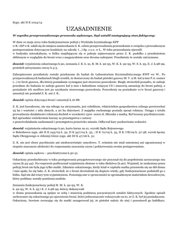 Sygn. akt II K 1024/13 UZASADNIENIE W wyniku przeprowadzonego przewodu sądowego, Sąd ustalił następujący stan faktyczny: W dniu 10 maja 2012 roku funkcjonariusze policji z Wydziału kryminalnego KPP w B. i KP w K. udali się do miejsca zamieszkania Z. K. celem przeprowadzenia przeszukania w związku z prowadzonym postepowaniem dotyczącym kradzieży na szkodę (...) Sp. z o.o. w Ł.. W toku przeszukania ujawnili w budynku mieszkalnym, w łóżku znajdującym się w pokoju zajmowanym przez Z. K. pudełko z przedmiotem zbliżonym w wyglądzie do broni wraz z magazynkiem oraz dwoma nabojami. Przedmioty te zostały zatrzymane. dowód: wyjaśnienia oskarżonego k.90, zeznania J. K. k. 91, R. M. k. 92-93, W. K. k. 92-93, W. S. k. 93, E. J. k.98-99, protokół zatrzymania rzeczy k.3-5. Zabezpieczone przedmioty zostały przekazane do badań do Laboratorium Kryminalistycznego KWP we W.. Po przeprowadzonych badaniach biegli orzekli, że dostarczony do badań pistolet gazowy M. V. 9 M. kal 9 mm P.A. numer (...) to broń gazowa, dla której posiadania wymagane jest stosowne pozwolenie. Biegły stwierdził ponadto, że naboje przesłane do badania to naboje gazowe kal 9 mm z ładunkiem rażącym CS i stanowią amunicję do broni palnej, a posiadanie ich możliwe jest po uzyskaniu stosownego pozwolenia. Pozwolenia na posiadanie w/w broni gazowej i amunicji nie posiadał Z. K. ani J. K.. dowód: opinia dotycząca broni i amunicji k.16-88. Z. K. jest kawalerem, nie ma nikogo na utrzymaniu, jest rolnikiem, właścicielem gospodarstwa rolnego powierzchni 25 ha i wartości 1 mln złotych, a 20 ha dzierżawi. Z majątku ruchomego posiada sprzęt rolniczy. Osiąga z tytułu prowadzenia działalności rolniczej dochód w wysokości 1500 -2000 zł. Mieszka z matką. Był leczony psychiatrycznie. Był uprzednio wielokrotnie karany za przestępstwa z ustawy o przeciwdziałaniu narkomanii i przestępstwa przeciwko mieniu. Odbywał kary pozbawienia wolności. dowód: wyjaśnienia oskarżonego k.90, karta karna 19-21, wyroki Sądu Rejonowego w Bolesławcu sygn. akt II K 243/03 k. 32, II K 347/04 k. 33, , II K 70/05 k. 35, II K 778/09 k. 37-38, wyrok łączny Sądu Okręgowego w Jeleniej Górze sygn. akt III K 47/06 k. 31; Z. K. nie jest chory psychicznie ani niedorozwinięty umysłowo. T. criminis nie miał zniesionej ani ograniczonej w stopniu znacznym zdolności do rozpoznania znaczenia czynu i pokierowania swoim postępowaniem. dowód: opinia sądowo – psychiatryczna k.50-51. Oskarżony przesłuchiwany w toku postępowania przygotowawczego nie przyznał się do popełnienia zarzucanego mu czynu (k.43-44). Na rozprawie podtrzymał wyjaśnienia złożone w toku śledztwa (k.90). Wyjaśnił, że znaleziona przez policję broń nie była jego tylko matki. Zdaniem oskarżonego, kiedy leżał w szpitalu matka przeniosła się na dół domu i tam spała, bo się bała. Z. K. stwierdził, że o broni dowiedział się dopiero wtedy, gdy funkcjonariusze podnieśli go z łóżka. Sąd nie dał wiary tym wyjaśnieniom. Pozostają one w sprzeczności ze zgromadzonym materiałem dowodowym, który poddany zostały poniższej analizie. Zeznania funkcjonariuszy policji R. M. k. 92-93, W. K. k. 92-93, W. S. k. 93 i E. J. k.98-99, którzy dokonywali w domu przeszukania są spójne ze sobą i stanowią podstawę poczynionych ustaleń faktycznych. Zgodnie opisali zachowanie się oskarżonego po ujawnieniu broni, które jednoznacznie wskazywało na to, że Z. K. był jej posiadaczem. Oskarżony, bowiem zwracając się do matki zasugerował jej, że pistolet należy do niej i pozostawił go kafelkarz. Wypowiedź tą skierował do matki zanim funkcjonariusze policji przesłuchali ją na osobności na wyżej podane okoliczności. J. K. trzymała się tej wersji podczas przesłuchania. Sąd dał wiarę zeznaniom funkcjonariuszy policji. Byli oni na miejscu ujawnienia broni i mieli możliwość na bieżąco zaobserwować zachowanie się oskarżonego i jego matki. Nie byli w konflikcie z oskarżonym, wykonywali rutynowe czynności na służbie. Sąd nie znalazł dowodów na podważenie ich zeznań. Za sprawstwem oskarżonego przemawia także fakt, że broń ujawniona została w łóżku w pokoju zajmowanym przez oskarżonego. Świadczą o tym przedmioty, które się tam znajdowały, np. ubrania i bielizna damska czy erotyczne akcesoria. Z. K. jest osobą o przeszłości kryminalnej. Był wielokrotnie karany, czego nie można przypisać jego matce – osobie w podeszłym wieku, kompletnie nie obeznanej w tematyce broni palnej. J. K. nie potrafiła jej opisać, posługiwać się nią, podać danych posadzkarza, który według niej tą broń pozostawił, ani też podać daty tego zdarzenia. Co więcej próby ustalenia jego danych okazały się niemożliwe, gdyż matka oskarżonego jak i on sam nie znali jego imienia i nazwiska oraz miejsca zamieszkania, a sąsiad, który go polecił już nie żyje. Nie było więc realnych możliwości aby zweryfikować twierdzenia oskarżonego i J. K.. Nie ma też racjonalnego wytłumaczenia po co fachowiec miałby świadcząc usługi przychodzić do zleceniodawcy z bronią gazową, nabojami i do tego pozostawić je u kobiety w podeszłym wieku na przechowanie. Zastanawiające jest także przy przyjęciu wersji oskarżonego dlaczego ten mężczyzna broni nie odebrał. J. K. jest osobą najbliższą dla oskarżonego, razem z nim mieszka, jest więc żywo zainteresowana pozytywnym zakończeniem sprawy. Nie ma też logicznego wytłumaczenia twierdzenie oskarżonego złożone na rozprawie, że był zaskoczony tym co znaleźli policjanci, gdyż wcześniej nie wiedział o broni. Gdyby tak było w istocie, to nasuwa się pytanie skąd Z. K. miałby wiedzę, którą przekazał przy funkcjonariuszach swojej matce, że broń jest jej i pozostawił ją posadzkarz. Kolejnym przykładem braku logiki w wyjaśnieniach oskarżonego są jego twierdzenia, że matka przeniosła się z góry budynku na dół, gdyż się 
