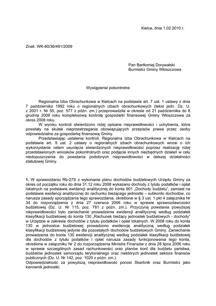 Kielce, dnia 1.02.2010 r. Znak: WK-60/36/491/2009 Pan Bartłomiej Dorywalski Burmistrz Gminy Włoszczowa Wystąpienie pokontrolne Regionalna Izba Obrachunkowa w Kielcach na podstawie art. 7 ust. 1 ustawy z dnia 7 października 1992 roku o regionalnych izbach obrachunkowych (tekst jedn. Dz. U. z 2001 r. Nr 55, poz. 577 z późn. zm.) przeprowadziła w okresie od 21 października do 8 grudnia 2009 roku kompleksową kontrolę gospodarki finansowej Gminy Włoszczowa za okres 2008 roku. W wyniku kontroli stwierdzono niżej opisane nieprawidłowości i uchybienia, które powstały na skutek nieprzestrzegania obowiązujących przepisów prawa przez osoby odpowiedzialne za gospodarkę finansową Gminy. Przedstawiając ustalenia kontroli, Regionalna Izba Obrachunkowa w Kielcach na podstawie art. 9 ust. 2 ustawy o regionalnych izbach obrachunkowych wnosi o ich wykorzystanie celem usunięcia stwierdzonych nieprawidłowości poprzez realizację niżej przedstawionych wniosków pokontrolnych oraz podjęcie innych niezbędnych działań w celu niedopuszczenia do powstania podobnych nieprawidłowości w dalszej działalności statutowej Gminy. 1. W sprawozdaniu Rb-27S z wykonania planu dochodów budżetowych Urzędu Gminy za okres od początku roku do dnia 31.12 roku 2008 wykazano dochody z tytułu podatków i opłat lokalnych na podstawie ewidencji analitycznej do konta 901 „Dochody budżetu”, zamiast na podstawie ewidencji analitycznej do rachunku bieżącego jednostki – subkonto dochodów, co narusza zasady sporządzania tego sprawozdania, określone w § 3 ust. 1 pkt 4 załącznika Nr 34 do rozporządzenia z dnia 27 czerwca 2006 roku w sprawie sprawozdawczości budżetowej (Dz. U. Nr 115, poz. 781 z późn. zm.). Przyczyną powstania powyższej nieprawidłowości było zaniechanie prowadzenia ewidencji analitycznej według podziałek klasyfikacji budżetowej do konta 130 „Rachunek bieżący jednostek budżetowych - dochody” w Urzędzie w zakresie dochodów z tytułu podatków i opłat lokalnych. W 2008 roku do konta 130 w jednostce budżetowej prowadzono ewidencję analityczną według podziałek klasyfikacji budżetowej jedynie dla pozostałych dochodów budżetowych Gminy. Zaniechanie prowadzenia do konta 130 ewidencji analitycznej według podziałek klasyfikacji budżetowej dla dochodów z tytułu podatków i opłat narusza zasady funkcjonowania tego konta, określone w załączniku Nr 2 do rozporządzenia Ministra Finansów z dnia 28 lipca 2006 roku w sprawie szczególnych zasad rachunkowości oraz planów kont dla budżetu państwa, budżetów jednostek samorządu terytorialnego oraz niektórych jednostek sektora finansów publicznych (Dz. U. Nr 142, poz. 1020 z późn. zm.). Odpowiedzialność za powyższą nieprawidłowość ponosi Skarbnik oraz Burmistrz jako kierownik jednostki. Wniosek pokontrolny Nr 1 1.1 Ewidencję analityczną do konta syntetycznego 130 dla dochodów z tytułu podatków i opłat realizowanych przez Urząd prowadzić według podziałek klasyfikacji budżetowej, stosownie do zasad funkcjonowania tego konta, określonych w załączniku Nr 2 do rozporządzenia Ministra Finansów z dnia 28 lipca 2006 roku w sprawie szczególnych zasad rachunkowości oraz planów kont dla budżetu państwa, budżetów jednostek samorządu terytorialnego oraz niektórych jednostek sektora finansów publicznych (Dz. U. Nr 142, poz. 1020 z późn. zm.). 1.2 W sprawozdaniu jednostkowym Rb-27S Urzędu wykazywać dane dotyczące dochodów z podatków i opłat na podstawie ewidencji analitycznej do rachunku bieżącego jednostki – subkonto dochodów, stosownie do § 3 ust. 1 pkt 4 załącznika Nr 34 do rozporządzenia z dnia 27 czerwca 2006 roku w sprawie sprawozdawczości budżetowej (Dz. U. Nr 115, poz. 781 z późn. zm.). 2. Nierzetelnie sporządzono sprawozdania Rb-27S i Rb-PDP za okres od początku roku do dnia31 grudnia 2008 roku, albowiem zaniżono skutki obniżenia górnych stawek podatku od środków transportowych o kwotę 20.983,18 zł, w tym od osób prawnych kwota 6.809,48 zł oraz od osób fizycznych kwota 14.173,70 zł. Przyczyną ujęcia skutków w nieprawidłowej wysokości było przyjęcie do obliczenia skutków, górnych stawek podatkowych w podatku od środków transportowych obowiązujących w 2007 roku, zamiast określonych na 2008 rok w obwieszczeniu Ministra Finansów z dnia 26 lipca 2007 roku (M. P. Nr 47, poz. 557). Stwierdzona nieprawidłowość narusza § 9 ust. 1 rozporządzenia Ministra Finansów z dnia 27 czerwca 2006 roku w sprawie sprawozdawczości budżetowej (Dz. U. Nr 115, poz. 781 z późn. zm.) oraz § 3 ust. 1 pkt 9, w związku z § 7 ust. 3 Instrukcji sporządzania sprawozdań budżetowych w zakresie budżetów jednostek samorządu terytorialnego stanowiącej załącznik nr 34 do tego rozporządzenia. Odpowiedzialność za powyższe ponosi Skarbnik i Burmistrz, którzy podpisali sprawozdania budżetowe. Wniosek pokontrolny Nr 2 2.1 W sporządzanych sprawozdaniach budżetowych wykazywać prawidłowe kwoty skutków finansowych z tytułu obniżenia górnych stawek podatku od środków transportowych, stosownie do § 9 ust. 1 rozporządzenia Ministra Finansów z dnia 27 czerwca 2006 rok w sprawie sprawozdawczości budżetowej (Dz. U. Nr 115, poz. 781 z późn. zm.) oraz § 3 ust. 1 pkt 9 i pkt 10, w związku z § 7 ust. 3 Instrukcji sporządzania sprawozdań budżetowych w zakresie budżetów jednostek samorządu terytorialnego stanowiącej załącznik nr 34 do tegoż rozporządzenia. 2.2 Sporządzić i przesłać w formie papierowej i elektronicznej do Regionalnej Izby Obrachunkowej w Kielcach prawidłowo sporządzone i oznaczone klauzulą „skorygowane” zbiorcze Rb-27S oraz sprawozdanie Rb-PDP za 2008 rok, w terminie 14 dni od daty otrzymania niniejszego wystąpienia. Do sprawozdań załączyć szczegółową informację o wielkościach dokonanych korekt i wskazać, że korekty zostały dokonane w wyniku kontroli przeprowadzonej przez RIO. 3. Nie