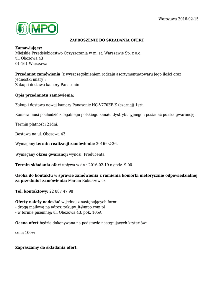 Warszawa 2016-02-15 ZAPROSZENIE DO SKŁADANIA OFERT Zamawiający: Miejskie Przedsiębiorstwo Oczyszczania w m. st. Warszawie Sp. z o.o. ul. Obozowa 43 01-161 Warszawa Przedmiot zamówienia (z wyszczególnieniem rodzaju asortymentu/towaru jego ilości oraz jednostki miary): Zakup i dostawa kamery Panasonic Opis przedmiotu zamówienia: Zakup i dostawa nowej kamery Panasonic HC-V770EP-K (czarnej) 1szt. Kamera musi pochodzić z legalnego polskiego kanału dystrybucyjnego i posiadać polska gwarancję. Termin płatności 21dni. Dostawa na ul. Obozową 43 Wymagany termin realizacji zamówienia: 2016-02-26. Wymagany okres gwarancji wynosi: Producenta Termin składania ofert upływa w dn.: 2016-02-19 o godz. 9:00 Osoba do kontaktu w sprawie zamówienia z ramienia komórki metorycznie odpowiedzialnej za przedmiot zamówienia: Marcin Rukuszewicz Tel. kontaktowy: 22 887 47 98 Oferty należy nadesłać w jednej z następujących form: - drogą mailową na adres: [email protected] - w formie pisemnej: ul. Obozowa 43, pok. 105A Ocena ofert będzie dokonywana na podstawie następujących kryteriów: cena 100% Zapraszamy do składania ofert.