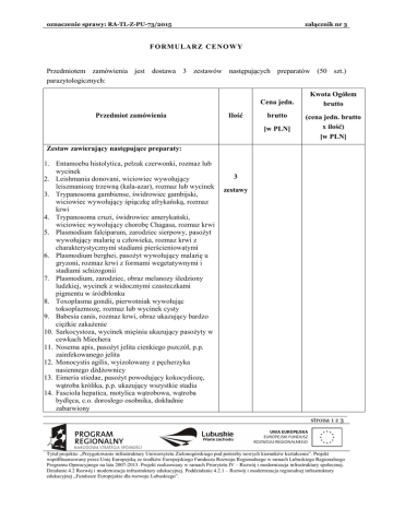 oznaczenie sprawy: RA-TL-Z-PU-73/2015 załącznik nr 3 FORMULARZ CENOWY Przedmiotem zamówienia jest dostawa 3 zestawów następujących preparatów (50 szt.) parazytologicznych: Cena jedn. Przedmiot zamówienia Ilość brutto [w PLN] Kwota Ogółem brutto (cena jedn. brutto x ilość) [w PLN] Zestaw zawierający następujące preparaty: 1. Entamoeba histolytica, pełzak czerwonki, rozmaz lub wycinek 2. Leishmania donovani, wiciowiec wywołujący leiszmaniozę trzewną (kala-azar), rozmaz lub wycinek 3. Trypanosoma gambiense, świdrowiec gambijski, wiciowiec wywołujący śpiączkę afrykańską, rozmaz krwi 4. Trypanosoma cruzi, świdrowiec amerykański, wiciowiec wywołujący chorobę Chagasa, rozmaz krwi 5. Plasmodium falciparum, zarodziec sierpowy, pasożyt wywołujący malarię u człowieka, rozmaz krwi z charakterystycznymi stadiami pierścieniowatymi 6. Plasmodium berghei, pasożyt wywołujący malarię u gryzoni, rozmaz krwi z formami wegetatywnymi i stadiami schizogonii 7. Plasmodium, zarodziec, obraz melanozy śledziony ludzkiej, wycinek z widocznymi czasteczkami pigmentu w śródbłonku 8. Toxoplasma gondii, pierwotniak wywołując toksoplazmozę, rozmaz lub wycinek cysty 9. Babesia canis, rozmaz krwi, obraz ukazujący bardzo ciężkie zakażenie 10. Sarkocystoza, wycinek mięśnia ukazujący pasożyty w cewkach Miechera 11. Nosema apis, pasożyt jelita cienkiego pszczół, p.p. zainfekowanego jelita 12. Monocystis agilis, wyizolowany z pęcherzyka nasiennego dżdżownicy 13. Eimeria stiedae, pasożyt powodujący kokocydiozę, wątroba królika, p.p. ukazujący wszystkie stadia 14. Fasciola hepatica, motylica wątrobowa, wątroba bydlęca, c.o. dorosłego osobnika, dokładnie zabarwiony 3 zestawy strona 1 z 3 Tytuł projektu: „Przygotowanie infrastruktury Uniwersytetu Zielonogórskiego pod potrzeby nowych kierunków kształcenia”. Projekt współfinansowany przez Unię Europejską ze środków Europejskiego Funduszu Rozwoju Regionalnego w ramach Lubuskiego Regionalnego Programu Operacyjnego na lata 2007-2013. Projekt realizowany w ramach Priorytetu IV – Rozwój i modernizacja infrastruktury społecznej. Działanie 4.2 Rozwój i modernizacja infrastruktury edukacyjnej. Poddziałanie 4.2.1 – Rozwój i modernizacja regionalnej infrastruktury edukacyjnej „Fundusze Europejskie dla rozwoju Lubuskiego”. oznaczenie sprawy: RA-TL-Z-PU-73/2015 załącznik nr 3 15. Fasciola hepatica, motylica wątrobowa, p.p. różych rejonów ciała 16. Fasciola hepatica, motylica wątrobowa, jaja, c.o. 17. Fasciola hepatica, motylica wątrobowa, dziwadełka, c.o. 18. Schistosoma mansoni, przywry wywołujące bilharcjozę, dorosły samiec lub samica, c.o. 19. Schistosoma mansoni, wycinek zakażonej wątroby ślimaka ukazujący stadia larwalne 20. Schistosoma mansoni, jaja z próbki odchodów 21. Tasiemiec, Taenia lub Moniezia, główka (skoleks), c.o. 22. Taenia pisiformis, psi tasiemiec, dojrzałe proglotydy, c.o 23. Taenia saginata, tasiemiec nieuzbrojony, proglotydy w różnych stadiach, p.p. 24. Taenia saginata, tasiemiec nieuzbrojony, jaja z próbki odchodów, c.o. 25. Hymenolepis nana,tasiemiec karłowaty, proglodyty, c.o. 26. Echinococcus granulosus, tasiemiec bąblowcowy, główka z cysty, c.o. z widocznymi haczykami 27. Echinococcus granulosus, tasiemiec bąlowcowy, ścianka cysty i wycinek główki 28. Ascaris lumbricoides, glista ludzka, dorosła samica, p.p. rejonu gonad 29. Ascaris lumbricoides, glista ludzka, dorosły samiec, p.p. rejonu gonad 30. Ascaris lumbricoides, glista ludzka, jaja z próbki odchodów, c.o. 31. Enterobius vermicularis (Oxyuris), owsik ludzki, dorosły okaz, c.o. 32. Trichinella spiralis, włosień kręty, mięsień z otorbionymi larwami, p.w 33. Ancylostoma (duodenale), tęgoryjec dwunastniczy, dorosły samiec lub samica, c.o. 34. Trichuris trichiura, włosogłówka, nicień, jaja z próbki odchodów, c.o. 35. Strongyloides stercoralis, węgorek jelitowy, larwa, c.o. 36. Heterakis spumosa, pasożyt jelitowy szczura, dorosły samiec lub samica 37. Ixodes sp., kleszcz, osobnik dorosły, c.o., nosiciel gorączki powrotnej i boreliozy 38. Dermanyssus gallinae, ptaszyniec kurzy, c.o. 39. Acarapis woodi, świdraczek pszczeli, varroa, roztocze pasożytnicze wywołujące warrozę u pszczół, c.o. 40. Sarcoptes scabiei (Acarus siro), świerzbowiec, strona 2 z 3 Tytuł projektu: „Przygotowanie infrastruktury Uniwersytetu Zielonogórskiego pod potrzeby nowych kierunków kształcenia”. Projekt współfinansowany przez Unię Europejską ze środków Europejskiego Funduszu Rozwoju Regionalnego w ramach Lubuskiego Regionalnego Programu Operacyjnego na lata 2007-2013. Projekt realizowany w ramach Priorytetu IV – Rozwój i modernizacja infrastruktury społecznej. Działanie 4.2 Rozwój i modernizacja infrastruktury edukacyjnej. Poddziałanie 4.2.1 – Rozwój i modernizacja regionalnej infrastruktury edukacyjnej „Fundusze Europejskie dla rozwoju Lubuskiego”. oznaczenie sprawy: RA-TL-Z-PU-73/2015 załącznik nr 3 wycinek zainfekowanej skóry z pasożytami 41. Stomoxys calcitrans, bolimuszka kleparka, aparat kłująco-ssący, c.o. 42. Anopheles, komar malaryczny, głowa i narządy gębowe samicy, c.o. 43. Culex pipiens, komar pospolity (brzęczący) głowa i narządy gębowe samicy, c.o. 44. Anopheles, Anopheles, komar malaryczny, larwa, c.o. 45. Culex pipiens, komar pospolity (brzęczący), larwa, c.o. 46. Culex pipiens, komar pospolity (brzęczący), poczwarka, c.o. 47. Cimex lectularius, pluskwa domowa, c.o. 48. Pediculus humanus, wesz ludzka, c.o. 49. Pediculus humanus, jaja przyczepione do włosa, c.o. 50. Ctenocephalus canis, pchła psia, dorosły okaz, c.o. ......................................................................................................................... P O D P I S W Y K O N A W C Y strona 3 z 3 Tytuł projektu: „Przygotowanie infrastruktury Uniwersytetu Zielonogórskiego pod potrzeby nowych kierunków kształcenia”. Projekt ws
