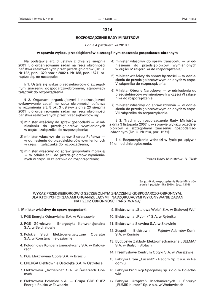 Dziennik Ustaw Nr 198 — 14408 — Poz. 1314 1314 ROZPORZĄDZENIE RADY MINISTRÓW z dnia 4 października 2010 r. w sprawie wykazu przedsiębiorców o szczególnym znaczeniu gospodarczo-obronnym Na podstawie art. 6 ustawy z dnia 23 sierpnia 2001 r. o organizowaniu zadań na rzecz obronności państwa realizowanych przez przedsiębiorców (Dz. U. Nr 122, poz. 1320 oraz z 2002 r. Nr 188, poz. 1571) zarządza się, co następuje: § 1. Ustala się wykaz przedsiębiorców o szczególnym znaczeniu gospodarczo-obronnym, stanowiący załącznik do rozporządzenia. § 2. Organami organizującymi i nadzorującymi wykonywanie zadań na rzecz obronności państwa w rozumieniu art. 5 pkt 3 ustawy z dnia 23 sierpnia 2001 r. o organizowaniu zadań na rzecz obronności państwa realizowanych przez przedsiębiorców są: 4) minister właściwy do spraw transportu — w odniesieniu do przedsiębiorców wymienionych w części IV załącznika do rozporządzenia; 5) minister właściwy do spraw łączności — w odniesieniu do przedsiębiorców wymienionych w części V załącznika do rozporządzenia; 6) Minister Obrony Narodowej — w odniesieniu do przedsiębiorców wymienionych w części VI załącznika do rozporządzenia; 7) minister właściwy do spraw zdrowia — w odniesieniu do przedsiębiorców wymienionych w części VII załącznika do rozporządzenia. 1) minister właściwy do spraw gospodarki — w odniesieniu do przedsiębiorców wymienionych w części I załącznika do rozporządzenia; § 3. Traci moc rozporządzenie Rady Ministrów z dnia 9 listopada 2007 r. w sprawie wykazu przedsiębiorców o szczególnym znaczeniu gospodarczo-obronnym (Dz. U. Nr 214, poz. 1571). 2) minister właściwy do spraw Skarbu Państwa — w odniesieniu do przedsiębiorców wymienionych w części II załącznika do rozporządzenia; § 4. Rozporządzenie wchodzi w życie po upływie 14 dni od dnia ogłoszenia. 3) minister właściwy do spraw gospodarki morskiej — w odniesieniu do przedsiębiorców wymienionych w części III załącznika do rozporządzenia; Prezes Rady Ministrów: D. Tusk Załącznik do rozporządzenia Rady Ministrów z dnia 4 października 2010 r. (poz. 1314) WYKAZ PRZEDSIĘBIORCÓW O SZCZEGÓLNYM ZNACZENIU GOSPODARCZO-OBRONNYM, DLA KTÓRYCH ORGANAMI ORGANIZUJĄCYMI I NADZORUJĄCYMI WYKONYWANIE ZADAŃ NA RZECZ OBRONNOŚCI PAŃSTWA SĄ: I. Minister właściwy do spraw gospodarki: 9. Elektrownia „Stalowa Wola” S.A. w Stalowej Woli 1. PGE Energia Odnawialna S.A. w Warszawie 10. Elektrownia „Rybnik” S.A. w Rybniku 2. PGE Górnictwo i Energetyka Konwencjonalna S.A. w Bełchatowie 11. Elektrownia Skawina S.A. w Skawinie 3. Polskie Sieci Elektroenergetyczne S.A. w Konstancinie-Jeziornie Operator 4. Południowy Koncern Energetyczny S.A. w Katowicach 5. PGE Elektrownia Opole S.A. w Brzeziu 12. Zespół Elektrowni S.A. w Koninie Pątnów-Adamów-Konin 13. Bydgoskie Zakłady Elektromechaniczne „BELMA” S.A. w Białych Błotach 14. Przemysłowe Centrum Optyki S.A. w Warszawie 6. ENERGA Elektrownie Ostrołęka S.A. w Ostrołęce 15. Fabryka Broni „Łucznik” - Radom Sp. z o.o. w Radomiu 7. Elektrownia „Kozienice” S.A. w Świerżach Górnych 16. Fabryka Produkcji Specjalnej Sp. z o.o. w Bolechowie 8. Elektrownia Połaniec S.A. — Grupa GDF SUEZ Energia Polska w Zawadzie 17. Fabryka Urządzeń Mechanicznych i Sprężyn „FUMiS-bumar” Sp. z o.o. w Wadowicach Dziennik Ustaw Nr 198 — 14409 — Poz. 1314 18. Huta Stalowa Wola S.A. w Stalowej Woli 46. Stocznia Remontowa „NAUTA” S.A. w Gdyni 19. Przedsiębiorstwo Sprzętu „MASKPOL” S.A. w Konieczkach 47. Przedsiębiorstwo Innowacyjno-Wdrożeniowe „WIFAMA-PREXER” Sp. z o.o. w Łodzi Ochronnego 20. Bumar Sp. z o.o. w Warszawie 48. Zakład Mechaniczny S.A. w Zabrzu 21. RADMOR S.A. w Gdyni „BUMAR-MIKULCZYCE” 22. DGT Sp. z o.o. w Straszynie 49. Kopalnia Węgla Brunatnego „Konin” w Kleczewie S.A. w Kleczewie 23. „TELDAT” Henryk Kruszyński i Marek Cichocki SPÓŁKA JAWNA w Bydgoszczy 50. Kopalnia Węgla Brunatnego „Adamów” S.A. w Turku 24. WB Electronics Sp. z o.o. w Ożarowie Mazowieckim 51. Jastrzębska Spółka Węglowa S.A. w Jastrzębiu-Zdroju 25. NITROERG S.A. w Bieruniu 52. Katowicki Holding Węglowy S.A. w Katowicach 26. EADS PZL „WARSZAWA-OKĘCIE” S.A. w Warszawie 53. Kompania Węglowa S.A. w Katowicach 54. Lubelski Węgiel „Bogdanka” S.A. w Bogdance 27. „STOMIL-POZNAŃ” S.A. w Poznaniu 55. Centrum Naukowo-Produkcyjne Elektroniki Profesjonalnej „RADWAR” S.A. w Warszawie 28. „LUBAWA” S.A. w Grudziądzu 29. „PZL-Wrocław” Sp. z o.o. we Wrocławiu 56. Instytut Lotnictwa w Warszawie 30. Zakłady Chemiczne „NITRO-CHEM” S.A. w Bydgoszczy 57. Przemysłowy Instytut Telekomunikacji S.A. w Warszawie 31. Zakłady Metalowe „DEZAMET” S.A. w Nowej Dębie 58. Instytut Przemysłu Organicznego w Warszawie 32. Zakłady Metalowe „MESKO” S.A. w Skarżysku-Kamiennej 59. Ośrodek Badawczo-Rozwojowy Centrum Techniki Morskiej S.A. w Gdyni 33. Zakłady Metalowe — Kraśnik Sp. z o.o. w Kraśniku 60. Ośrodek Badawczo-Rozwojowy Sprzętu Mechanicznego Sp. z o.o. w Tarnowie 34. Zakład Produkcji Specjalnej „GAMRAT” Sp. z o.o. w Jaśle 61. Ośrodek Badawczo-Rozwojowy Urządzeń Mechanicznych „OBRUM” w Gliwicach Sp. z o.o. w Gliwicach 35. Zakłady Produkcji Specjalnej Sp. z o.o. w Pionkach 36. Zakłady Mechaniczne „TARNÓW” S.A. w Tarnowie 37. Zakłady Mechaniczne „BUMAR-ŁABĘDY” S.A. w Gliwicach 38. Zakład Mechaniczny „PZL-Wola” w Siedlcach Sp. z o.o. w Siedlcach 62. Przedsiębiorstwo Handlu Zagranicznego CENZIN Sp. z o.o. w Warszawie II. Minister właściwy do spraw Skarbu Państwa: 1. PGE Dystrybucja S.A. w Lublinie 2. ENERGA-OPERATOR S.A. w Gdańsku 3. EnergiaPro S.A. we Wrocławiu 39. Wytwórnia Sprzętu Komunikacyjnego -RZESZÓW” S.A. w Rzeszowie „PZL- 4. RWE STOEN Operator Sp. z o.o. w Warszawie 40. Wytwórnia Sprzętu Komunikacyjnego -ŚWIDNIK” S.A. w Świdniku 