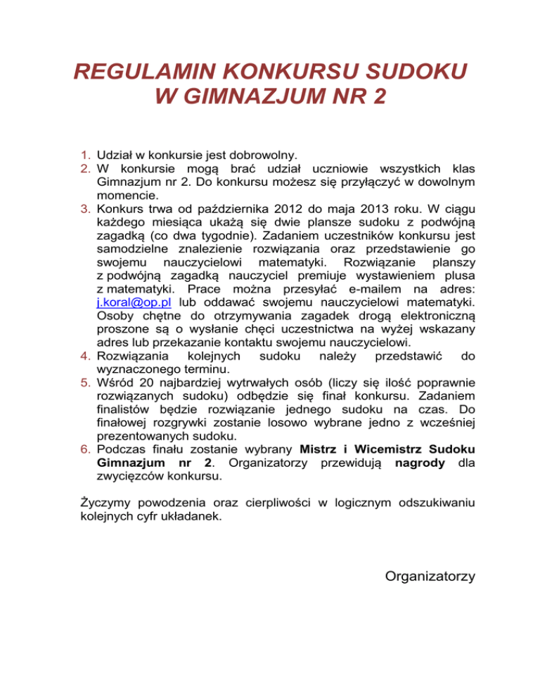REGULAMIN KONKURSU SUDOKU W GIMNAZJUM NR 2 1. Udział w konkursie jest dobrowolny. 2. W konkursie mogą brać udział uczniowie wszystkich klas Gimnazjum nr 2. Do konkursu możesz się przyłączyć w dowolnym momencie. 3. Konkurs trwa od października 2012 do maja 2013 roku. W ciągu każdego miesiąca ukażą się dwie plansze sudoku z podwójną zagadką (co dwa tygodnie). Zadaniem uczestników konkursu jest samodzielne znalezienie rozwiązania oraz przedstawienie go swojemu nauczycielowi matematyki. Rozwiązanie planszy z podwójną zagadką nauczyciel premiuje wystawieniem plusa z matematyki. Prace można przesyłać e-mailem na adres: [email protected] lub oddawać swojemu nauczycielowi matematyki. Osoby chętne do otrzymywania zagadek drogą elektroniczną proszone są o wysłanie chęci uczestnictwa na wyżej wskazany adres lub przekazanie kontaktu swojemu nauczycielowi. 4. Rozwiązania kolejnych sudoku należy przedstawić do wyznaczonego terminu. 5. Wśród 20 najbardziej wytrwałych osób (liczy się ilość poprawnie rozwiązanych sudoku) odbędzie się finał konkursu. Zadaniem finalistów będzie rozwiązanie jednego sudoku na czas. Do finałowej rozgrywki zostanie losowo wybrane jedno z wcześniej prezentowanych sudoku. 6. Podczas finału zostanie wybrany Mistrz i Wicemistrz Sudoku Gimnazjum nr 2. Organizatorzy przewidują nagrody dla zwycięzców konkursu. Życzymy powodzenia oraz cierpliwości w logicznym odszukiwaniu kolejnych cyfr układanek. Organizatorzy