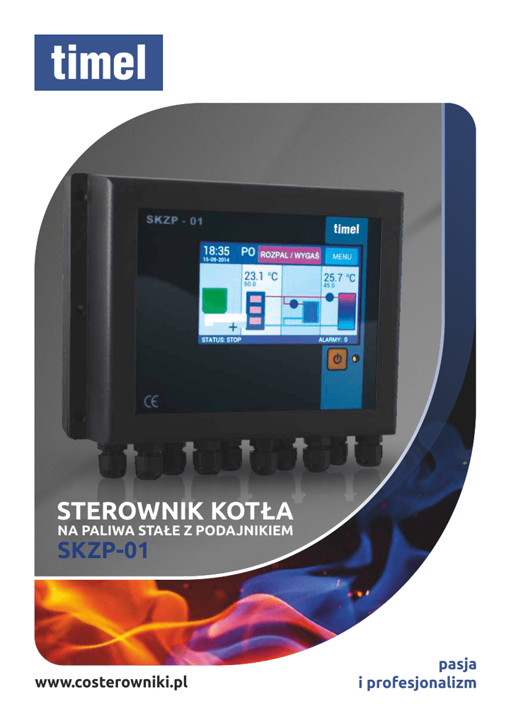 timel timel STEROWNIK KOTŁA NA PALIWA STAŁE Z PODAJNIKIEM SKZP-01 www.costerowniki.pl pasja i profesjonalizm Charakterystyka: Duży (4,3 cala), kolorowy wyświetlacz LCD sterowany dotykowo Intuicyjny w obsłudze Steruje kotłami na paliwa stałe (miał, ekogroszek, pellety, drewno) Steruje pompami CO i CWU Steruje pracą podajnika paliwa oraz wentylatora (płynnie w zakresie 0 -100%) Steruje zaworem mieszającym (3 lub 4 drogowym) Wbudowany regulator temperatury pokojowej Wbudowany regulator pogodowy Możliwość pracy z dowolnym uniwersalnym regulatorem pokojowym Wbudowany programator czasowy (tygodniowy) dla obwodu CO oraz CWU Wbudowane dwa tryby pracy: 1. Automatyczny (PID) – regulator sam dobiera ilość paliwa oraz powietrza dla uzyskania temperatury zadanej na kotle (płynna modulacja) 2. Interwałowy – ustawiany czas podawania , czas przerwy oraz siła nadmuchu Wbudowany licznik zużycia paliwa Pomiar temperatury spalin Możliwość podłączenia modułu GSM Ochrona podajnika przed przegrzaniem Wbudowane zabezpieczenie temperaturowe kotła (STB) Wizualizacja działania układu na wyświetlaczu (widok wszystkich parametrów) Zabezpieczenie pomp przed zastaniem (Anty Stop) Wykresy rejestrujące parametry spalania (temp. kotła i spalin, moc chwilowa) z ostatnich 12 godzin Zapis historii pracy kotła (140 zdarzeń) np. brak paliwa, wpisanie hasła instalatora, awaria czujnika Nieulotna pamięć ustawień Łatwy montaż Wielopoziomowe zabezpieczenie kotła przed przegrzaniem (czujniki elektroniczne + STB bimetaliczny) Możliwość aktualizacji oprogramowania sterownika timel [email protected] tel. 695 192 137 56 477 91 60 www.costerowniki.pl