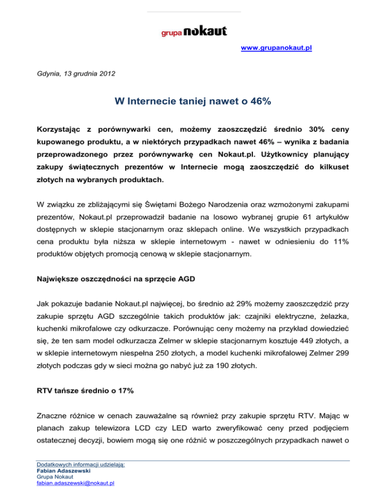 www.grupanokaut.pl Gdynia, 13 grudnia 2012 W Internecie taniej nawet o 46% Korzystając z porównywarki cen, możemy zaoszczędzić średnio 30% ceny kupowanego produktu, a w niektórych przypadkach nawet 46% – wynika z badania przeprowadzonego przez porównywarkę cen Nokaut.pl. Użytkownicy planujący zakupy świątecznych prezentów w Internecie mogą zaoszczędzić do kilkuset złotych na wybranych produktach. W związku ze zbliżającymi się Świętami Bożego Narodzenia oraz wzmożonymi zakupami prezentów, Nokaut.pl przeprowadził badanie na losowo wybranej grupie 61 artykułów dostępnych w sklepie stacjonarnym oraz sklepach online. We wszystkich przypadkach cena produktu była niższa w sklepie internetowym - nawet w odniesieniu do 11% produktów objętych promocją cenową w sklepie stacjonarnym. Największe oszczędności na sprzęcie AGD Jak pokazuje badanie Nokaut.pl najwięcej, bo średnio aż 29% możemy zaoszczędzić przy zakupie sprzętu AGD szczególnie takich produktów jak: czajniki elektryczne, żelazka, kuchenki mikrofalowe czy odkurzacze. Porównując ceny możemy na przykład dowiedzieć się, że ten sam model odkurzacza Zelmer w sklepie stacjonarnym kosztuje 449 złotych, a w sklepie internetowym niespełna 250 złotych, a model kuchenki mikrofalowej Zelmer 299 złotych podczas gdy w sieci można go nabyć już za 190 złotych. RTV tańsze średnio o 17% Znaczne różnice w cenach zauważalne są również przy zakupie sprzętu RTV. Mając w planach zakup telewizora LCD czy LED warto zweryfikować ceny przed podjęciem ostatecznej decyzji, bowiem mogą się one różnić w poszczególnych przypadkach nawet o Dodatkowych informacji udzielają: Fabian Adaszewski Grupa Nokaut [email protected] www.grupanokaut.pl 45%. Podobna sytuacja ma miejsce przy zakupie kina domowego – tu oszczędności sięgają średnio 19%. - Polacy coraz świadomiej planują zakupy i naturalnym jest dla nich korzystanie z możliwości internetowego porównywania cen. Sprawdzenie wielu ofert i wybranie najkorzystniejszej dla siebie to podstawa mądrych zakupów i to działanie wchodzi Polakom w krew. – mówi Fabian Adaszewski, PR Manager Grupy Nokaut, właściciela porównywarki cen Nokaut.pl. Od kilkudziesięciu do kilkuset złotych oszczędności na jednym zakupie Planując zakup prezentów świątecznych dla najbliższych warto przejrzeć oferty sklepów internetowych, w których możemy zaoszczędzić od kilkudziesięciu do kilkuset złotych. Różnice w cenie widoczne są szczególnie w przypadku produktów wybieranych na prezenty dla najmłodszych. Dla przykładu zakup lalki Monster High w sklepie internetowym pozwoli zaoszczędzić nawet do 50 złotych, co w tym przypadku stanowi ponad 30% ceny produktu w sklepie stacjonarnym. Do kilkudziesięciu złotych zaoszczędzić można również przy zakupie: domku piętrowego dla lalki Barbie, interaktywnego kucyka popularnej serii My Little Pony oraz dodatków do gry Auta 2. Ponad 20% różnice w cenach widać również przy zakupie takich produktów jak słuchawki audio, aparaty cyfrowe oraz szczególnie przy konsolach do gier Play Station 3 czy Xbox 360. W przypadku dwóch ostatnich, decydując się na ich zakup w sieci, możemy zaoszczędzić nawet około trzystu złotych. - Wyniki badania potwierdziły, a wręcz przerosły w tym roku nasze oczekiwania. Różnice w cenach - szczególnie sprzętu RTV i AGD między ofertami zwykłych a internetowych sklepów są bardzo duże. Wyniki naszego badania potwierdzają, że kupowanie w Internecie przekłada się na wymierne oszczędności w domowym budżecie – dodaje Fabian Adaszewski. – Mamy nadzieję, że tak znaczące różnice w cena skłonią wszystkich do korzystania z porównywarki cenowej przed dokonaniem zakupów. Oczywiście w Dodatkowych informacji udzielają: Fabian Adaszewski Grupa Nokaut [email protected] www.grupanokaut.pl Internecie, gdyż rynek offline od momentu pojawienia się handlu internetowego przegrywa już kolejny rok swój bój o cenę - podsumowuje. Porównanie dotyczyło produktów znalezionych w hipermarkecie zlokalizowanym na terenie Gdyni i ich cen na dzień 7 grudnia 2012 r. _________ Nokaut.pl - porównywarka cen wchodząca w skład Grupy Nokaut SA, jednego z liderów polskiego e-biznesu. Co miesiąc odwiedzana jest przez ponad 3 mln realnych użytkowników (Megapanel PBI/Gemius, lipiec 2012), a na jej stronach, we współpracy z ponad 3.500 e-sklepów, prezentowanych jest ponad 13 mln ofert. W styczniu 2012 roku w rankingu przygotowanym przez serwis Wirtualnemedia.pl, porównywarka Nokaut.pl zajęła pierwsze miejsce wśród polskich porównywarek cen. Grupa Nokaut SA jako jedyna firma z Polski została w 2010 roku wyróżniona w międzynarodowym rankingu Deloitte Technology Fast 50 CE w kategorii wschodzących gwiazd, jest również tegorocznym laureatem konkursu plasując się na 22. miejscu najszybciej rozwijających się firm Europy Śr-Wsch. Obroty sklepów internetowych wygenerowane w 2011 roku dzięki Nokaut.pl szacuje się na kwotę około 1 miliarda złotych. Dodatkowych informacji udzielają: Fabian Adaszewski Grupa Nokaut [email protected]