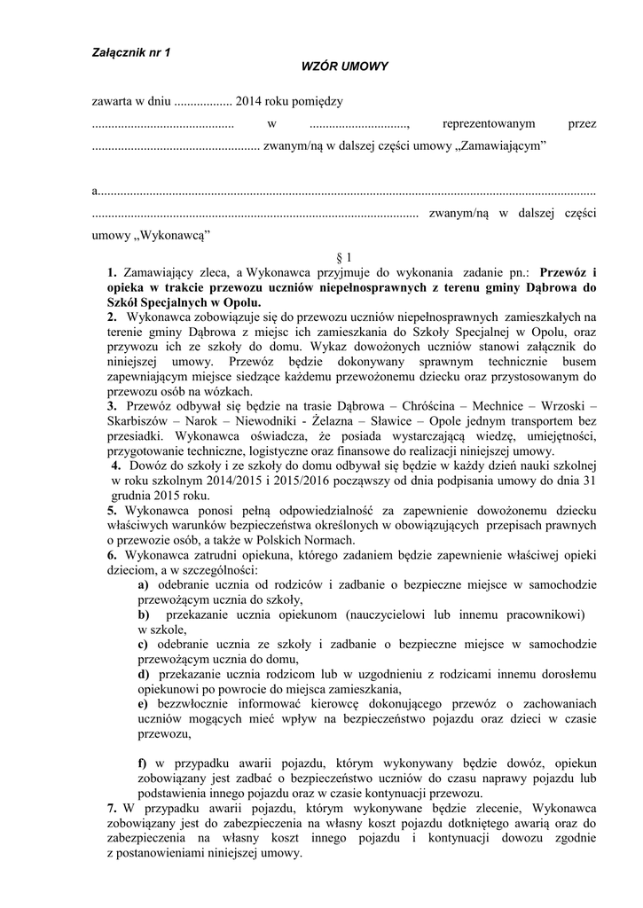 Załącznik nr 1 WZÓR UMOWY zawarta w dniu .................. 2014 roku pomiędzy ............................................ w .............................., reprezentowanym przez .................................................... zwanym/ną w dalszej części umowy „Zamawiającym” a.......................................................................................................................................................... ..................................................................................................... zwanym/ną w dalszej części umowy „Wykonawcą” §1 1. Zamawiający zleca, a Wykonawca przyjmuje do wykonania zadanie pn.: Przewóz i opieka w trakcie przewozu uczniów niepełnosprawnych z terenu gminy Dąbrowa do Szkół Specjalnych w Opolu. 2. Wykonawca zobowiązuje się do przewozu uczniów niepełnosprawnych zamieszkałych na terenie gminy Dąbrowa z miejsc ich zamieszkania do Szkoły Specjalnej w Opolu, oraz przywozu ich ze szkoły do domu. Wykaz dowożonych uczniów stanowi załącznik do niniejszej umowy. Przewóz będzie dokonywany sprawnym technicznie busem zapewniającym miejsce siedzące każdemu przewożonemu dziecku oraz przystosowanym do przewozu osób na wózkach. 3. Przewóz odbywał się będzie na trasie Dąbrowa – Chróścina – Mechnice – Wrzoski – Skarbiszów – Narok – Niewodniki - Żelazna – Sławice – Opole jednym transportem bez przesiadki. Wykonawca oświadcza, że posiada wystarczającą wiedzę, umiejętności, przygotowanie techniczne, logistyczne oraz finansowe do realizacji niniejszej umowy. 4. Dowóz do szkoły i ze szkoły do domu odbywał się będzie w każdy dzień nauki szkolnej w roku szkolnym 2014/2015 i 2015/2016 począwszy od dnia podpisania umowy do dnia 31 grudnia 2015 roku. 5. Wykonawca ponosi pełną odpowiedzialność za zapewnienie dowożonemu dziecku właściwych warunków bezpieczeństwa określonych w obowiązujących przepisach prawnych o przewozie osób, a także w Polskich Normach. 6. Wykonawca zatrudni opiekuna, którego zadaniem będzie zapewnienie właściwej opieki dzieciom, a w szczególności: a) odebranie ucznia od rodziców i zadbanie o bezpieczne miejsce w samochodzie przewożącym ucznia do szkoły, b) przekazanie ucznia opiekunom (nauczycielowi lub innemu pracownikowi) w szkole, c) odebranie ucznia ze szkoły i zadbanie o bezpieczne miejsce w samochodzie przewożącym ucznia do domu, d) przekazanie ucznia rodzicom lub w uzgodnieniu z rodzicami innemu dorosłemu opiekunowi po powrocie do miejsca zamieszkania, e) bezzwłocznie informować kierowcę dokonującego przewóz o zachowaniach uczniów mogących mieć wpływ na bezpieczeństwo pojazdu oraz dzieci w czasie przewozu, f) w przypadku awarii pojazdu, którym wykonywany będzie dowóz, opiekun zobowiązany jest zadbać o bezpieczeństwo uczniów do czasu naprawy pojazdu lub podstawienia innego pojazdu oraz w czasie kontynuacji przewozu. 7. W przypadku awarii pojazdu, którym wykonywane będzie zlecenie, Wykonawca zobowiązany jest do zabezpieczenia na własny koszt pojazdu dotkniętego awarią oraz do zabezpieczenia na własny koszt innego pojazdu i kontynuacji dowozu zgodnie z postanowieniami niniejszej umowy. 8. W przypadku innych nie przewidzianych zdarzeń, w szczególności złych warunków pogodowych, uniemożliwiających dowiezienie ucznia do szkoły, Wykonawca zobowiązany jest zawrócić i odwieźć ucznia do domu. 9. W przypadku innych nie przewidzianych zdarzeń, w szczególności złych warunków pogodowych, uniemożliwiających odwiezienie ucznia ze szkoły do domu, Wykonawca zobowiązany jest odwieźć ucznia inną, niż określona w ust. 2 trasą. Decyzję w tej sprawie podejmuje Wykonawca w uzgodnieniu z opiekunem ucznia. §2 1. Za wykonanie czynności przewidzianych w § 1 ust. 1 - 4 umowy Wykonawcy przysługuje wynagrodzenie w wysokości ………..zł netto plus 8 % podatku VAT tj……. zł. brutto ( słownie: …………….) za każdy dzień licząc 119 km x stawkę za 1 km ………zł brutto, w którym realizowany jest przewóz, z zastrzeżeniem ust. 2 i ust.3. 2. W przypadku, o którym mowa w § 1 ust. 8 wynagrodzenie za ten dzień będzie równe liczbie rzeczywiście przejechanych kilometrów pomnożonej przez stawkę …… zł brutto za każdy kilometr. 3. W przypadku, o którym mowa w § 1 ust. 9, wynagrodzenie za ten dzień zostanie powiększone ponad wymiar wskazany w ust. 1 o kwotę wynikającą z dodatkowo rzeczywiście przejechanych kilometrów, licząc za każdy dodatkowy kilometr stawkę …... zł brutto. 4. Wynagrodzenie będzie płatne z dołu w okresach miesięcznych za tę ilość dni, w których przewóz miał miejsce, w terminie 7 dni po przedłożeniu przez Wykonawcę rachunku/faktury wystawionego na rzecz Gminnego Zespołu Ekonomiczno – Administracyjnego Szkół i Przedszkoli w Dąbrowie, 49-120 Dąbrowa, ul. Ks. prof. J. Sztonyka 56 NIP 991 00 41 495. 5. Do rachunku należy dołączyć potwierdzoną przez szkołę listę dni dowozu uczniów do szkoły w danym miesiącu. 6. Wynagrodzenie będzie przekazywane na rachunek Wykonawcę w formie przelewu bankowego realizowanego przez Gminny Zespół Ekonomiczno – Administracyjny Szkół i Przedszkoli w Dąbrowie. 7. Do rachunku za miesiąc, w którym wystąpiły zdarzenia opisane w § 1 ust. 8 i 9 wykonawca zobowiązany jest dołączyć oświadczenie zawierające datę wystąpienia zdarzenia, miejsce i czynniki uniemożliwiające realizację dowozu na trasie określonej w § 1 ust. 3. §3 1. Jeżeli wykonawca z przyczyn leżących po jego stronie, nie dowiezie dzieci do szkoły, za każdy dzień nie wykonywania umowy zapłaci zamawiającemu karę umowną w wysokości równej wynagrodzeniu, o którym mowa w § 2 ust.1 umowy. 2. Zamawiający ma prawo potrącać kary umowne z wynagrodzenia Wykonawcy. 3. Jeśli kwota szkody przekracza kwotę kar umownych, Zamawiający ma prawo dochodzić odszkodowania uzupełniającego na za