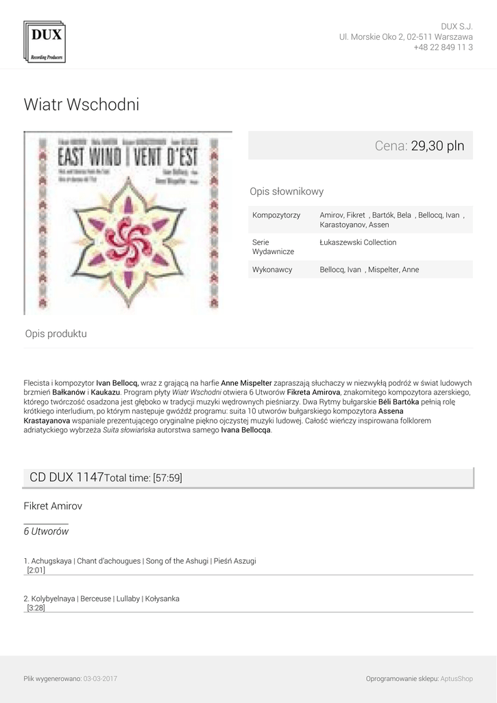 DUX S.J. Ul. Morskie Oko 2, 02-511 Warszawa +48 22 849 11 3 Wiatr Wschodni Cena: 29,30 pln Opis słownikowy Kompozytorzy Amirov, Fikret ∎, Bartók, Bela ∎, Bellocq, Ivan ∎, Karastoyanov, Assen ∎ Serie Wydawnicze Łukaszewski Collection Wykonawcy Bellocq, Ivan ∎, Mispelter, Anne ∎ Opis produktu Flecista i kompozytor Ivan Bellocq, wraz z grającą na harfie Anne Mispelter zapraszają słuchaczy w niezwykłą podróż w świat ludowych brzmień Bałkanów i Kaukazu. Program płyty Wiatr Wschodni otwiera 6 Utworów Fikreta Amirova, znakomitego kompozytora azerskiego, którego twórczość osadzona jest głęboko w tradycji muzyki wędrownych pieśniarzy. Dwa Rytmy bułgarskie Béli Bartóka pełnią rolę krótkiego interludium, po którym następuje gwóźdź programu: suita 10 utworów bułgarskiego kompozytora Assena Krastayanova wspaniale prezentującego oryginalne piękno ojczystej muzyki ludowej. Całość wieńczy inspirowana folklorem adriatyckiego wybrzeża Suita słowiańska autorstwa samego Ivana Bellocqa. CD DUX 1147Total time: [57:59] Fikret Amirov 6 Utworów 1. Achugskaya | Chant d’achougues | Song of the Ashugi | Pieśń Aszugi [2:01] 2. Kolybyelnaya | Berceuse | Lullaby | Kołysanka [3:28] Plik wygenerowano: 03-03-2017 Oprogramowanie sklepu: AptusShop DUX S.J. Ul. Morskie Oko 2, 02-511 Warszawa +48 22 849 11 3 3. Danse | Dance | Taniec [1:51] 4. V Gorakh Azerbaydyana | Dans les montagnes d’Azerbaidjan [2:34] 5. U Rodnika | Pres de la source | At the Spring | U źródła [2:01] 6. Nocturne | Nocturnal | Nokturn [2:22] Bela Bartók 2 Rytmy bułgarskie 7. Mikrokosmos 113 [1:07] 8. Mikrokosmos 115 [1:02] Assen Karastoyanov Utwory 9. ?pe??? | Prélude | Preludium [2:58] 10. Xa?????a | Haidouchka [1:44] 11. Exo | Écho | Echo [2:41] 12. ?pe?a??a | Fileuse | Spinning | Prządka [1:53] 13. ?e??a???a | Moisson | Harvest | Żniwa [2:38] 14. ???e???a | Ratchenitsa Plik wygenerowano: 03-03-2017 Oprogramowanie sklepu: AptusShop DUX S.J. Ul. Morskie Oko 2, 02-511 Warszawa +48 22 849 11 3 [2:02] 15. O??ap??a | Bergers | Shepherds | Pasterze [2:38] 16. ??e?e???a | Tresse | Braid | Plecionka [2:14] 17. ?p??????a | Berceuse | Lullaby | Kołysanka [2:52] 18. ?a????a | Daytchka [2:36] Ivan Bellocq Suita słowiańska op. 198 19. Slavic Suite I [2:21] 20. Slavic Suite II [2:01] 21. Slavic Suite III [3:09] 22. Slavic Suite IV [3:56] 23. Slavic Suite V [1:58] 24. Slavic Suite VI [3:53] Wykonawcy: Anne Mispelter /harfa/ Ivan Bellocq /flet/ Plik wygenerowano: 03-03-2017 Powered by TCPDF (www.tcpdf.org) Oprogramowanie sklepu: AptusShop