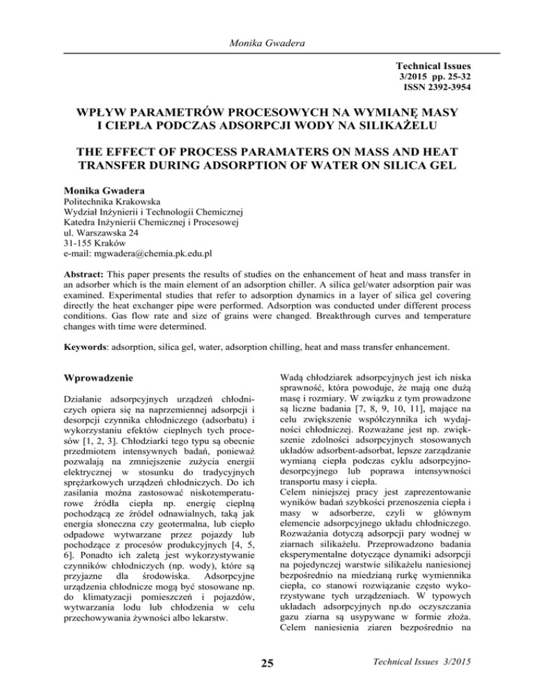 Monika Gwadera Technical Issues 3/2015 pp. 25-32 ISSN 2392-3954 WPŁYW PARAMETRÓW PROCESOWYCH NA WYMIANĘ MASY I CIEPŁA PODCZAS ADSORPCJI WODY NA SILIKAŻELU THE EFFECT OF PROCESS PARAMATERS ON MASS AND HEAT TRANSFER DURING ADSORPTION OF WATER ON SILICA GEL Monika Gwadera Politechnika Krakowska Wydział Inżynierii i Technologii Chemicznej Katedra Inżynierii Chemicznej i Procesowej ul. Warszawska 24 31-155 Kraków e-mail: [email protected] Abstract: This paper presents the results of studies on the enhancement of heat and mass transfer in an adsorber which is the main element of an adsorption chiller. A silica gel/water adsorption pair was examined. Experimental studies that refer to adsorption dynamics in a layer of silica gel covering directly the heat exchanger pipe were performed. Adsorption was conducted under different process conditions. Gas flow rate and size of grains were changed. Breakthrough curves and temperature changes with time were determined. Keywords: adsorption, silica gel, water, adsorption chilling, heat and mass transfer enhancement. Wadą chłodziarek adsorpcyjnych jest ich niska sprawność, która powoduje, że mają one dużą masę i rozmiary. W związku z tym prowadzone są liczne badania [7, 8, 9, 10, 11], mające na celu zwiększenie współczynnika ich wydajności chłodniczej. Rozważane jest np. zwiększenie zdolności adsorpcyjnych stosowanych układów adsorbent-adsorbat, lepsze zarządzanie wymianą ciepła podczas cyklu adsorpcyjnodesorpcyjnego lub poprawa intensywności transportu masy i ciepła. Celem niniejszej pracy jest zaprezentowanie wyników badań szybkości przenoszenia ciepła i masy w adsorberze, czyli w głównym elemencie adsorpcyjnego układu chłodniczego. Rozważania dotyczą adsorpcji pary wodnej w ziarnach silikażelu. Przeprowadzono badania eksperymentalne dotyczące dynamiki adsorpcji na pojedynczej warstwie silikażelu naniesionej bezpośrednio na miedzianą rurkę wymiennika ciepła, co stanowi rozwiązanie często wykorzystywane tych urządzeniach. W typowych układach adsorpcyjnych np.do oczyszczania gazu ziarna są usypywane w formie złoża. Celem naniesienia ziaren bezpośrednio na Wprowadzenie Działanie adsorpcyjnych urządzeń chłodniczych opiera się na naprzemiennej adsorpcji i desorpcji czynnika chłodniczego (adsorbatu) i wykorzystaniu efektów cieplnych tych procesów [1, 2, 3]. Chłodziarki tego typu są obecnie przedmiotem intensywnych badań, ponieważ pozwalają na zmniejszenie zużycia energii elektrycznej w stosunku do tradycyjnych sprężarkowych urządzeń chłodniczych. Do ich zasilania można zastosować niskotemperaturowe źródła ciepła np. energię cieplną pochodzącą ze źródeł odnawialnych, taką jak energia słoneczna czy geotermalna, lub ciepło odpadowe wytwarzane przez pojazdy lub pochodzące z procesów produkcyjnych [4, 5, 6]. Ponadto ich zaletą jest wykorzystywanie czynników chłodniczych (np. wody), które są przyjazne dla środowiska. Adsorpcyjne urządzenia chłodnicze mogą być stosowane np. do klimatyzacji pomieszczeń i pojazdów, wytwarzania lodu lub chłodzenia w celu przechowywania żywności albo lekarstw. 25 Technical Issues 3/2015 WPŁYW PARAMETRÓW PROCESOWYCH NA WYMIANĘ MASY I CIEPŁA PODCZAS … wewnątrz adsorbera. W trakcie pomiaru rurka z adsorbentem znajdowała się w rurze szklanej o podwójnych ściankach. Średnica wewnętrznej ścianki rury szklanej wynosiła 23 mm, a zewnętrznej – 50 mm. Przed wprowadzeniem do adsorbera, powietrze atmosferyczne było nawilżane w baterii płuczek. Gaz przepływał przez adsorber od dołu do góry. Podczas jego przepływu, następowała adsorpcja pary wodnej na ziarnach silikażelu. Natężenie przepływu gazu było ustalane regulatorem firmy Brooks Instruments model 4850, przy czym regulacja następowała przed nawilżaniem w baterii płuczek. Pomiar wilgotności względnej i temperatury gazu na wlocie i wylocie z układu był dokonywany za pomocą mierników firmy Michell Instruments model PC52. Do pomiaru temperatury w adsorberze w połowie wysokości rurki miedzianej zastosowano termoparę miedź-konstantan. Wymienione czujniki zostały podłączone do wielokanałowego rejestratora elektronicznego MPI-D firmy Metronic AKP. Urządzenie to zapisywało i archiwizowało odczyty czujników co 10 sekund. Do regeneracji adsorbentu wykorzystano suszarkę komorową z elektronicznym regulatorem temperatury frmy Wamed. Masę adsorbentu określano przy użyciu elektronicznej wagi analitycznej model AS/X wyprodukowanej przez firmę Radwag. powierzchnię rurki jest redukcja oporów przenoszenia ciepła wydzielanego podczas adsorpcji lub pochłanianego podczas desorpcji. Adsorbent nanoszono na rurkę przy użyciu kleju opartego na alkoholu poliwinylowym. Badania wskazują, że takie spoiwo nie pogarsza zdolności adsorpcyjnych silikażelu [12]. Adsorpcję prowadzono dla różnych warunków procesowych – zmieniano natężenie przepływu gazu i rozmiar ziaren adsorbentu. Wyznaczono krzywe przebicia oraz czasowe przebiegi temperatury podczas adsorpcji i temperatury gazu na wylocie z układu. Opis instalacji badawczej i metodyki pomiarów Badania eksperymentalne prowadzono w układzie przedstawionym na rys. 1a. Główny element stanowiska stanowił adsorber (kolumna szklana), w którym umieszczano rurkę miedzianą pokrytą ziarnami silikażelu. Ten element instalacji badawczej przedstawiono na rysunku 1b. Średnica zewnętrzna rurki miedzianej wynosiła 12 mm. Grubość ścianki była równa 1 mm. Długość rurki wynosiła 150 mm. Powierzchnia rurki była pokrywana warstwą ziaren silikażelu. Na obu końcach rurki pozostawiano około 10 mm metalu bez ziaren, w celu zamocowania elementu pomiarowego b) a) Rys. 1. Stanowisko badawcze: a) widok stanowiska; b) rura szklana z rurką miedzianą pokrytą warstwą silikażelu. Technical Issues 3/2015 26 Monika Gwadera Może zaadsorbować nawet 0,35–0,40 gramów wody na gram suchego sili