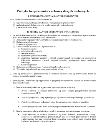 Polityka bezpieczeństwa ochrony danych osobowych I. CELE GROMADZENIA DANYCH OSOBOWYCH Cele, dla których szkoła zbiera dane osobowe, to: 1) rejestrowanie przebiegu zatrudnienia i wynagradzania pracowników, 2) realizacja zadań dydaktycznych, wychowawczych i opiekuńczych, 3) gromadzenie ofert pracy. II. ZBIORY DANYCH OSOBOWYCH W PLACÓWCE 1. W Szkole Podstawowej nr 3 w Gostyninie znajdują się następujące zbiory danych przetwarzane przez pracowników administracji oraz nauczycieli: 1) Akta osobowe pracowników zatrudnionych oraz pracowników zwolnionych. 2) Dokumentacja księgowa. 3) Dokumentacja płacowa. 4) Dane osobowe uczniów SP 3 zgromadzone w: a) księgach uczniów, b) dziennikach lekcyjnych, c) arkuszach ocen, d) teczkach wychowawców klas, e) dzienniku, teczkach uczniów i innych opracowaniach zawierających szczegółowe informacje dotyczące sytuacji bytowej uczniów, gromadzone przez pedagoga szkolnego, f) kartach czytelnika. 5) Dokumentacja Zakładowego Funduszu Świadczeń Socjalnych. 6) Wnioski o nagrody i odznaczenia pracowników szkoły. 2. Dane są gromadzone i przechowywane w systemie ręcznym oraz są przetwarzane także za pomocą systemu komputerowego. 3. Poszczególne stanowiska są wyposażone w programy komputerowe służące do przetwarzania danych osobowych. 1) Stanowiska wicedyrektorów wyposażone są w następujące programy: Arkusz Optivum, w którym przetwarza się dane służące przygotowaniu arkusza organizacyjnego SP 3, Plan lekcji Optivum, który wykorzystuje się do tworzenia tygodniowego planu lekcji, Świadectwa Optivum, wykorzystywany do przygotowania świadectw uczniów, Microsoft Office Excel i Word, w których przetwarza się dane pracowników i uczniów. 2) Stanowiska pracowników administracyjnych wyposażone są w następujące programy: Kadry Optivum, w którym przetwarza się dane osobowe pracowników szkoły. Stanowi on odzwierciedlenie pracowniczych akt osobowych prowadzone w formie elektronicznej. Zawiera wszystkie dane personalne pracowników oraz wszelkie dane kadrowe wynikające ze stosunku pracy. Sekretariat Optivum, który przetwarza wszelkie dane personalne dotyczące uczniów SP 3, Świadectwa Optivum wykorzystywany do drukowania świadectw uczniów, Płatnik w którym dokonuje się przetwarzania danych dotyczących składek pracowniczych przekazywanych do ZUS, PFRON który zawiera informacje o osobach niepełnosprawnych pracujących oraz uczących się w SP 3 Microsoft Office Excel i Word w których przetwarza się dane pracowników i uczniów 3) Stanowisko pracownika biblioteki wyposażone jest w program „MOL” w którym umieszczane i przetwarzane są dane uczniów oraz pracowników szkoły niezbędne do udostępniania księgozbioru stanowiącego własność SP 3. 4. Wszystkich pracowników, którzy będą gromadzić i przetwarzać dane osobowe zobowiązuje się do bezwzględnego przestrzegania przepisów ustawy przywołanej we wstępie oraz niniejszej instrukcji. III. PRZEKAZANIE INFORMACJI OSOBOM, KTÓRYCH DANE BĘDĄ ZBIERANE 1. Obowiązek informowania, a także uzyskania oświadczeń woli traktowany jest łącznie w stosunku do grup, których dane szkoła zbiera i przetwarza. 2. W wypadku pracowników obowiązek, o którym mowa w p. 1 uważa się za spełniony po podpisaniu druku oświadczenia woli – załącznik nr 5. 3. W wypadku uczniów i rodziców obowiązek, o którym mowa w p. 1 uważa się za spełniony po przyjęciu dziecka do szkoły. IV. OBOWIĄZKI PRACOWNIKÓW W ZAKRESIE OCHRONY DANYCH OSOBOWYCH 1. Pracownicy zatrudnieni w szkole (wicedyrektorzy, nauczyciele, kierownik gospodarczy, sekretarz szkoły) otrzymują upoważnienie do obsługi systemu ręcznego i informatycznego używanego do gromadzenia i przetwarzania danych osobowych w określonych zbiorach – Załącznik nr 4. 2. Pracownicy wymienieni w p. 1 zbierają i przetwarzają dane osobowe wyłącznie do realizacji celów wymienionych w rozdziale I. 3. Osoby mające upoważnienie do ręcznego i informatycznego przetwarzania danych osobowych zobowiązane są do zabezpieczenia danych przed ich udostępnieniem osobom nieupoważnionym, zabraniem przez osobę nieuprawnioną, uszkodzeniem lub zniszczeniem. 4. Osoby, o których mowa w p. 1, mające upoważnienie do przetwarzania danych w systemie informatycznym zobowiązane są do bezwzględnego przestrzegania instrukcji zawartej w Załączniku nr 2. 5. Udostępnienie danych osobowych przez pracowników może nastąpić wyłącznie na podstawie pisemnej zgody wydanej przez dyrektora szkoły. 6. Osoby, o których mowa w p. 1, mające dostęp do danych osobowych, obowiązane są do zachowania ich w tajemnicy. Obowiązek ten istnieje również po ustaniu zatrudnienia.