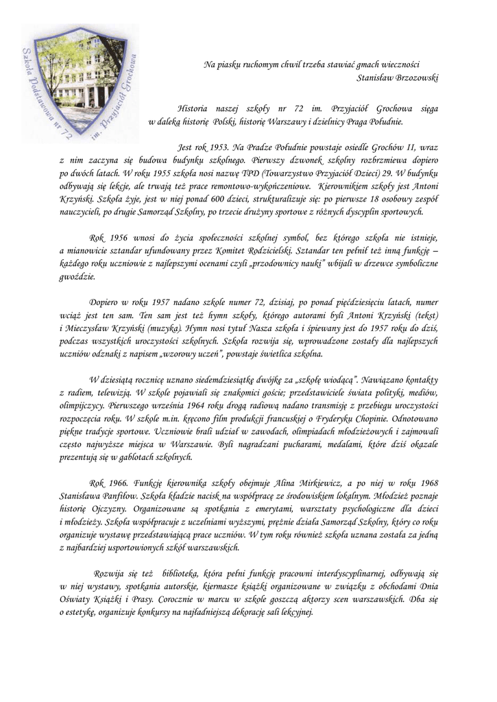 Na piasku ruchomym chwil trzeba stawiać gmach wieczności Stanisław Brzozowski Historia naszej szkoły nr 72 im. Przyjaciół Grochowa sięga w daleką historię Polski, historię Warszawy i dzielnicy Praga Południe. Jest rok 1953. Na Pradze Południe powstaje osiedle Grochów II, wraz z nim zaczyna się budowa budynku szkolnego. Pierwszy dzwonek szkolny rozbrzmiewa dopiero po dwóch latach. W roku 1955 szkoła nosi nazwę TPD (Towarzystwo Przyjaciół Dzieci) 29. W budynku odbywają się lekcje, ale trwają też prace remontowo-wykończeniowe. Kierownikiem szkoły jest Antoni Krzyński. Szkoła żyje, jest w niej ponad 600 dzieci, strukturalizuje się: po pierwsze 18 osobowy zespół nauczycieli, po drugie Samorząd Szkolny, po trzecie drużyny sportowe z różnych dyscyplin sportowych. Rok 1956 wnosi do życia społeczności szkolnej symbol, bez którego szkoła nie istnieje, a mianowicie sztandar ufundowany przez Komitet Rodzicielski. Sztandar ten pełnił też inną funkcję – każdego roku uczniowie z najlepszymi ocenami czyli „przodownicy nauki” wbijali w drzewce symboliczne gwoździe. Dopiero w roku 1957 nadano szkole numer 72, dzisiaj, po ponad pięćdziesięciu latach, numer wciąż jest ten sam. Ten sam jest też hymn szkoły, którego autorami byli Antoni Krzyński (tekst) i Mieczysław Krzyński (muzyka). Hymn nosi tytuł Nasza szkoła i śpiewany jest do 1957 roku do dziś, podczas wszystkich uroczystości szkolnych. Szkoła rozwija się, wprowadzone zostały dla najlepszych uczniów odznaki z napisem „wzorowy uczeń”, powstaje świetlica szkolna. W dziesiątą rocznicę uznano siedemdziesiątkę dwójkę za „szkołę wiodącą”. Nawiązano kontakty z radiem, telewizją. W szkole pojawiali się znakomici goście; przedstawiciele świata polityki, mediów, olimpijczycy. Pierwszego września 1964 roku drogą radiową nadano transmisję z przebiegu uroczystości rozpoczęcia roku. W szkole m.in. kręcono film produkcji francuskiej o Fryderyku Chopinie. Odnotowano piękne tradycje sportowe. Uczniowie brali udział w zawodach, olimpiadach młodzieżowych i zajmowali często najwyższe miejsca w Warszawie. Byli nagradzani pucharami, medalami, które dziś okazale prezentują się w gablotach szkolnych. Rok 1966. Funkcję kierownika szkoły obejmuje Alina Mirkiewicz, a po niej w roku 1968 Stanisława Panfiłow. Szkoła kładzie nacisk na współpracę ze środowiskiem lokalnym. Młodzież poznaje historię Ojczyzny. Organizowane są spotkania z emerytami, warsztaty psychologiczne dla dzieci i młodzieży. Szkoła współpracuje z uczelniami wyższymi, prężnie działa Samorząd Szkolny, który co roku organizuje wystawę przedstawiającą prace uczniów. W tym roku również szkoła uznana została za jedną z najbardziej usportowionych szkół warszawskich. Rozwija się też biblioteka, która pełni funkcję pracowni interdyscyplinarnej, odbywają się w niej wystawy, spotkania autorskie, kiermasze książki organizowane w związku z obchodami Dnia Oświaty Książki i Prasy. Corocznie w marcu w szkole goszczą aktorzy scen warszawskich. Dba się o estetykę, organizuje konkursy na najładniejszą dekorację sali lekcyjnej. Ponadto uczniowie biorą udział w zbiórkach harcerskich i zuchowych. W piętnastolecie Hufca im. Warszawskiej Dywizji Piechoty Tadeusza Kościuszki odbywa się uroczysta wieczornica, a harcerze zostają odznaczeni Złotą Odznaką „Za zasługi dla Warszawy” Rok 1978 przynosi szkole zmianę nazwy, pozostał numer, a dodano imię: Ignacego Borkowskiego. Na uroczystości zjawiła się żona i dwaj synowie Ignacego Borkowskiego, kompania honorowa i orkiestra Komendy Stołecznej MO. W latach następnych w szkole organizowany jest wypoczynek dzieci i młodzieży w ramach akcji „Zima w mieście” i „Lato w mieście”. Akcje te z powodzeniem trwają do dziś. Coraz więcej dzieci, nie tylko z naszej szkoły, uczestniczy w zajęciach sportowych, jak i artystycznych w ramach tego przedsięwzięcia. W czerwcu 1986 roku Stanisława Panfiłow przechodzi na emeryturę, a nowym dyrektorem szkoły zostaje Emilia Pacek. Nacisk kładziony jest na poznawanie Grochowa i Pragi. Ze względu na dużą liczbę dzieci w końcówce lat dziewięćdziesiątych zaadaptowano strych i w ten sposób powstało osiem nowych sal lekcyjnych, nowe toalety i korytarze. W murach szkoły goszczą: poeta Jan Twardowski; Leszek Białkowski, kolekcjoner pamiątek o Warszawie; Danuta Szmit-Zawierucha, autorka publikacji o Stolicy; Grzegorz Kazdepke, autor książek dla dzieci. Dnia 19 stycznia 1999 roku dla na murach szkoły odsłonięta zostaje tablica pamiątkowa poświęcona prof. Henrykowi Wierzchowskiemu, pedagogowi i historykowi związanemu z naszą dzielnicą. W czerwcu 1999 następuje reforma ośmioletniej szkoły podstawowej. Na emeryturę odchodzi Emilia Pacek, a dyrektorem zostaje Wacław Rudakowski. Szkołę podstawową kończy się teraz po sześciu klasach. W 72 powstaje kolejna sala świetlicowa. Szkoła oferuje ciekawe zajęcia pozalekcyjne i koła zainteresowań. Nową formą promocji szkoły stał się coroczny „Dzień Otwarty” prezentujący dorobek i formy działalności placówki. W roku 2004 funkcję dyrektora obejmuje Dorota Binda. Szkoła zyskuje nowe oblicze. W 2006 otrzymuje imię Przyjaciół Grochowa. W tym samym roku następuje modernizacja boiska szkolnego, tworzy się plac zabaw dla młodszych dzieci. Szkoła wzbogaca się o nowoczesną pracownię komputerową, dzięki przystąpieniu do projektu umożliwiającego wykorzystanie środków z EFS. Priorytetem działań dyrektora staje się przystosowanie szkoły do potrzeb dzieci sześcioletnich. Odnawiane są sale do zajęć z młodszymi dziećmi i wyposażane w nowoczesne środki dydaktyczne. Przebudowuje się również zaplecze sanitarne. Wyremontowana zostaje sala gimnastyczna oraz korytarze szkolne. Sukcesywnie malowane są pomieszczenia lekcyjne na poszczególnych piętrach, a w pracownia