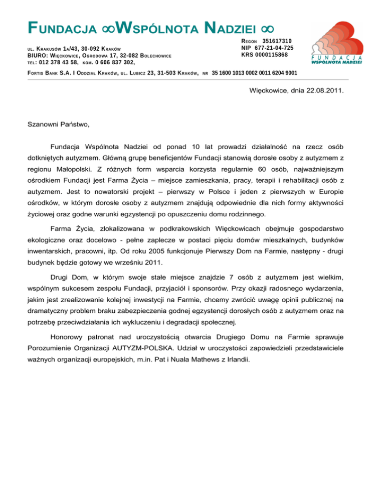 FUNDACJA • WSPÓLNOTA NADZIEI • R EGON 351617310 NIP 677-21-04-725 KRS 0000115868 UL . K RAKUSÓW 1 A /43, 30-092 K RAKÓW BIURO: W IĘCKOWICE , O GRODOWA 17, 32-082 B OLECHOWICE TEL : 012 378 43 58, KOM . 0 606 837 302, F ORTIS B ANK S.A. I O DDZIAŁ K RAKÓW , UL . L UBICZ 23, 31-503 K RAKÓW , NR 35 1600 1013 0002 0011 6204 9001 Więckowice, dnia 22.08.2011. Szanowni Państwo, Fundacja Wspólnota Nadziei od ponad 10 lat prowadzi działalność na rzecz osób dotkniętych autyzmem. Główną grupę beneficjentów Fundacji stanowią dorosłe osoby z autyzmem z regionu Małopolski. Z różnych form wsparcia korzysta regularnie 60 osób, najważniejszym ośrodkiem Fundacji jest Farma Życia – miejsce zamieszkania, pracy, terapii i rehabilitacji osób z autyzmem. Jest to nowatorski projekt – pierwszy w Polsce i jeden z pierwszych w Europie ośrodków, w którym dorosłe osoby z autyzmem znajdują odpowiednie dla nich formy aktywności życiowej oraz godne warunki egzystencji po opuszczeniu domu rodzinnego. Farma Życia, zlokalizowana w podkrakowskich Więckowicach obejmuje gospodarstwo ekologiczne oraz docelowo - pełne zaplecze w postaci pięciu domów mieszkalnych, budynków inwentarskich, pracowni, itp. Od roku 2005 funkcjonuje Pierwszy Dom na Farmie, następny - drugi budynek będzie gotowy we wrześniu 2011. Drugi Dom, w którym swoje stałe miejsce znajdzie 7 osób z autyzmem jest wielkim, wspólnym sukcesem zespołu Fundacji, przyjaciół i sponsorów. Przy okazji radosnego wydarzenia, jakim jest zrealizowanie kolejnej inwestycji na Farmie, chcemy zwrócić uwagę opinii publicznej na dramatyczny problem braku zabezpieczenia godnej egzystencji dorosłych osób z autyzmem oraz na potrzebę przeciwdziałania ich wykluczeniu i degradacji społecznej. Honorowy patronat nad uroczystością otwarcia Drugiego Domu na Farmie sprawuje Porozumienie Organizacji AUTYZM-POLSKA. Udział w uroczystości zapowiedzieli przedstawiciele ważnych organizacji europejskich, m.in. Pat i Nuala Mathews z Irlandii. PROGRAM : Piątek, 9 września, Kraków 10:00, Collegium Maius, kawiarnia „U Pęcherza” Spotkanie prasowe z udziałem Aliny Perzanowskiej - prezes Fundacji oraz prof. Tadeusza Gałkowskiego – prezesa Krajowego Towarzystwa Autyzmu. Gość specjalny - Yolande Letur, autorka książki opartej na osobistych doświadczeniach matki osoby autystycznej. 19:00, „Scena w Kamieniołomie” przy kościele św. Józefa w Podgórzu Koncert charytatywny – Zaśpiewają dla nas: grupa muzyczna "Prasłowianki" z repertuarem folklorystycznym, oraz Kasia Cygan przy akompaniamencie Daniela Mazurkiewicza. Po koncercie przewidziano prezentację wydanej przez Fundację książki autorstwa Yolande Letur. Sobota, 10 września, Więckowice, Farma Życia 10:00 - Msza Święta odprawiana przez Jego Eminencję Księdza Kardynała Franciszka Macharskiego (kaplica Domu Pomocy Społecznej w Więckowicach). 11:15 - Uroczyste otwarcie Drugiego Domu; gości Farmy Życia przywita prof. Karol Musioł, Przewodniczący Rady Fundacji. od 12:00 – Spotkanie z pracodawcami, uczestnikami projektu dotyczącego zatrudnienia osób z autyzmem oraz Piknik Rodzinny „Dzień Farmera” – wspólna zabawa podopiecznych Fundacji, sympatyków oraz okolicznych mieszkańców. Od połowy sierpnia – w tygodniach poprzedzających uroczystość otwarcia Drugiego Domu, grupa osób niepełnosprawnych – uczestników jednego z projektów Fundacji promującego zatrudnienie osób z autyzmem, będzie regularnie porządkować zieleń miejską przy Bazylice OO Franciszkanów, w pobliżu „okna papieskiego”. Alina Perzanowska Prezes Fundacji Wspólnota Nadziei