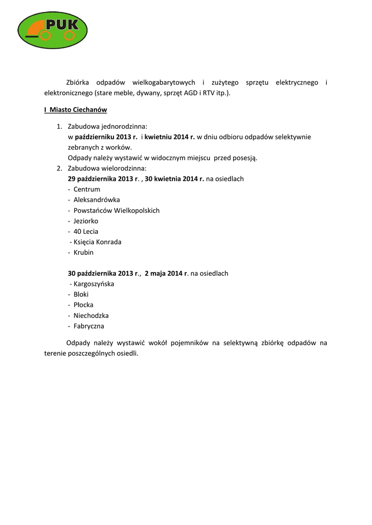 Zbiórka odpadów wielkogabarytowych i zużytego sprzętu elektrycznego i elektronicznego (stare meble, dywany, sprzęt AGD i RTV itp.). I Miasto Ciechanów 1. Zabudowa jednorodzinna: w październiku 2013 r. i kwietniu 2014 r. w dniu odbioru odpadów selektywnie zebranych z worków. Odpady należy wystawić w widocznym miejscu przed posesją. 2. Zabudowa wielorodzinna: 29 października 2013 r. , 30 kwietnia 2014 r. na osiedlach - Centrum - Aleksandrówka - Powstańców Wielkopolskich - Jeziorko - 40 Lecia - Księcia Konrada - Krubin 30 października 2013 r., 2 maja 2014 r. na osiedlach - Kargoszyńska - Bloki - Płocka - Niechodzka - Fabryczna Odpady należy wystawić wokół pojemników na selektywną zbiórkę odpadów na terenie poszczególnych osiedli.
