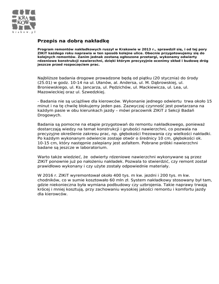 Przepis na dobrą nakładkę Program remontów nakładkowych ruszył w Krakowie w 2013 r., sprawdził się, i od tej pory ZIKiT każdego roku naprawia w ten sposób kolejne ulice. Obecnie przygotowujemy się do kolejnych remontów. Zanim jednak zostaną ogłoszone przetargi, wykonamy odwierty rdzeniowe konstrukcji nawierzchni, dzięki którym precyzyjnie ocenimy skład i budowę dróg jeszcze przed rozpoczęciem prac. Najbliższe badania drogowe prowadzone będą od piątku (20 stycznia) do środy (25.01) w godz. 10-14 na ul. Ułanów, al. Andersa, ul. M. Dąbrowskiej, ul. Broniewskiego, ul. Ks. Jancarza, ul. Pędzichów, ul. Mackiewicza, ul. Lea, ul. Mazowieckiej oraz ul. Szwedzkiej. - Badania nie są uciążliwe dla kierowców. Wykonanie jednego odwiertu trwa około 15 minut i na tę chwilę blokujemy jeden pas. Zazwyczaj czynność jest powtarzana na każdym pasie w obu kierunkach jazdy – mówi pracownik ZIKiT z Sekcji Badań Drogowych. Badania są pomocne na etapie przygotowań do remontu nakładkowego, ponieważ dostarczają wiedzy na temat konstrukcji i grubości nawierzchni, co pozwala na precyzyjne określenie zakresu prac, np. głębokości frezowania czy wielkości nakładki. Po każdym wykonanym odwiercie zostaje otwór o średnicy 10 cm, głębokości ok. 10-15 cm, który następnie zalepiany jest asfaltem. Pobrane próbki nawierzchni badane są jeszcze w laboratorium. Warto także wiedzieć, że odwierty rdzeniowe nawierzchni wykonywane są przez ZIKiT ponownie już po nałożeniu nakładek. Pozwala to stwierdzić, czy remont został prawidłowo wykonany i czy użyte zostały odpowiednie materiały. W 2016 r. ZIKiT wyremontował około 400 tys. m kw. jezdni i 200 tys. m kw. chodników, co w sumie kosztowało 60 mln zł. System nakładkowy stosowany był tam, gdzie niekonieczna była wymiana podbudowy czy uzbrojenia. Takie naprawy trwają krócej i mniej kosztują, przy zachowaniu wysokiej jakości remontu i komfortu jazdy dla kierowców. Powered by TCPDF (www.tcpdf.org)