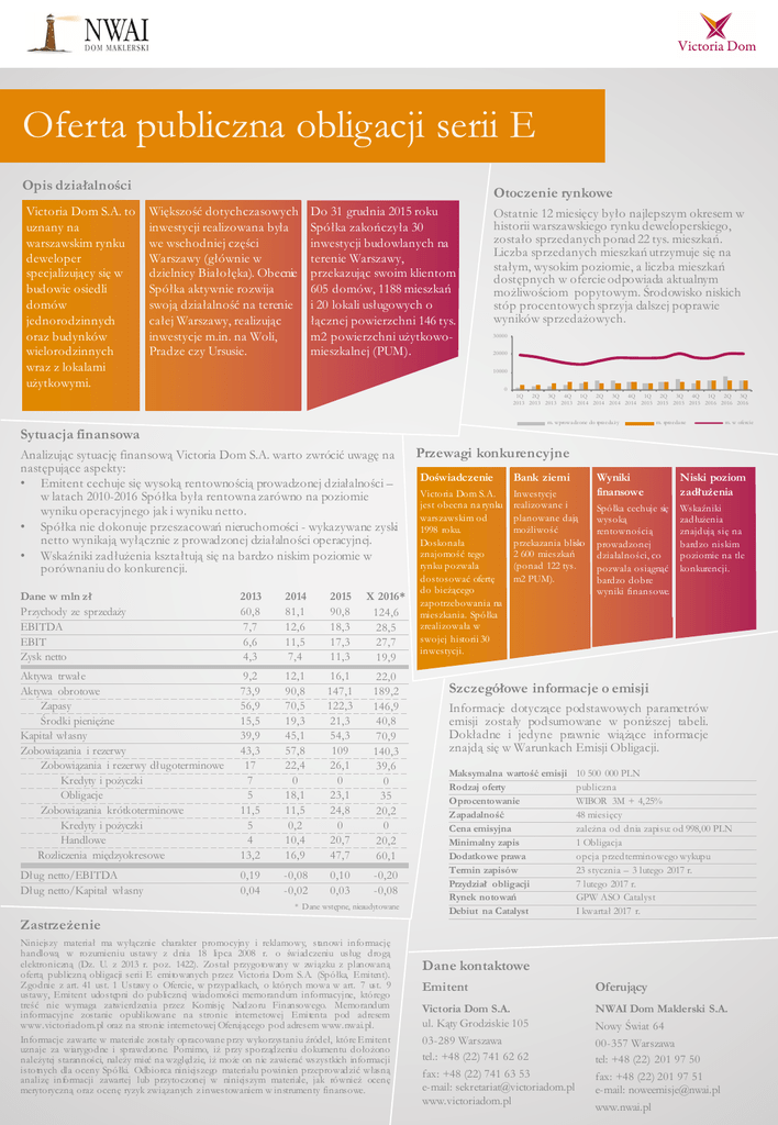 Opis działalności Victoria Dom S.A. to uznany na warszawskim rynku deweloper specjalizujący się w budowie osiedli domów jednorodzinnych oraz budynków wielorodzinnych wraz z lokalami użytkowymi. Otoczenie rynkowe Większość dotychczasowych inwestycji realizowana była we wschodniej części Warszawy (głównie w dzielnicy Białołęka). Obecnie Spółka aktywnie rozwija swoją działalność na terenie całej Warszawy, realizując inwestycje m.in. na Woli, Pradze czy Ursusie. Do 31 grudnia 2015 roku Spółka zakończyła 30 inwestycji budowlanych na terenie Warszawy, przekazując swoim klientom 605 domów, 1188 mieszkań i 20 lokali usługowych o łącznej powierzchni 146 tys. m2 powierzchni użytkowomieszkalnej (PUM). Ostatnie 12 miesięcy było najlepszym okresem w historii warszawskiego rynku deweloperskiego, zostało sprzedanych ponad 22 tys. mieszkań. Liczba sprzedanych mieszkań utrzymuje się na stałym, wysokim poziomie, a liczba mieszkań dostępnych w ofercie odpowiada aktualnym możliwościom popytowym. Środowisko niskich stóp procentowych sprzyja dalszej poprawie wyników sprzedażowych. 30000 20000 10000 0 1Q 2Q 3Q 4Q 1Q 2Q 3Q 4Q 1Q 2Q 3Q 4Q 1Q 2Q 3Q 2013 2013 2013 2013 2014 2014 2014 2014 2015 2015 2015 2015 2016 2016 2016 m. wprowadzone do sprzedaży m. sprzedane m. w ofercie Sytuacja finansowa Analizując sytuację finansową Victoria Dom S.A. warto zwrócić uwagę na następujące aspekty: • Emitent cechuje się wysoką rentownością prowadzonej działalności – w latach 2010-2016 Spółka była rentowna zarówno na poziomie wyniku operacyjnego jak i wyniku netto. • Spółka nie dokonuje przeszacowań nieruchomości - wykazywane zyski netto wynikają wyłącznie z prowadzonej działalności operacyjnej. • Wskaźniki zadłużenia kształtują się na bardzo niskim poziomie w porównaniu do konkurencji. Dane w mln zł Przychody ze sprzedaży EBITDA EBIT Zysk netto 2013 60,8 7,7 6,6 4,3 2014 81,1 12,6 11,5 7,4 2015 90,8 18,3 17,3 11,3 X 2016* 124,6 28,5 27,7 19,9 Aktywa trwałe Aktywa obrotowe Zapasy Środki pieniężne Kapitał własny Zobowiązania i rezerwy Zobowiązania i rezerwy długoterminowe Kredyty i pożyczki Obligacje Zobowiązania krótkoterminowe Kredyty i pożyczki Handlowe Rozliczenia międzyokresowe 9,2 73,9 56,9 15,5 39,9 43,3 17 7 5 11,5 5 4 13,2 12,1 90,8 70,5 19,3 45,1 57,8 22,4 0 18,1 11,5 0,2 10,4 16,9 16,1 147,1 122,3 21,3 54,3 109 26,1 0 23,1 24,8 0 20,7 47,7 22,0 189,2 146,9 40,8 70,9 140,3 39,6 0 35 20,2 0 20,2 60,1 Dług netto/EBITDA Dług netto/Kapitał własny 0,19 0,04 -0,08 -0,02 0,10 0,03 -0,20 -0,08 * Dane wstępne, nieaudytowane Zastrzeżenie Niniejszy materiał ma wyłącznie charakter promocyjny i reklamowy, stanowi informację handlową w rozumieniu ustawy z dnia 18 lipca 2008 r. o świadczeniu usług drogą elektroniczną (Dz. U. z 2013 r. poz. 1422). Został przygotowany w związku z planowaną ofertą publiczną obligacji serii E emitowanych przez Victoria Dom S.A. (Spółka, Emitent). Zgodnie z art. 41 ust. 1 Ustawy o Ofercie, w przypadkach, o których mowa w art. 7 ust. 9 ustawy, Emitent udostępni do publicznej wiadomości memorandum informacyjne, którego treść nie wymaga zatwierdzenia przez Komisję Nadzoru Finansowego. Memorandum informacyjne zostanie opublikowane na stronie internetowej Emitenta pod adresem www.victoriadom.pl oraz na stronie internetowej Oferującego pod adresem www.nwai.pl. Informacje zawarte w materiale zostały opracowane przy wykorzystaniu źródeł, które Emitent uznaje za wiarygodne i sprawdzone. Pomimo, iż przy sporządzeniu dokumentu dołożono należytej staranności, należy mieć na względzie, iż może on nie zawierać wszystkich informacji istotnych dla oceny Spółki. Odbiorca niniejszego materiału powinien przeprowadzić własną analizę informacji zawartej lub przytoczonej w niniejszym materiale, jak również ocenę merytoryczną oraz ocenę ryzyk związanych z inwestowaniem w instrumenty finansowe. Przewagi konkurencyjne Doświadczenie Bank ziemi Victoria Dom S.A. jest obecna na rynku warszawskim od 1998 roku. Doskonała znajomość tego rynku pozwala dostosować ofertę do bieżącego zapotrzebowania na mieszkania. Spółka zrealizowała w swojej historii 30 inwestycji. Inwestycje realizowane i planowane dają możliwość przekazania blisko 2 600 mieszkań (ponad 122 tys. m2 PUM). Wyniki finansowe Niski poziom zadłużenia Spółka cechuje się wysoką rentownością prowadzonej działalności, co pozwala osiągnąć bardzo dobre wyniki finansowe. Wskaźniki zadłużenia znajdują się na bardzo niskim poziomie na tle konkurencji. Szczegółowe informacje o emisji Informacje dotyczące podstawowych parametrów emisji zostały podsumowane w poniższej tabeli. Dokładne i jedyne prawnie wiążące informacje znajdą się w Warunkach Emisji Obligacji. Maksymalna wartość emisji Rodzaj oferty Oprocentowanie Zapadalność Cena emisyjna Minimalny zapis Dodatkowe prawa Termin zapisów Przydział obligacji Rynek notowań Debiut na Catalyst 10 500 000 PLN publiczna WIBOR 3M + 4,25% 48 miesięcy zależna od dnia zapisu: od 998,00 PLN 1 Obligacja opcja przedterminowego wykupu 23 stycznia – 3 lutego 2017 r. 7 lutego 2017 r. GPW ASO Catalyst I kwartał 2017 r. Dane kontaktowe Emitent Oferujący Victoria Dom S.A. ul. Kąty Grodziskie 105 03-289 Warszawa tel.: +48 (22) 741 62 62 fax: +48 (22) 741 63 53 e-mail: [email protected] www.victoriadom.pl NWAI Dom Maklerski S.A. Nowy Świat 64 00-357 Warszawa tel: +48 (22) 201 97 50 fax: +48 (22) 201 97 51 e-mail: [email protected] www.nwai.pl