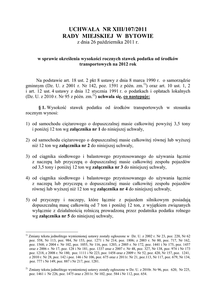 UCHWAŁA NR XIII/107/2011 RADY MIEJSKIEJ W BYTOWIE z dnia 26 października 2011 r. w sprawie określenia wysokości rocznych stawek podatku od środków transportowych na 2012 rok Na podstawie art. 18 ust. 2 pkt 8 ustawy z dnia 8 marca 1990 r. o samorządzie gminnym (Dz. U. z 2001 r. Nr 142, poz. 1591 z późn. zm.1)) oraz art. 10 ust. 1, 2 i art. 12 ust. 4 ustawy z dnia 12 stycznia 1991 r. o podatkach i opłatach lokalnych (Dz. U. z 2010 r. Nr 95 z późn. zm.2)) uchwala się, co następuje: § 1. Wysokość stawek podatku od środków transportowych w stosunku rocznym wynosi: 1) od samochodu cięŜarowego o dopuszczalnej masie całkowitej powyŜej 3,5 tony i poniŜej 12 ton wg załącznika nr 1 do niniejszej uchwały, 2) od samochodu cięŜarowego o dopuszczalnej masie całkowitej równej lub wyŜszej niŜ 12 ton wg załącznika nr 2 do niniejszej uchwały, 3) od ciągnika siodłowego i balastowego przystosowanego do uŜywania łącznie z naczepą lub przyczepą o dopuszczalnej masie całkowitej zespołu pojazdów od 3,5 tony i poniŜej 12 ton wg załącznika nr 3 do niniejszej uchwały, 4) od ciągnika siodłowego i balastowego przystosowanego do uŜywania łącznie z naczepą lub przyczepą o dopuszczalnej masie całkowitej zespołu pojazdów równej lub wyŜszej niŜ 12 ton wg załącznika nr 4 do niniejszej uchwały, 5) od przyczepy i naczepy, które łącznie z pojazdem silnikowym posiadają dopuszczalną masę całkowitą od 7 ton i poniŜej 12 ton, z wyjątkiem związanych wyłącznie z działalnością rolniczą prowadzoną przez podatnika podatku rolnego wg załącznika nr 5 do niniejszej uchwały, 1) Zmiany tekstu jednolitego wymienionej ustawy zostały ogłoszone w Dz. U. z 2002 r. Nr 23, poz. 220, Nr 62 poz. 558, Nr 113, poz. 984, Nr 153, poz. 1271 i Nr 214, poz. 1806; z 2003 r. Nr 80, poz. 717, Nr 162, poz. 1568; z 2004 r. Nr 102, poz. 1055, Nr 116, poz. 1203, z 2005 r. Nr 172, poz. 1441 i Nr 175, poz. 1457 oraz z 2006 r. Nr 17, poz. 128 i Nr 181, poz. 1337 oraz z 2007 r. Nr 48, poz. 327, Nr 138, poz. 974 i Nr 173 poz. 1218, z 2008 r. Nr 180, poz. 1111 i Nr 223, poz. 1458 oraz z 2009 r. Nr 52, poz. 420, Nr 157, poz. 1241, z 2010 r. Nr 28, poz. 142 i poz. 146 i Nr 106, poz. 675 oraz z 2011r. Nr 21, poz.113, Nr 117, poz. 679, Nr 134, poz. 777 i Nr 149, poz. 887 i Nr 217, poz. 1281. 2) Zmiany tekstu jednolitego wymienionej ustawy zostały ogłoszone w Dz. U. z 2010r. Nr 96, poz. 620, Nr 225, poz. 1461 i Nr 226, poz. 1475 oraz z 2011r. Nr 102, poz. 584 i Nr 112, poz. 654. 6) od przyczepy i naczepy, które łącznie z pojazdem silnikowym posiadają dopuszczalną masę całkowitą równą lub wyŜszą niŜ 12 ton, z wyjątkiem związanych wyłącznie z działalnością rolniczą prowadzoną przez podatnika podatku rolnego wg załącznika nr 6 do niniejszej uchwały, 7 ) od autobusu wg załącznika nr 7 do niniejszej uchwały. § 2. ObniŜeniu ulega wysokość stawek rocznych podatku od środków transportowych od pojazdów określonych w załącznikach niniejszej uchwały: - w załączniku nr 1 o 50 zł - w załączniku nr 3 o 60 zł - w załączniku nr 7 o 70 zł, wyposaŜonych w katalizatory, zasilanych paliwem gazowym, spełniających normy Euro III, Euro IV i Euro V. Wysokość stawek po obniŜeniu nie moŜe być niŜsza od stawek minimalnych określonych odpowiednio w przepisach ustawy o podatkach i opłatach lokalnych. § 3. Wykonanie uchwały powierza się Burmistrzowi Bytowa. § 4. Uchwała wchodzi w Ŝycie z dniem 01 stycznia 2012r., po uprzednim ogłoszeniu w Dzienniku Urzędowym Województwa Pomorskiego. 2 Załącznik Nr 1 do uchwały Nr XIII/107/2011 Rady Miejskiej w Bytowie z dnia 26.10.2011 r. Stawki roczne podatku dla samochodów cięŜarowych o dopuszczalnej masie całkowitej powyŜej 3,5 tony i poniŜej 12 ton dopuszczalna masa całkowita w tonach stawka podatku w zł powyŜej do włącznie wyprodukowane do 31.12.2001 r. wyprodukowane od 01.01.2002 r. 3,5 5,5 730 706 5,5 9 1.144 1.074 powyŜej mniej niŜ wyprodukowane do 31.12.2001 r. wyprodukowane od 01.01.2002 r. 9 12 1.318 1.258 3 Załącznik Nr 2 do uchwały Nr XIII/107/2011 Rady Miejskiej w Bytowie z dnia 26.10.2011 r. Stawki roczne podatku dla samochodów cięŜarowych o dopuszczalnej masie całkowitej równej lub wyŜszej niŜ 12 ton dopuszczalna masa całkowita w tonach stawka podatku w zł oś jezdna z zawieszeniem pneumatycznym lub zawieszeniem uznanym za równowaŜne dwie osie nie mniej niŜ mniej niŜ 12 16 1.464 1.510 16 18 1.742 1.762 2.020 2.044 Od 18 ton i więcej inne systemy zawieszenia osi jezdnych trzy osie 12 16 1.440 1.464 16 18 1.720 1.742 1.986 2.022 od 18 ton i więcej cztery osie i więcej 12 16 1.406 1.440 16 18 1.682 1.706 18 29 1.960 1.986 1.986 2.628 od 29 ton i więcej 4 Załącznik Nr 3 do uchwały Nr XIII/107/2011 Rady Miejskiej w Bytowie z dnia 26.10.2011 r. Stawki roczne podatku dla ciągników siodłowych i balastowych przystosowanych do uŜywania łącznie z naczepą lub przyczepą o dopuszczalnej masie całkowitej zespołu pojazdów od 3,5 tony i poniŜej 12 ton dopuszczalna masa całkowita w tonach stawka podatku w zł nie mniej niŜ mniej niŜ wyprodukowane do 31.12.2001 r. wyprodukowane od 01.01.2002 r. 3,5 12 1.286 1.226 5 Załącznik Nr 4 do uchwały Nr XIII/107/2011 Rady Miejskiej w Bytowie z dnia 26.10.2011 r. Stawki roczne podatku dla ciągników siodłowych i balastowych przystosowanych do uŜywania łącznie z naczepą lub przyczepą o dopuszczalnej masie całkowitej zespołu pojazdów równej lub wyŜszej niŜ 12 ton dopuszczalna masa całkowita zespołu pojazdów: ciągnik siodłowy + naczepa, ciągnik balastowy + przyczepa w tonach stawka podatku w zł oś jezdna z zawieszeniem pneumatycznym lub zawieszeniem uznanym za równowaŜne dwie osie inne systemy zawieszenia osi jezdnych nie mniej niŜ mniej niŜ 12 18 2.044 2.100 18 25 2.056 2.116 25 31 2.066 2.126 2.078 2.136 od 31 ton i więcej trzy osie 12 40 2.076 2.100 40 44 2.088 2.732 od 44 ton i więcej 2.100 2.