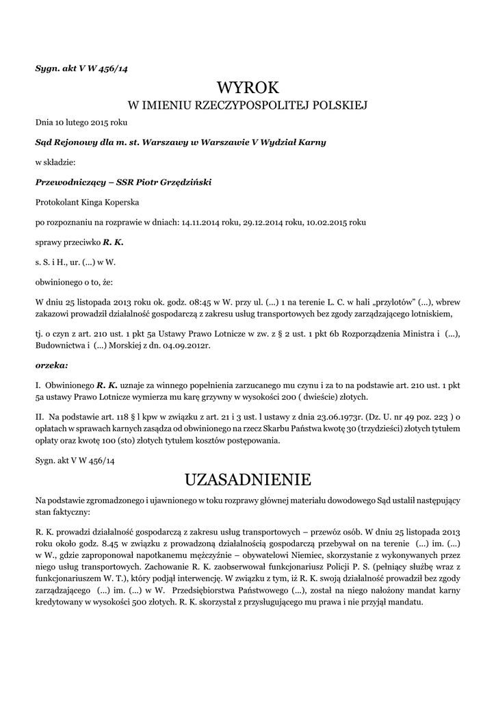 Sygn. akt V W 456/14 WYROK W IMIENIU RZECZYPOSPOLITEJ POLSKIEJ Dnia 10 lutego 2015 roku Sąd Rejonowy dla m. st. Warszawy w Warszawie V Wydział Karny w składzie: Przewodniczący – SSR Piotr Grzędziński Protokolant Kinga Koperska po rozpoznaniu na rozprawie w dniach: 14.11.2014 roku, 29.12.2014 roku, 10.02.2015 roku sprawy przeciwko R. K. s. S. i H., ur. (...) w W. obwinionego o to, że: W dniu 25 listopada 2013 roku ok. godz. 08:45 w W. przy ul. (...) 1 na terenie L. C. w hali „przylotów” (...), wbrew zakazowi prowadził działalność gospodarczą z zakresu usług transportowych bez zgody zarządzającego lotniskiem, tj. o czyn z art. 210 ust. 1 pkt 5a Ustawy Prawo Lotnicze w zw. z § 2 ust. 1 pkt 6b Rozporządzenia Ministra i (...), Budownictwa i (...) Morskiej z dn. 04.09.2012r. orzeka: I. Obwinionego R. K. uznaje za winnego popełnienia zarzucanego mu czynu i za to na podstawie art. 210 ust. 1 pkt 5a ustawy Prawo Lotnicze wymierza mu karę grzywny w wysokości 200 ( dwieście) złotych. II. Na podstawie art. 118 § l kpw w związku z art. 21 i 3 ust. l ustawy z dnia 23.06.1973r. (Dz. U. nr 49 poz. 223 ) o opłatach w sprawach karnych zasądza od obwinionego na rzecz Skarbu Państwa kwotę 30 (trzydzieści) złotych tytułem opłaty oraz kwotę 100 (sto) złotych tytułem kosztów postępowania. Sygn. akt V W 456/14 UZASADNIENIE Na podstawie zgromadzonego i ujawnionego w toku rozprawy głównej materiału dowodowego Sąd ustalił następujący stan faktyczny: R. K. prowadzi działalność gospodarczą z zakresu usług transportowych – przewóz osób. W dniu 25 listopada 2013 roku około godz. 8.45 w związku z prowadzoną działalnością gospodarczą przebywał on na terenie (...) im. (...) w W., gdzie zaproponował napotkanemu mężczyźnie – obywatelowi Niemiec, skorzystanie z wykonywanych przez niego usług transportowych. Zachowanie R. K. zaobserwował funkcjonariusz Policji P. S. (pełniący służbę wraz z funkcjonariuszem W. T.), który podjął interwencję. W związku z tym, iż R. K. swoją działalność prowadził bez zgody zarządzającego (...) im. (...) w W. Przedsiębiorstwa Państwowego (...), został na niego nałożony mandat karny kredytowany w wysokości 500 złotych. R. K. skorzystał z przysługującego mu prawa i nie przyjął mandatu. Powyższy stan faktyczny Sąd ustalił na podstawie: częściowych wyjaśnień obwinionego R. K. /k. 22-23/, zeznań świadka P. S. /k. 7v, 23/. Obwiniony R. K. nie przyznał się do zarzuconego mu czynu. Wyjaśnił, że wcześniej prowadził działalność taksówkową, nigdzie nie można było podjechać, pod żaden postój, bo wszędzie były korporacje. Jednocześnie, aby móc jeździć, musiałby płacić drakońskie ceny, aby być w korporacji, jest to 1500-1800 złotych miesięcznie. Wyjaśnił, że zaczął prowadzić działalność przewóz osób, ogłaszać się w internecie, skąd pozyskuje klientów, również niektórzy klienci będąc na lotnisku poznają go, jak jeździł taksówką. Wiedząc, że posługuje się językami angielskim, niemieckim, rosyjskim, korzystają z jego usług, chcą, aby ich wozić. Wskazał, że gdy klient idzie z nim, policja mówi, że nie może prowadzić działalności gospodarczej, zabiera klienta do taksówek korporacyjnych, nakłada na niego mandat lub kieruje wniosek do sądu. Wyjaśnił, że w tej sprawie temu panu zadano pytanie, czy obwiniony jest taksówką. Wyjaśnił, że ten pan poznał go przy kasach i przypomniał sobie, że obwiniony włada językiem niemieckim; zapytał, czy obwiniony mógłby go zawieźć. Obwiniony doprecyzował, że pytanie policjanta brzmiało, czy obwiniony jest taksówką, a ten pan pamiętał, że obwiniony jeździł taksówką. Wyjaśniał dalej, że w obecnej chwili jego samochód nie przypomina taksówki, bo prowadzi transport osobowy i nie może reklamować się jako taksówka. Podkreślił, że ten pasażer podszedł do niego, zapytał, czy obwiniony go pamięta i czy podwiezie go tu i tu. Sąd zważył, co następuje: Uwzględniając przeprowadzone i ujawnione w sprawie dowody, Sąd uznał, iż potwierdziły one ponad wszelką wątpliwość sprawstwo i winę R. K. w odniesieniu do przypisanego mu czynu. Sąd dał wiarę jedynie tym wyjaśnieniom obwinionego, w których podał on ogólne informacje dotyczące prowadzonej przez niego działalności gospodarczej z zakresu usług przewozu osób oraz potwierdził swoją obecność w dniu wskazanym we wniosku o ukaranie na terenie (...) im. (...) w W.. Jednocześnie Sąd odmówił wiarygodności tej części wyjaśnień obwinionego, w której zaprzeczał on, aby proponował przebywającemu na terenie (...) im. (...) w W. obywatelowi Niemiec skorzystanie z wykonywanych przez niego usług transportowych. Według Sądu wyjaśnienia obwinionego w powyższym zakresie są przyjętą przez niego nieudolną linią obrony. Na sprawstwo obwinionego jasno wskazują zeznania świadka P. S.. Z zeznań świadka, funkcjonariusza Policji pracującego na terenie (...) przy ul. (...) 1 w W., wynika, iż w dniu 25 listopada 2013 roku około godz. 8.45, wykonując swoje obowiązki służbowe, podjął interwencję wobec obwinionego, który bez zgody zarządzającego lotniskiem prowadził działalność gospodarczą w postaci przewozu osób. W czasie interwencji rozpytał obywatela Niemiec i ustalił, że obwiniony proponował mu przewóz osób na terenie lotniska – kurs miał odbyć się z lotniska do centrum W.. Z uwagi na to, iż obwiniony prowadził działalność gospodarczą w postaci usług transportowych bez zgody zarządzającego lotniskiem, świadek nałożył na niego mandat karny kredytowany w wysokości 500 złotych, informując go jednocześnie o prawie do odmowy przyjęcia mandatu. R. K. skorzystał z przysługującego mu prawa i nie przyjął mandatu. Na rozprawie sądowej świadek zeznał dodatkowo, że z obwinionym miał styczność wiele razy – zawsze z tego samego powodu, tj. w 