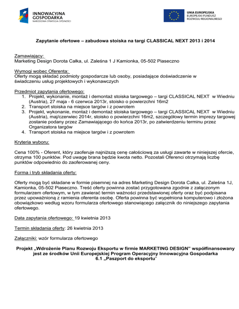 Zapytanie ofertowe – zabudowa stoiska na targi CLASSICAL NEXT 2013 i 2014 Zamawiający: Marketing Design Dorota Całka, ul. Zaleśna 1 J Kamionka, 05-502 Piaseczno Wymogi wobec Oferenta: Oferty mogą składać podmioty gospodarcze lub osoby, posiadające doświadczenie w świadczeniu usług projektowych i wykonawczych Przedmiot zapytania ofertowego: 1. Projekt, wykonanie, montaż i demontaż stoiska targowego – targi CLASSICAL NEXT w Wiedniu (Austria), 27 maja - 6 czerwca 2013r, stoisko o powierzchni 16m2 2. Transport stoiska na miejsce targów i z powrotem 3. Projekt, wykonanie, montaż i demontaż stoiska targowego – targi CLASSICAL NEXT w Wiedniu (Austria), maj/czerwiec 2014r, stoisko o powierzchni 16m2, szczegółowy termin imprezy targowej zostanie podany przez Zamawiającego do końca 2013r, po zatwierdzeniu terminu przez Organizatora targów 4. Transport stoiska na miejsce targów i z powrotem Kryteria wyboru: Cena 100% - Oferent, który zaoferuje najniższą cenę całościową za usługi zawarte w niniejszej ofercie, otrzyma 100 punktów. Pod uwagę brana będzie kwota netto. Pozostali Oferenci otrzymają liczbę punktów odpowiednio do zaoferowanej ceny. Forma i tryb składania oferty: Oferty mogą być składane w formie pisemnej na adres Marketing Design Dorota Całka, ul. Zaleśna 1J, Kamionka, 05-502 Piaseczno. Treść oferty powinna zostać przygotowana zgodnie z załączonym formularzem ofertowym, w tym zawierać termin ważności przedstawionej oferty oraz być podpisana przez upoważnioną z ramienia oferenta osobę. Oferta powinna być wypełniona komputerowo i złożona obowiązkowo według wzoru formularza ofertowego stanowiącego załącznik do niniejszego zapytania ofertowego. Data zapytania ofertowego: 19 kwietnia 2013 Termin składania oferty: 26 kwietnia 2013 Załączniki: wzór formularza ofertowego Projekt „Wdrożenie Planu Rozwoju Eksportu w firmie MARKETING DESIGN” współfinansowany jest ze środków Unii Europejskiej Program Operacyjny Innowacyjna Gospodarka 6.1 „Paszport do eksportu” miejscowość data oferty FORMULARZ OFERTOWY Zamawiający: Marketing Design Dorota Całka Ul. Zaleśna 1J, Kamionka 05-502 Piaseczno NIP 527-132-74-25 Oferent: Nazwa oferenta adres kod pocztowy, miejscowość NIP W odpowiedzi na zapytanie ofertowe z dnia 19 kwietnia 2013 przedstawiamy ofertę w zakresie projektu, wykonania, montażu i demontażu stoiska targowego podczas dwóch zagranicznych imprez targowo – wystawienniczych oraz transportu eksponatów. Przedmiot zamówienia realizowany jest w ramach projektu „Wdrożenie Planu Rozwoju Eksportu w firmie Marketing Design” współfinansowanego w ramach Programu Operacyjnego Innowacyjna Gospodarka Program 6.1. Koszt i termin realizacji usługi: Oferujemy wykonanie prac wyszczególnionych w zapytaniu ofertowym w następujących kwotach i terminach: Lp. 1. 2. 3. 4. Nazwa usługi Wykonanie zabudowy stoiska targowego na targi „Classical Next” 2013 w Wiedniu Transport eksponatów na targi „Classical Next” 2013 w Wiedniu Wykonanie zabudowy stoiska targowego na targi „Classical Next” 2014 w Wiedniu Cena netto Termin realizacji usługi 27 maja 2013 ............. 2 czerwca 2013 ............. czerwiec 2014 ............. Transport eksponatów na targi „Classical Next” 2014 w Wiedniu ............. Wartość usług ............. czerwiec 2014 Wartość zamówienia zostanie powiększona o podatek VAT w wysokości 23%. Szczegółowy opis oferowanej usługi W ramach niniejszej usługi wykonane zostaną następujące prace: Lp. Nazwa usługi 1. Koszt usługi obejmuje przygotowanie stoiska Zleceniodawcy na targi „Classical Next” 2013 w tym opracowanie projektu stoiska, produkcja stoiska, montaż i demontaż stoiska. Projekt graficzny opracowany zostanie zgodnie z wytycznymi Zleceniodawcy i identyfikacją wizualną Zleceniodawcy. Stoisko zaprojektowane zostanie tak, aby możliwa była promocja marki własnej lyt muzycznych wydawanych przez Zleceniodawcę. Projekt obejmować będzie pełne wyposażenie stoiska o powierzchni 16m2. 2. Usługa obejmować będzie transport eksponatów na targi „Classical Next” 2013 na trasie Warszawa –Piaseczno-Wiedeń – Piaseczno – Warszawa. W ramach transportu dostarczone zostaną wszystkie elementy stoiska opracowanego przez Oferenta oraz materiały promocyjne i produkty Zleceniodawcy. 3. Koszt usługi obejmuje przygotowanie stoiska Zleceniodawcy na targi „Classical Next” 2014 w tym opracowanie projektu stoiska, produkcja stoiska, montaż i demontaż stoiska. Projekt graficzny opracowany zostanie zgodnie z wytycznymi Zleceniodawcy i identyfikacją wizualną Zleceniodawcy. Stoisko zaprojektowane zostanie tak, aby możliwa była promocja marki własnej lyt muzycznych wydawanych przez Zleceniodawcę. Projekt obejmować będzie pełne wyposażenie stoiska o powierzchni 16m2. 4. Usługa obejmować będzie transport eksponatów na targi „Classical Next” 2014 na trasie Warszawa –Piaseczno-Wiedeń – Piaseczno – Warszawa. W ramach transportu dostarczone zostaną wszystkie elementy stoiska opracowanego przez Oferenta oraz materiały promocyjne i produkty Zleceniodawcy. Dodatkowe informacje do składanej oferty ………………….. Termin ważności oferty ………………… Oświadczenie oferenta Oświadczam, że zapoznałem się z treścią zapytania ofertowego i nie wnoszę do niego zastrzeżeń Oferuję realizację zamówienia zgodnie z opisem przedstawionym w zapytaniu ofertowym. Posiadam wiedzę, doświadczenie oraz niezbędne zasoby do realizacji niniejszego zamówienia. ………………………………………………… Podpis i pieczęć Oferenta