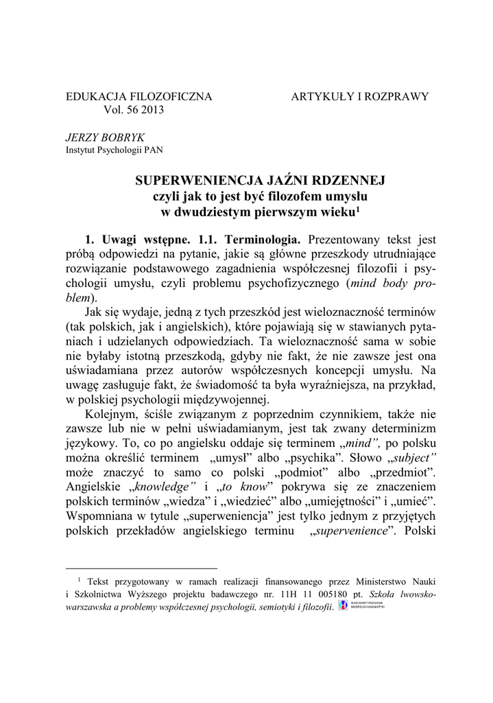 EDUKACJA FILOZOFICZNA Vol. 56 2013 ARTYKUŁY I ROZPRAWY JERZY BOBRYK Instytut Psychologii PAN SUPERWENIENCJA JAŹNI RDZENNEJ czyli jak to jest być filozofem umysłu w dwudziestym pierwszym wieku1 1. Uwagi wstępne. 1.1. Terminologia. Prezentowany tekst jest próbą odpowiedzi na pytanie, jakie są główne przeszkody utrudniające rozwiązanie podstawowego zagadnienia współczesnej filozofii i psychologii umysłu, czyli problemu psychofizycznego (mind body problem). Jak się wydaje, jedną z tych przeszkód jest wieloznaczność terminów (tak polskich, jak i angielskich), które pojawiają się w stawianych pytaniach i udzielanych odpowiedziach. Ta wieloznaczność sama w sobie nie byłaby istotną przeszkodą, gdyby nie fakt, że nie zawsze jest ona uświadamiana przez autorów współczesnych koncepcji umysłu. Na uwagę zasługuje fakt, że świadomość ta była wyraźniejsza, na przykład, w polskiej psychologii międzywojennej. Kolejnym, ściśle związanym z poprzednim czynnikiem, także nie zawsze lub nie w pełni uświadamianym, jest tak zwany determinizm językowy. To, co po angielsku oddaje się terminem „mind”, po polsku można określić terminem „umysł” albo „psychika”. Słowo „subject” może znaczyć to samo co polski „podmiot” albo „przedmiot”. Angielskie „knowledge” i „to know” pokrywa się ze znaczeniem polskich terminów „wiedza” i „wiedzieć” albo „umiejętności” i „umieć”. Wspomniana w tytule „superweniencja” jest tylko jednym z przyjętych polskich przekładów angielskiego terminu „supervenience”. Polski 1 Tekst przygotowany w ramach realizacji finansowanego przez Ministerstwo Nauki i Szkolnictwa Wyższego projektu badawczego nr. 11H 11 005180 pt. Szkoła lwowskowarszawska a problemy współczesnej psychologii, semiotyki i filozofii. 50 Jerzy Bobryk przekład Oksfordzkiego słownika filozoficznego2 używa tu terminu „superwentyzm”, zaś w tłumaczeniu pracy Johna Searle’a The Rediscovery of the Mind3 termin ten oddawany jest określeniem „właściwości następcze”. Do tego dochodzi jeszcze fakt, że znaczenia wymienionych wyżej i wielu innych terminów (jak: „jaźń”, „self”, „ego”, „świadomość”, „consciousness”, „przytomność”, „awareness”, „ja”, „I”, „me” ) obciążone są długą i zmieniającą się tradycją filozoficzną, tradycją zawierającą zresztą wiele odmiennych szkół i nurtów, w których niemal każdy z tych terminów przybierał nieco inne znaczenia i odniesienia. Różnice pomiędzy tymi odmiennymi tradycjami filozoficznymi (związanymi zresztą dość ściśle z różnymi językami etnicznymi), podobnie jak różnice pomiędzy samymi językami naturalnymi, są dość istotą przyczyną trudności współczesnej filozofii umysłu; o czym wiedzą wszyscy, lecz nie wszyscy o tym zawsze pamiętają. Problem polega zresztą na tym, że autorzy wypowiadający się współcześnie na temat problemu psychofizycznego lub pokrewnych zagadnień z jakichś istotnych powodów nie mogą lub nie chcą liczyć się z wieloznacznością i zmiennością używanych przez siebie terminów. Najlepszym przykładem jest tu termin „intencjonalność” (ang. intentionality); termin ten zakorzeniony w tradycji europejskiej fenomenologii, właściwie nie został przyswojony (z nielicznymi wyjątkami, do jakich należą między innymi prace Johna Searle’a) w nadającej ton współczesnej refleksji humanistycznej filozofii amerykańskiej4. Pojęcie intencjonalności i aktów intencjonalnych powstało w Europie środkowej i tylko przez jakiś czas było rozwijane w psychologii (między innymi psychologii szkoły lwowsko-warszawskiej), na stałe jednak zakorzeniło się tylko w fenomenologii. Współczesna kognitywistyka stosuje termin „intencjonalność”, jednak najczęściej pojmuje go w sposób uproszczony (niekiedy redukcjonistyczny). Jedną z tez niniejszego tekstu jest twierdzenie, że takie uproszS. Blackburn: Oksfordzki słownik filozoficzny, Warszawa 1997, s. 382. J. R. Searle: Umysł na nowo odkryty. Warszawa 1999, s. 170. 4 Fakt ten, jak i jego konsekwencje filozoficzne, będzie przedmiotem rozważań kolejnych partii niniejszego tekstu. 2 3 Superweniencja jaźni rdzennej 51 czone (i mające niewiele wspólnego z fenomenologią czy środkowoeuropejską tradycją w psychologii) pojmowanie intencjonalności jest obecnie przeszkodą epistemiczną (termin Gastona Bachelarda) w badaniu ludzkiego umysłu. Uproszczenie znaczenia tego terminu nie pozwala ani na porozumienie się autorów reprezentujących współczesną filozofię umysłu, ani na rozwiązanie samego problemu psychofizycznego. Jak nadmieniłem, jedną z przyczyn takiego uproszczenia jest preferowanie we współczesnej humanistyce rozwiązań teoretycznych należących do szeroko pojmowanego redukcjonizmu. 1.2.Cognitive science i nauka globalna. Redukcjonizm współczesnej filozofii czy humanistki w całości, jakkolwiek przyjmuje różne formy i odmiany, jest na ogół wymuszany dwoma czynnikami. Jednym z nich jest powstanie i dominacja cognitive science, drugim coś, co nazywa się globalizacją współczesnej nauki. Nauka globalna musi być uprawiana według jednego standardowego modelu i w jednym powszechnie przyjętym języku naturalnym. Obecnie jest to, jak wiadomo, język angielski, który zresztą dla większości naukowców nie jest ich językiem ojczystym5. Globalizacja nauki instytucjonalnej w niczym nie przeszkadza (jak sądzę) naukom technicznym i przyrodniczym, może jednak stanowić zasadniczą przeszkodę w rozwoju humanistyki. Humanistyka zglobalizowana, jak powiedziano, preferuje redukcjonizm. Między innymi dlatego, że teorie redukcjonistyczne są łatwiejsze do zrozumienia i przyswojenia przez większość naukowców zmuszonych do uprawiania swojego zawodu i publikowania w przynajmniej nieco gorzej znanym od ojczystego – „drugim” – języku naturalnym. 