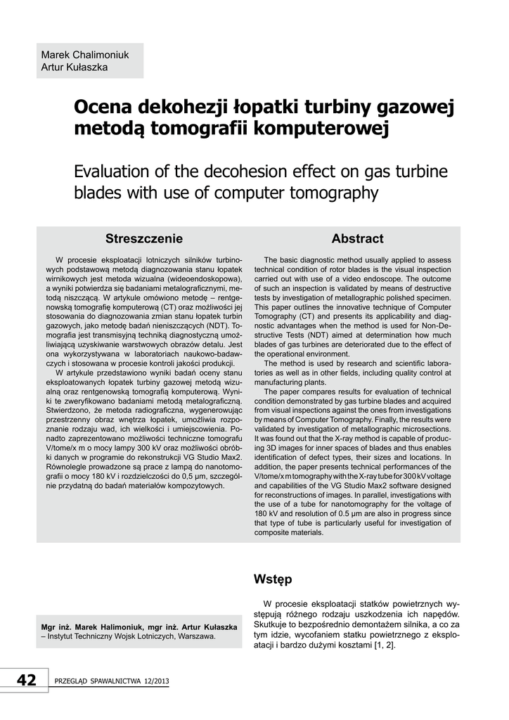 Marek Chalimoniuk Artur Kułaszka Ocena dekohezji łopatki turbiny gazowej metodą tomografii komputerowej evaluation of the decohesion effect on gas turbine blades with use of computer tomography Streszczenie W procesie eksploatacji lotniczych silników turbinowych podstawową metodą diagnozowania stanu łopatek wirnikowych jest metoda wizualna (wideoendoskopowa), a wyniki potwierdza się badaniami metalograficznymi, metodą niszczącą. W artykule omówiono metodę – rentgenowską tomografię komputerową (CT) oraz możliwości jej stosowania do diagnozowania zmian stanu łopatek turbin gazowych, jako metodę badań nieniszczących (nDT). Tomografia jest transmisyjną techniką diagnostyczną umożliwiającą uzyskiwanie warstwowych obrazów detalu. Jest ona wykorzystywana w laboratoriach naukowo-badawczych i stosowana w procesie kontroli jakości produkcji. W artykule przedstawiono wyniki badań oceny stanu eksploatowanych łopatek turbiny gazowej metodą wizualną oraz rentgenowską tomografią komputerową. Wyniki te zweryfikowano badaniami metodą metalograficzną. Stwierdzono, że metoda radiograficzna, wygenerowując przestrzenny obraz wnętrza łopatek, umożliwia rozpoznanie rodzaju wad, ich wielkości i umiejscowienia. Ponadto zaprezentowano możliwości techniczne tomografu V/tome/x m o mocy lampy 300 kV oraz możliwości obróbki danych w programie do rekonstrukcji VG Studio Max2. Równolegle prowadzone są prace z lampą do nanotomografii o mocy 180 kV i rozdzielczości do 0,5 µm, szczególnie przydatną do badań materiałów kompozytowych. abstract The basic diagnostic method usually applied to assess technical condition of rotor blades is the visual inspection carried out with use of a video endoscope. The outcome of such an inspection is validated by means of destructive tests by investigation of metallographic polished specimen. This paper outlines the innovative technique of Computer Tomography (CT) and presents its applicability and diagnostic advantages when the method is used for non-Destructive Tests (nDT) aimed at determination how much blades of gas turbines are deteriorated due to the effect of the operational environment. The method is used by research and scientific laboratories as well as in other fields, including quality control at manufacturing plants. The paper compares results for evaluation of technical condition demonstrated by gas turbine blades and acquired from visual inspections against the ones from investigations by means of Computer Tomography. Finally, the results were validated by investigation of metallographic microsections. It was found out that the X-ray method is capable of producing 3D images for inner spaces of blades and thus enables identification of defect types, their sizes and locations. In addition, the paper presents technical performances of the V/tome/x m tomography with the X-ray tube for 300 kV voltage and capabilities of the VG Studio Max2 software designed for reconstructions of images. In parallel, investigations with the use of a tube for nanotomography for the voltage of 180 kV and resolution of 0.5 µm are also in progress since that type of tube is particularly useful for investigation of composite materials. st p gr inż. arek a imoni k, mgr inż. art r K łaszka – Instytut Techniczny Wojsk Lotniczych, Warszawa. 42 Przegląd sPawalnictwa 12/2013 W procesie eksploatacji statków powietrznych występują różnego rodzaju uszkodzenia ich napędów. Skutkuje to bezpośrednio demontażem silnika, a co za tym idzie, wycofaniem statku powietrznego z eksploatacji i bardzo dużymi kosztami [1, 2]. Odstępstwa od jakości produkcji i napraw stanowią dużą grupę uszkodzeń eksploatacyjnych wykrywanych w przestrzeni wewnętrznej silników lotniczych podczas przeglądów endoskopowych. Użytkownik nie ma na nie wpływu. Uszkodzenia takie ujawniają się w całym okresie eksploatacji i mają charakter losowy. Podczas naprawy istnieje możliwość dokładnej oceny stanu technicznego łopatek turbiny. Dotychczas stosowane metody, np.: wizualna, penetracyjna, ultradźwiękowa mają określone możliwości, przez to nie są wystarczająco wiarygodne w procesie oceny wad lub uszkodzeń wewnętrznych, pęknięć podpowierzchniowych itp. Obecnie ocenę stanu technicznego (np. przegrzania) łopatek diagnosta wykonuje metodą wizualną. Decyzję weryfikuje się metodą niszczącą w badaniach metalograficznych [3, 5]. Prowadzone są badania nad możliwością zastosowania tomografii komputerowej (CT) do oceny całego spektrum stopów metalicznych, polimerów, kompozytów i materiałów elektronicznych stosowanych w konstrukcjach lotniczych. CT jest szeroko wykorzystywana w przemyśle w procesie kontroli jakości produkcji jako metoda nieniszcząca (nDT). Zastosowanie tej metody do weryfikacji elementów konstrukcji lotniczych wymaga prowadzenia wielu badań, mających na celu potwierdzenie poprawności i wiarygodności otrzymywanych wyników. Do diagnozowania stanu łopatek wirnikowych niezbędna jest duża dokładność odwzorowania struktury wewnętrznej w celu np. wymiarowania ścianek wewnętrznych, wykrycia wady lub uszkodzenia. Obecnie stosowane urządzenia rentgenowskie pozwalają wykonywać badania tomograficzne z rozdzielczością ok. 0,5 μm. Jest to bardzo dobra dokładność w odniesieniu do występujących uszkodzeń, których wymiary są rzędu dziesiątych części milimetra. Prowadzenie badań pojedynczego detalu wymaga pewnego czasu i jest uzależnione od jego rozmiarów, materiału z którego jest wykonany, zadania badawczego, dokładności obróbki wyników itp. Podczas obróbki danych w programie graficznym istnieje możliwość weryfikacji kanałów wewnętrznych łopatek chłodzonych. Uzyskuje się to przez funkcję „przezroczystości”(rys 3, 4). Rys.1. Pęknięcie na krawędzi natarcia ig.1. Crack on the edge of attack Rys.2. Zwymiarowane pęknięcie ig.2. Dimensioned crack Rentgenowskatomogra a komp te
