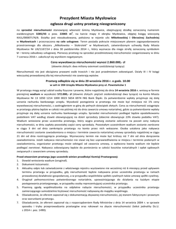 Prezydent Miasta Mysłowice ogłasza drugi ustny przetarg nieograniczony na sprzedaż nieruchomości stanowiącej własność Gminy Mysłowice, obejmującej działkę oznaczoną numerem 2 ewidencyjnym 3285/43 o pow. 22065 m , na karcie mapy 4 obrębu Mysłowice, objętej księgą wieczystą KA1L/00007176/6. Działka jest niezabudowana, położona w rejonie ulic Mikołowskiej i Obrzeżnej Zachodniej w Mysłowicach i przeznaczona na cele usługowe. Teren posiada pokrycie miejscowym planem zagospodarowania przestrzennego dla obszaru „Mikołowska – Stokrotek” w Mysłowicach, zatwierdzonym uchwałą Rady Miasta Mysłowice Nr LXI/1167/14 z dnia 30 października 2014 r., który wyznacza dla niego strefę oznaczoną symbolem U – tereny zabudowy usługowej. Pierwszy przetarg na sprzedaż przedmiotowej nieruchomości zorganizowany w dniu 7 czerwca 2016 r. zakończył się wynikiem negatywnym. Cena wywoławcza nieruchomości wynosi 2.860.000,- zł (słownie złotych: dwa miliony osiemset sześćdziesiąt tysięcy) Nieruchomość nie jest obciążona prawami osób trzecich i nie jest przedmiotem zobowiązań. Działy III i IV księgi wieczystej prowadzonej dla tej nieruchomości nie zawierają wpisów. Przetarg odbędzie się w dniu 20 września 2016 r. o godz. 10.00 w sali nr 204 Urzędu Miasta Mysłowice przy ul. Powstańców 1 W przetargu mogą wziąć udział osoby fizyczne i prawne, które najpóźniej do dnia 14 września 2016 r. wniosą w formie pieniężnej wadium w wysokości 572.000,- zł (słownie złotych: pięćset siedemdziesiąt dwa tysiące) na konto Miasta Mysłowice Nr 13 1050 1214 1000 0023 5654 6974 ING Bank Śląski. Za potwierdzenie wpłaty przyjmuje się datę uznania rachunku bankowego urzędu. Wysokość postąpienia w przetargu nie może być mniejsza niż 1% ceny wywoławczej nieruchomości, z zaokrągleniem w górę do pełnych dziesiątek złotych. Cena za nieruchomość osiągnięta w przetargu płatna będzie w całości nie później niż do dnia zawarcia umowy notarialnej, gdzie za potwierdzenie wpłaty przyjmuje się datę uznania rachunku bankowego urzędu. Sprzedaż nieruchomości podlegać będzie opodatkowaniu podatkiem VAT według stawki obowiązującej na dzień sprzedaży (obecnie obowiązuje 23% stawka podatku VAT). Wadium wniesione przez uczestnika przetargu, który wygra przetarg zostanie zaliczone na poczet ceny nabycia nieruchomości, w dniu zapłaty pozostałej części ceny sprzedaży. Pozostałym uczestnikom wadium zostanie zwrócone w ciągu 3 dni od dnia zamknięcia przetargu na konto przez nich wskazane. Osoba ustalona jako nabywca nieruchomości zostanie zawiadomiona o miejscu i terminie zawarcia notarialnej umowy sprzedaży najpóźniej w ciągu 21 dni od dnia rozstrzygnięcia przetargu. Wyznaczony termin nie może być krótszy niż 7 dni od dnia doręczenia zawiadomienia. Jeżeli nabywca nieruchomości nie stawi się bez usprawiedliwienia w miejscu i terminie podanych w zawiadomieniu, organizator przetargu może odstąpić od zawarcia umowy, a wpłacona kwota wadium nie będzie podlegać zwrotowi. Nabywca zobowiązany będzie do poniesienia w całości kosztów notarialnych i opłat sądowych związanych z zawarciem umowy sprzedaży. Przed otwarciem przetargu jego uczestnik winien przedłożyć Komisji Przetargowej: 1. Dowód wniesienia wadium (oryginał). 2. Dokument tożsamości. 3. Aktualny odpis lub zaświadczenie z właściwego rejestru wystawione nie wcześniej niż 6 miesięcy przed upływem terminu przetargu w przypadku, gdy nieruchomość będzie nabywana przez uczestnika przetargu w ramach prowadzonej działalności gospodarczej, a w przypadku wspólników spółek cywilnych także umowę spółki cywilnej. 4. Oryginał pełnomocnictwa potwierdzonego notarialnie, upoważniającego do działania na każdym etapie postępowania przetargowego, w przypadku osoby reprezentującej uczestnika przetargu. 5. Pisemną zgodę współmałżonka na odpłatne nabycie nieruchomości, w przypadku uczestnika przetargu zamierzającego samodzielnie licytować nieruchomość nabywaną do majątku wspólnego. 6. Oświadczenie, że oferent zapoznał się z dokumentacją zbywanej nieruchomości, jej stanem faktycznym i prawnym oraz warunkami przetargu. 7. Oświadczenie, że oferent zapoznał się z rozporządzeniem Rady Ministrów z dnia 14 września 2004 r. w sprawie sposobu i trybu przeprowadzania przetargów oraz rokowań na zbycie nieruchomości (tekst jednolity Dz.U. z 2014 r. poz. 1490). 8. Numer rachunku bankowego, na które zostanie zwrócone wadium, w przypadku nie wygrania przetargu. Cudzoziemcy mogą nabywać nieruchomości zgodnie z obowiązującymi przepisami ustawy o nabywaniu nieruchomości przez cudzoziemców Informacje dotyczące zbywanej nieruchomości oraz warunki realizacji zamierzeń inwestycyjnych: • Nieruchomość usytuowana jest w centrum miasta, posiada nieregularny kształt, jest nierówna, niezagospodarowana i częściowo porośnięta drzewami i zielenią niską. W części północno - zachodniej i wschodniej działkę przecinają sieci teletechniczne, elektroenergetyczne i sieć gazowa, a w części południowo – zachodniej sieć elektroenergetyczna NN, wodociągowa i teletechniczna. W sąsiedztwie nieruchomości znajduje się zabudowa mieszkaniowa jednorodzinna, zespoły garaży oraz budynki usługowo – biurowe. Obsługa komunikacyjna działki odbywać się będzie z drogi publicznej ulicy Mikołowskiej, po uzgodnieniu zjazdu z zarządcą drogi w odrębnym postępowaniu. Nadto, nieruchomość posiada dostęp do autostrady A4 poprzez drogę powiatową ulicę Obrzeżną Zachodnią. • Zagospodarowanie nieruchomości i jej zabudowa zgodnie z zasadami i ustaleniami planu miejscowego. Teren przeznaczony jest na cele usługowe, na którym zrealizować można zabudowę z przeznaczeniem pod usługi społeczne związane z kulturą, oświatą, edukacją, opieką zdrowotną i społeczną, sportu i rekreacji i innych oraz po