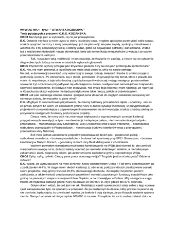 WYWIAD NR.1 tytuł '' OTWARTA ROZMOWA '' Troje pytających z pracowni C.K.O. KOZIANSKA. CKO1 Kandyduje pan w wyborach, czy to już przesądzone. E.K. Ostatnie trzy lata w moim życiu to dobry i spokojny czas, mogłem spokojnie przemyśleć wiele spraw, a także spojrzeć na Kozy z innej perspektywy, już nie jako wójt, ale jako zwykły, spokojny mieszkaniec i wierzcie mi, z tej perspektywy lepiej i ostrzej widać, gdzie są największe potrzeby i zaniedbania. Widać też z niej istotne niedostatki naszej demokracji, takie jak komunikacja mieszkańców z władzą i ze swoimi przedstawicielami, radnymi. Tak, rozważam taką możliwość i mam nadzieje, że Kozianie mi zaufają, a i mam też do spłacenia dług wobec tych, którzy na mnie w ostatnich wyborach głosowali. CKO2 Poprzednie wybory przegrał pan trzystoma głosami. Czy nie ma pan pretensji do społeczności? E.K. Nie, nie mam pretensji, a jeżeli była we mnie jakaś złość to, tylko na siebie samego. No cóż, w demokracji zawartość urny wyborczej to swego rodzaju świętość i trzeba to umieć przyjąć z godnością i pokorą. Po otrząśnięciu się z plotek, pomówień i insynuacji na mój temat, które z prawdą nie miały nic wspólnego, a były tylko brudną częścią kampanii wyborczej mojego następcy, postanowiłem spokojnie żyć i rzeczowo przypatrywać się otaczającemu światu, kontynuować samorządowe znajomości, spisywać spostrzeżenia, by kiedyś z nich skorzystać. Nie życzę tego nikomu i mam nadzieję, że nigdy już w Kozach przy okazji wyborów nie będą praktykowane takie rzeczy, jakich ja doświadczyłem. CKO3 Jak pan postrzega obecne władze i jaki jest pana stosunek do ciągłych oskarżeń począwszy od słynnego audytu, że wszystko to pana wina? E.K. Mógłbym to skomentować przysłowiem, że marnej baletnicy przeszkadza rąbek u spódnicy. Jest mi po prostu przykro bo wiem, że zostawiłem gminę Kozy w dobrej sytuacji finansowej i z przygotowanymi projektami i co najważniejsze z zapewnionym finansowaniem na te inwestycje, a także z kadrą zdolną do pozyskania następnych funduszy pod przyszłe projekty. Cieszy mnie, że nowy wójt nie zmarnował większości z wypracowanych za mojej kadencji przygotowanych inwestycji, w tym: - modernizacja i adaptacja pałacu, - termomodernizacja budynku przedszkola, - modernizacja ulicy Cmentarnej i ulicy Dworcowej wraz z ulicą Przecznią, - dokończenie rozbudowy oczyszczalni w Pisarzowicach, - kontynuacja budowy kolektorów wraz z przyłączami, przebudowa ulicy Szkolnej. Boli mnie jednak zaniechanie projektów przedsięwzięć takich jak: - posterunek policji, rozbudowa cmentarza, - budowa przedszkola, - budowa hali sportowej przy SP2 i Gimnazjum, - budowa kanalizacji w Małych Kozach, - generalny remont ulicy Beskidzkiej wraz z chodnikami. Istotnym powodem rozważania możliwości kandydowania na Wójta jest również to, aby zwrócić mieszkańcom uwagę na to, że ludzi należy oceniać po realności składanych obietnic, a nie fałszywym zakłamaniu i sianiu nieprawdy takich, jak astronomiczne zadłużenie gminy poprzedniego Wójta. CKO2 Cyfry, cyfry, cyferki. Cieszy pana praca obecnego wójta? To gdzie jest ta oś niezgody? Gdzie ta różnica? E.K. Widzę, że wymusza pani na mnie konkrety. Kiedy obejmowałem Urząd 11 lat temu przejmowałem go z zadłużeniem 6-7%. W ciągu moich dwóch kadencji, tj. ośmiu lat, podczas których zrealizowane zostało sporo projektów, dług gminy wynosił 29,5% planowanego dochodu, i to między innymi ten poziom zadłużenia, a także wartość zrealizowanych projektów i wartość pozyskanych funduszy stawiał Kozy jako gminę na pierwszym miejscu w województwie Śląskim, a na dziewiątym w Polsce. Mój następca w ciągu trzech lat rządzenia zadłużył gminę Kozy na prawie 20 000 000 zł, czyli gdzieś tak 57% dochodu. Gołym okiem widać, że coś jest nie tak. Światlejsza część społeczności zdaje sobie z tego sprawę i jest zaniepokojona tym, że spadamy w przepaść. Że po następnym budżecie, który prawie na pewno się nie domknie, będą cięcia, bo z wyliczeń wynika, że braknie i boję się tego, że po Kozach zostanie spalona ziemia. Samych odsetek od długu będzie 800 000 zł rocznie. Pomyślcie, ile za to można załatać dziur w naszych nieszczęsnych drogach. W powietrzu wisi jeszcze jedno niebezpieczeństwo, gdyż Radni wydali zgodę na wypuszczenie przez Gminę obligacji w wysokości 5 – 6 mln zł. Decyzja ta, wymyślona przez wójta i skarbnika, gorsza być już nie może dla naszych mieszkańców. CKO3 Jako pracownia pisaliśmy List Otwarty w sprawie ustawy śmieciowej, sondowaliśmy możliwość referendum i tu była cisza, pisaliśmy o dziwnej niemocy radnych, którzy głosują tak, żeby przejść do następnego punktu, zaliczyć kolejną sesję czy komisję, a przecież są naszymi przedstawicielami. Czy w Kozach istnieje jakaś opozycja – opozycja zdolna wygrać wybory? E.K. Ja też pisałem protest, bo prosili mnie o to mieszkańcy, którzy sami zebrali podpisy. Był to protest o zbyt wysokie opłaty – niestety bezskuteczny. Co do śmieci, to mieliście rację – decyzja, że suche i mokre zapadła jednak na wyższym szczeblu. To w jej wyniku dochodzą czasem do nas dziwne zapachy. Co do referendum, to byłem przeciwny takiemu rozwiązaniu, choćby ze względu na koszty, a także na zamieszanie, jakie prawdopodobnie by powstało. Kto byłby w stanie w ciągu roku posprzątać po poprzedniku i zrealizować obietnice wyborcze? Czy istnieje opozycja? Tak, istnieje wśród światłych obywateli naszej społeczności. Radni, przedstawiciele mieszkańców nie są informowani przez wójta i jego służby o faktycznych aspektach i konsekwencjach podejmowanych decyzji. W radzie gminy nie istnieje żadna opozycja w stosunku do wójta. Grzechem pierworodnym tej władzy były wybory do rady gminy – co innego mówili, a inaczej głosowali. To wy nazwaliście to dulszc