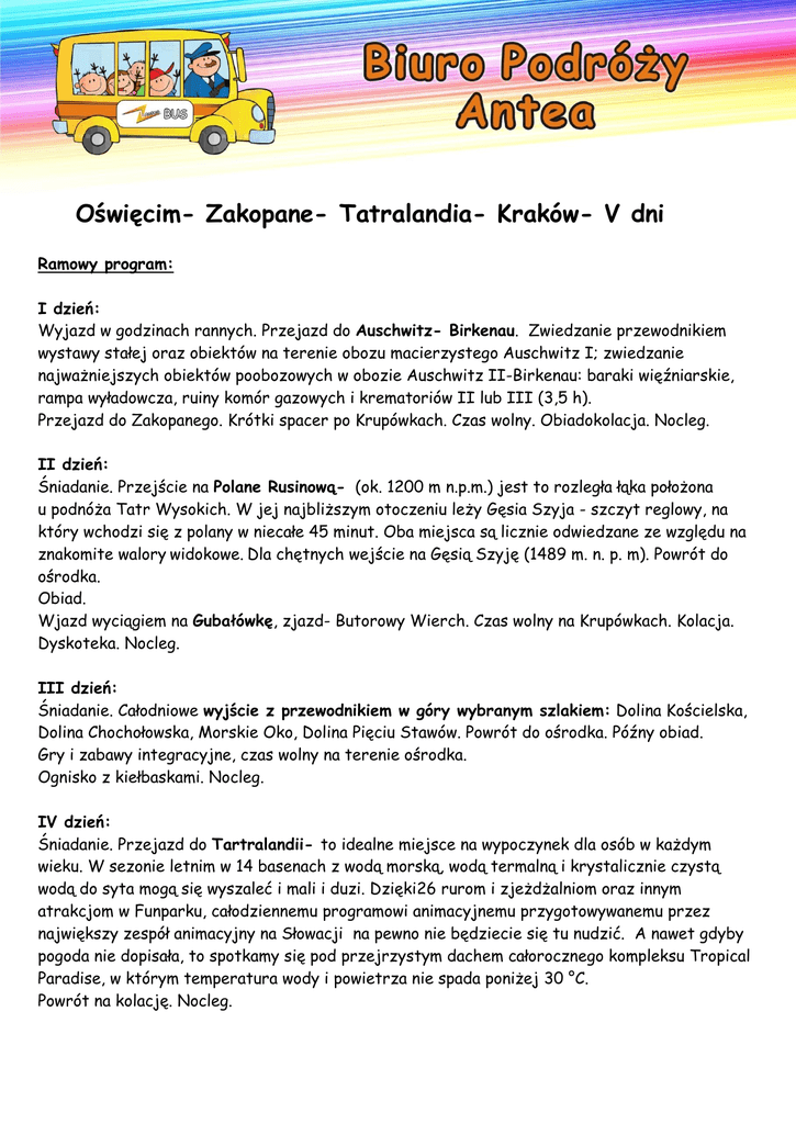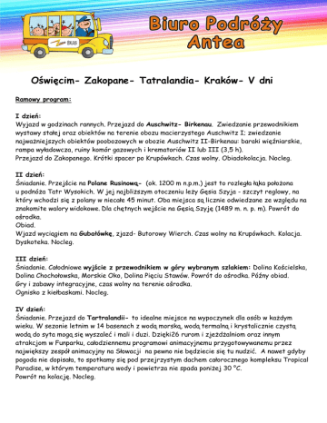 Oświęcim- Zakopane- Tatralandia- Kraków- V dni Ramowy program: I dzień: Wyjazd w godzinach rannych. Przejazd do Auschwitz- Birkenau. Zwiedzanie przewodnikiem wystawy stałej oraz obiektów na terenie obozu macierzystego Auschwitz I; zwiedzanie najważniejszych obiektów poobozowych w obozie Auschwitz II-Birkenau: baraki więźniarskie, rampa wyładowcza, ruiny komór gazowych i krematoriów II lub III (3,5 h). Przejazd do Zakopanego. Krótki spacer po Krupówkach. Czas wolny. Obiadokolacja. Nocleg. II dzień: Śniadanie. Przejście na Polane Rusinową- (ok. 1200 m n.p.m.) jest to rozległa łąka położona u podnóża Tatr Wysokich. W jej najbliższym otoczeniu leży Gęsia Szyja - szczyt reglowy, na który wchodzi się z polany w niecałe 45 minut. Oba miejsca są licznie odwiedzane ze względu na znakomite walory widokowe. Dla chętnych wejście na Gęsią Szyję (1489 m. n. p. m). Powrót do ośrodka. Obiad. Wjazd wyciągiem na Gubałówkę, zjazd- Butorowy Wierch. Czas wolny na Krupówkach. Kolacja. Dyskoteka. Nocleg. III dzień: Śniadanie. Całodniowe wyjście z przewodnikiem w góry wybranym szlakiem: Dolina Kościelska, Dolina Chochołowska, Morskie Oko, Dolina Pięciu Stawów. Powrót do ośrodka. Późny obiad. Gry i zabawy integracyjne, czas wolny na terenie ośrodka. Ognisko z kiełbaskami. Nocleg. IV dzień: Śniadanie. Przejazd do Tartralandii- to idealne miejsce na wypoczynek dla osób w każdym wieku. W sezonie letnim w 14 basenach z wodą morską, wodą termalną i krystalicznie czystą wodą do syta mogą się wyszaleć i mali i duzi. Dzięki26 rurom i zjeżdżalniom oraz innym atrakcjom w Funparku, całodziennemu programowi animacyjnemu przygotowywanemu przez największy zespół animacyjny na Słowacji na pewno nie będziecie się tu nudzić. A nawet gdyby pogoda nie dopisała, to spotkamy się pod przejrzystym dachem całorocznego kompleksu Tropical Paradise, w którym temperatura wody i powietrza nie spada poniżej 30 °C. Powrót na kolację. Nocleg. V dzień: Śniadanie. Zwiedzanie z przewodnikiem starego Krakowa: Kościół Mariacki, Stare Miasto, Sukiennice, Wawel- Groby Królewskie, Katedra pw. św. Stanisława i św. Wacława, Dzwon Zygmunta. Obiad. Czas wolny. Wyjazd w drogę powrotną . Przyjazd w godzinach wieczornych. Świadczenia zawarte w cenie: - transport komfortowym autokarem (Klima, DVD, WC) zakwaterowanie wg programu (pokoje 2,3,4 os z łazienkami) wyżywienie wg programu bilety wstępu (2x TPN, wjazd na Gubałówkę, Kościół Mariacki, Wawel- Katedra) opiekę pilota przewodnik w Auschwitz, tatrzański, krakowski ubezpieczenie uczestników parkingi, opłaty drogowe podatek VAT