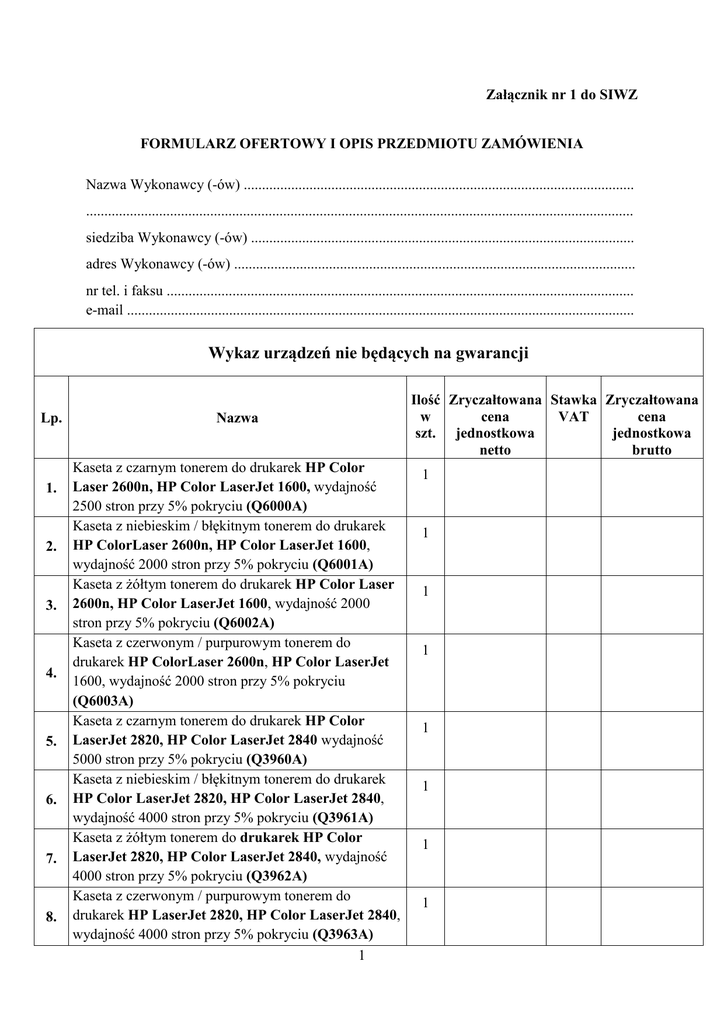Załącznik nr 1 do SIWZ FORMULARZ OFERTOWY I OPIS PRZEDMIOTU ZAMÓWIENIA Nazwa Wykonawcy (-ów) ........................................................................................................... ...................................................................................................................................................... siedziba Wykonawcy (-ów) ......................................................................................................... adres Wykonawcy (-ów) .............................................................................................................. nr tel. i faksu ................................................................................................................................ e-mail ........................................................................................................................................... Wykaz urządzeń nie będących na gwarancji Lp. 1. 2. 3. 4. 5. 6. 7. 8. Nazwa Kaseta z czarnym tonerem do drukarek HP Color Laser 2600n, HP Color LaserJet 1600, wydajność 2500 stron przy 5% pokryciu (Q6000A) Kaseta z niebieskim / błękitnym tonerem do drukarek HP ColorLaser 2600n, HP Color LaserJet 1600, wydajność 2000 stron przy 5% pokryciu (Q6001A) Kaseta z żółtym tonerem do drukarek HP Color Laser 2600n, HP Color LaserJet 1600, wydajność 2000 stron przy 5% pokryciu (Q6002A) Kaseta z czerwonym / purpurowym tonerem do drukarek HP ColorLaser 2600n, HP Color LaserJet 1600, wydajność 2000 stron przy 5% pokryciu (Q6003A) Kaseta z czarnym tonerem do drukarek HP Color LaserJet 2820, HP Color LaserJet 2840 wydajność 5000 stron przy 5% pokryciu (Q3960A) Kaseta z niebieskim / błękitnym tonerem do drukarek HP Color LaserJet 2820, HP Color LaserJet 2840, wydajność 4000 stron przy 5% pokryciu (Q3961A) Kaseta z żółtym tonerem do drukarek HP Color LaserJet 2820, HP Color LaserJet 2840, wydajność 4000 stron przy 5% pokryciu (Q3962A) Kaseta z czerwonym / purpurowym tonerem do drukarek HP LaserJet 2820, HP Color LaserJet 2840, wydajność 4000 stron przy 5% pokryciu (Q3963A) 1 Ilość Zryczałtowana Stawka Zryczałtowana w cena VAT cena szt. jednostkowa jednostkowa netto brutto 1 1 1 1 1 1 1 1 9. 10. 11. 12. 13. 14. 15. 16. 17. 18. 19. 20. 21. 22. 23. Bęben obrazowy do drukarek HP Color LaserJet 2820, HP Color laserJet 2840, wydajność 20000, (Q3964A) Kaseta z czarnym tonerem do drukarki HP Color LaserJet CP1215, wydajność 2200 stron przy 5% pokryciu (CB540A) Kaseta z błękitnym / niebieskim tonerem do drukarki HP Color LaserJet CP1215, wydajność 1400 stron przy 5% pokryciu (CB541A) Kaseta z żółtym tonerem do drukarki HP Color LaserJet CP1215, wydajność 1400 stron przy 5% pokryciu (CB542A) Kaseta z purpurowym / czerwonym tonerem do drukarki HP Color LaserJet CP1215, wydajność 1400 stron przy 5% pokryciu (CB543A) Kartridż z czarnym tuszem do drukarki HP DeskJet 5150, wydajność 520 stron przy 5% pokryciu (C6656AE) Kartridż z kolorowym tuszem do drukarki HP DeskJet 5150, wydajność 500 stron przy 5% pokryciu, (C6657AE) 1 1 1 1 1 1 1 Kaseta z czarnym tonerem do drukarki Lexmark E120, wydajność 2000 stron przy 5% pokryciu (12016SE) 1 Bęben obrazowy do drukarki Lexmark E120, wydajność 25000 stron przy 5% pokryciu (12026XW) Kaseta z czarnym tonerem do drukarki HP LaserJet 1005, wydajność 2500 stron przy 5% pokryciu (C7115A) Kaseta z czarnym tonerem do drukarek HP LaserJet 1010, HP LaserJet 1015, HP LaserJet 1018, HP LaserJet 1020, HP LaserJet 1022 wydajność 2000 stron przy 5% pokryciu (Q2612A) Kaseta z czarnym tonerem do drukarki HP LaserJet 1100, wydajność 2500 stron przy 5% pokryciu (C4092A) Kaseta z czarnym tonerem do drukarki HP LaserJet 1200, wydajność 3500 stron przy 5% pokryciu (C7115X) Kaseta z czarnym tonerem do drukarki HP LaserJet 1300, wydajność 4000 stron przy 5% pokryciu (Q2613X) Kaseta z czarnym tonerem do drukarki HP LaserJet 2200, wydajność 5000 stron przy 5% pokryciu 1 2 1 1 1 1 1 1 24. 25. 26. 27. 28. 29. 30. 31. (C4096A) Kaseta z czarnym tonerem do drukarki HP LaserJet P2035, wydajność 2300 stron przy 5% pokryciu (CE505A) Kaseta z czarnym tonerem do drukarki HP Laserjet Pro CP 1525N, wydajność 2000 stron przy 5% pokryciu (CE320A) Kaseta z błękitnym / niebieskim tonerem do drukarki HP LaserJet Pro CP 1525N, wydajność 1300 stron przy 5% pokryciu (CE321A) Kaseta z żółtym tonerem do drukarki HP LaserJet Pro CP 1525N, wydajność 1300 stron przy 5% pokryciu (CE322A) Kaseta z purpurowym / czerwonym tonerem do drukarki HP LaserJet Pro CP 1525N, wydajność 1300 stron przy 5% pokryciu (CE323A) Kaseta z czarnym tonerem do drukarki Xerox 6125N, wydajność 2000 stron przy 5% pokryciu (106R01338) Kaseta z niebieskim/błękitnym tonerem do drukarki Xerox 6125N, wydajność 1000 stron przy 5% pokryciu, (106R01335) Kaseta z czerwonym / purpurowym tonerem do drukarki Xerox 6125N, wydajność 1000 stron przy 5% pokryciu, (106R01336) Kaseta z żółtym tonerem do drukarki Xerox 6125N, wydajność 1000 stron przy 5% pokryciu, (106R01337) Kartridż z czarnym tuszem do drukarki Canon Pixma 33. IP 3600, wydajność 324 stron przy 5% pokryciu, (PGI520BK) Kartridż z czarnym tuszem do drukarki Canon Pixma 34. IP 3600, wydajność 350 stron przy 5% pokryciu, (CLI-521BK) Kartridż z niebieskim tuszem do drukarki Canon 35. Pixma IP 3600, wydajność 535 stron przy 5% pokryciu (CLI-521C) 32 Kartridż z czerwonym tuszem do drukarki Canon 36. Pixma IP 3600, wydajność 510 stron przy 5% pokryciu, (CLI-521M) Kartridż z żółtym tuszem do drukarki Canon Pixma IP 37. 3600, wydajność 530 stron przy 5% pokryciu (CLI-521Y) Kaseta z czarnym tonerem do drukarki Samsung SCX38. 4720FN, wydajność 5000 stron, (SCX-4720D5/ELS) 3 1 1 1 1 1 1 1 1 1 1 1 1 1 1 1 39. 40. 41. 42. Kaseta z czarnym tonerem do drukarki Xerox WORKCENTRE 7245, wydajność 26000 stron przy 5% pokryciu (006R01175) Kaseta z błękitnym / niebieskim tonerem do drukarki Xerox WORKCENTRE 7245,