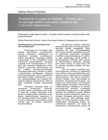 Sztuka Leczenia 2006, tom XIII, nr 3-4, s. 49-59 Helena Wrona-Polańska Osobowość w walce ze stresem – Zmiana obrazu samego siebie w procesie zmagania się z chorobą białaczkową Personality in fight against stress – change of self concept in coping process with leukemia illness Zakład Psychologii Zdrowia, Katedry Psychologii Akademii Pedagogicznej w Krakowie Psychologiczne uwarunkowania chorób somatycznych Problematyka ta ma bardzo duże tradycje zakorzenione w psychoanaliztycznym rodowodzie, wskazującym na mechanizm konwersji w powstawaniu chorób niemających wyraźnego podłoża organicznego, tj. bez manifestacji zmian w strukturze poszczególnych narządów a jedynie w ich funkcjonowaniu np. w postaci kolki nerkowej, dolegliwości pochodzących z przewodu pokarmowego, czy też z układu sercowo-naczyniowego. Konwersję histeryczną uważano za jeden z mechanizmów powstawania zaburzeń psychosomatycznych, było to symboliczne rzutowanie przeżyć psychicznych na somę, odzwierciedlające się w postaci konkretnych objawów somatycznych, które nie miały wyraźnego podłoża organicznego (35). Późniejsze koncepcje także zorientowane dynamicznie zmierzały, w wyniku badań o charakterze case study, do opisu tzw. profilów osobowości. w ten sposób powstały profile osobowości wrzodowca, nadciśnieniowca, zawałowca (7, 19). Jednakże trudno było określić, na ile te cechy osobowości są czynnikiem ryzyka choroby, gdyż nie badano osobowości przedchorobowej. Do głównych badaczy problemów psychosomatycznych w nurcie psychoanalitycznym należał niewątpliwie Franz Alexander (5), który w etiopatogenezie tych chorób wyróżnił następujące czynniki: a) właściwości osobowości wynikające z konfliktu wczesnodziecięcego, b) aktualny stres aktywizujący dawny konflikt, c) konstytucjonalnie osłabiony dany narząd. Te uwarunkowania wyjaśniały, dlaczego jedni ludzie chorują na zawał serca, inni na chorobę wrzodową żołądka lub dwunastnicy itp. Inny nurt badań w podejściu psychosomatycznym zmierzał do wyjaśnienia tych chorób w ujęciu psychofizjologii i jako reakcji na stres, a także zmiany w układzie odpornościowym (25). Były to interdyscyplinarne badania, które doprowadziły do powstania psychoneuroimmunologii zajmującej się zależnościami zachodzącymi między układem nerwowym, hormonalnym i odpornościowym. Zakładano, że czynniki psychologiczne wchodzą w interakcję z czynnikami biologicznymi i w taki sposób dochodzi do powstania choroby. Bodźce stresowe poprzez pobudzenie układu nerwowego wzmagają jednocześnie aktywność hormonów, które wpływają bezpośrednio na funkcje komórek układu immunologicznego, zmniejszając zasoby odpornościowe organizmu. Za twórcę tej współczesnej psychosomatyki uważa się 49 Osobowość w walce ze stresem Roberta Adera (1). Liczne badania prowadzone przez Solomona (27) i innych ukazały, że stres i jego spostrzeganie wiąże się ściśle z funkcjonowaniem systemu nerwowego (Sheridan, Radmacher, 26), zaś odporność immunologiczna nie jest tylko procesem fizjologicznym ale zależy w bardzo dużym stopniu od czynników psychologicznych, a przede wszystkim oceny przeżywanego stresu, wzbudzanych emocji oraz sposobów radzenia sobie ze stresem. Przewlekły stres i nieskuteczne radzenie sobie z nim, tj. bierny styl radzenia, prowadzi do kumulacji negatywnych emocji, nadmiernego wydzielania hormonu stresu – kortyzolu krążącego we krwi, a w konsekwencji do hiperadaptozy, skutkującej w zależności od wzorów reagowania wegetatywnego zmianami w narządach wewnętrznych czyli chorobą – depresją i zwiększonym prawdopodobieństwem ryzyka choroby nowotworowej. Współczesne podejście do chorób psychosomatycznych uwzględnia złożone modele funkcjonowania czynników ryzyka, np. uwarunkowania genetyczne, społeczne, psychologiczne, wzory reagowania wegetatywnego, percepcyjnego, emocjonalnego, wzory zachowania. Istniejące liczne badania wskazują, że wzór zachowania a prowadzi do choroby niedokrwiennej serca (35), zaś wzór zachowania C charakteryzujący się kumulowaniem negatywnych emocji i przeżywaniem poczucia winy prowadzi do chorób nowotworowych, gdyż emocje te działają immunosupresyjnie na układ odpornościowy (26). Generalnie, w tradycyjnym podejściu psychosomatycznym poszukiwano czynnika urazowego i osobowości przedchorobowej w powstawaniu choroby nowotworowej (2). Współcześnie w powstawaniu nowotworów bierze się pod uwagę wieloczynnikowe uwarunkowania, w tym bardzo duży udział stresu i jego immunosupresyjny wpływ na układ odpornościowy. Na gruncie polskim bardzo duże zasługi w rozwoju problematyki psychosomatycznej przypisuje się Ośrodkowi 50 Krakowskiemu, zwłaszcza Julianowi Aleksandrowiczowi, lekarzowi i wielkiemu humaniście, inicjatorowi III rewolucji zdrowotnej zapoczątkowanej konferencją naukowo-humanistyczną w 1972 roku w Krakowie, którego uważa się za nestora polskiej psychosomatyki i twórcę edukacji psychosomatycznej (4, 34). Kontynuatorami tej idei są m. in. Gaertner, Magdoń – założyciele Towarzystwa Edukacji Psychosomatycznej z siedzibą w Krakowie (21). Idea ta znalazła wyraz w publikacjach (3), a najpełniej wyraziła się w sentencji znajdującej się u wejścia do Kliniki Hematologii Collegium Medicum UJ: klinika nie tylko leczy, ale uczy jak żyć, aby zachować zdrowie. Współczesne myślenie o chorobie i człowieku chorym wymaga także podejścia somatopsychicznego jako komplementarnego, które najpełniej zawiera się w pytaniu: Jak chorzy radzą sobie z tym jednym z największych stresów, jakim jest choroba białaczkowa i jak można im w tym pomóc? To pytanie stało się początkiem szeroko zakrojonych badań prowadzonych przez autorkę wśród chorych na białaczkę (30). Celem pracy jest ukazanie roli osobowości w walce ze stresem na przykładzie zmiany obrazu samego siebie w procesie zmagania się z chorobą