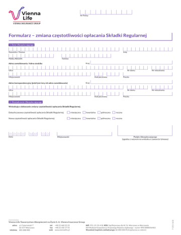 Nr Polisy Formularz – zmiana częstotliwości opłacania Składki Regularnej 1. Dane Ubezpieczającego Nazwisko / Nazwa Imię Telefon PESEL/REGON Kraj Adres zameldowania / Adres siedziby Ulica Nr domu Kod pocztowy Miejscowość Adres korespondencyjny (jeżeli jest inny niż adres zameldowania) Poczta Kraj Ulica Nr domu Kod pocztowy Miejscowość Nr mieszkania Nr mieszkania Poczta 2. Oświadczenie Ubezpieczającego Wnioskuję o dokonanie zmiany częstotliwości opłacania Składki Regularnej. Dotychczasowa częstotliwość opłacania Składki Regularnej: £ miesięczna £ kwartalna £ półroczna £ roczna Nowa częstotliwość opłacania Składki Regularnej: £ miesięczna £ kwartalna £ półroczna £ roczna Miejscowość Podpis Ubezpieczającego (zgodny z wzorem na wniosku o zawarcie Umowy) Vienna Life Towarzystwo Ubezpieczeń na Życie S. A. Vienna Insurance Group adres infolinia ul. Cybernetyki 7 02-677 Warszawa 801 888 000 tel. fax web +48 22 460 22 22 +48 22 332 17 55 www.viennalife.pl NIP: 951-19-33-418; KRS: Sąd Rejonowy dla M. St. Warszawy w Warszawie XIII Wydział Gospodarczy Krajowego Rejestru Sądowego - numer KRS 0000056463 Wysokość kapitału zakładowego: 82 000 000 PLN (opłacony w całości) F-ZCS-1610 Data