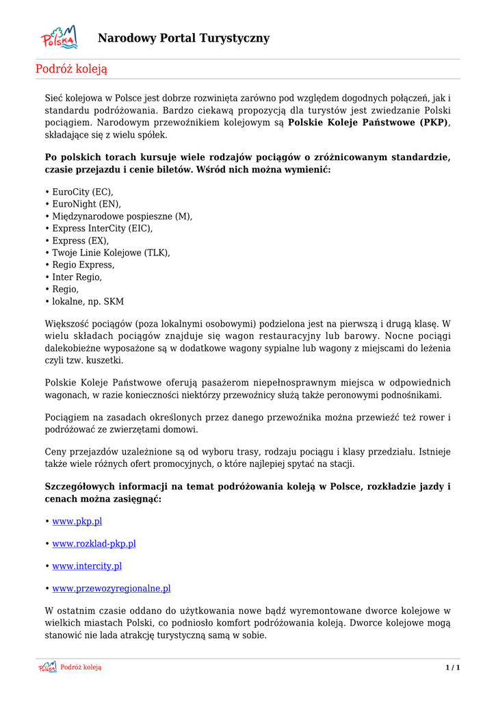 Narodowy Portal Turystyczny Podróż koleją Sieć kolejowa w Polsce jest dobrze rozwinięta zarówno pod względem dogodnych połączeń, jak i standardu podróżowania. Bardzo ciekawą propozycją dla turystów jest zwiedzanie Polski pociągiem. Narodowym przewoźnikiem kolejowym są Polskie Koleje Państwowe (PKP), składające się z wielu spółek. Po polskich torach kursuje wiele rodzajów pociągów o zróżnicowanym standardzie, czasie przejazdu i cenie biletów. Wśród nich można wymienić: • EuroCity (EC), • EuroNight (EN), • Międzynarodowe pospieszne (M), • Express InterCity (EIC), • Express (EX), • Twoje Linie Kolejowe (TLK), • Regio Express, • Inter Regio, • Regio, • lokalne, np. SKM Większość pociągów (poza lokalnymi osobowymi) podzielona jest na pierwszą i drugą klasę. W wielu składach pociągów znajduje się wagon restauracyjny lub barowy. Nocne pociągi dalekobieżne wyposażone są w dodatkowe wagony sypialne lub wagony z miejscami do leżenia czyli tzw. kuszetki. Polskie Koleje Państwowe oferują pasażerom niepełnosprawnym miejsca w odpowiednich wagonach, w razie konieczności niektórzy przewoźnicy służą także peronowymi podnośnikami. Pociągiem na zasadach określonych przez danego przewoźnika można przewieźć też rower i podróżować ze zwierzętami domowi. Ceny przejazdów uzależnione są od wyboru trasy, rodzaju pociągu i klasy przedziału. Istnieje także wiele różnych ofert promocyjnych, o które najlepiej spytać na stacji. Szczegółowych informacji na temat podróżowania koleją w Polsce, rozkładzie jazdy i cenach można zasięgnąć: • www.pkp.pl • www.rozklad-pkp.pl • www.intercity.pl • www.przewozyregionalne.pl W ostatnim czasie oddano do użytkowania nowe bądź wyremontowane dworce kolejowe w wielkich miastach Polski, co podniosło komfort podróżowania koleją. Dworce kolejowe mogą stanowić nie lada atrakcję turystyczną samą w sobie. Podróż koleją 1/1