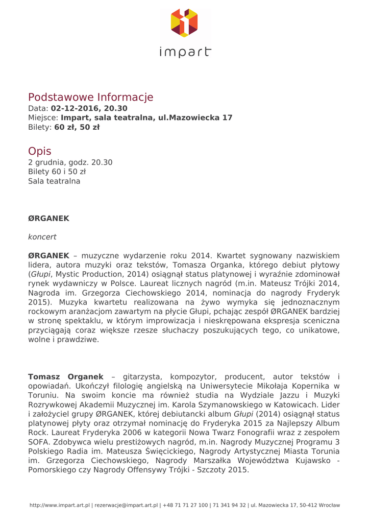 Podstawowe Informacje Data: 02-12-2016, 20.30 Miejsce: Impart, sala teatralna, ul.Mazowiecka 17 Bilety: 60 zł, 50 zł Opis 2 grudnia, godz. 20.30 Bilety 60 i 50 zł Sala teatralna ØRGANEK koncert ØRGANEK – muzyczne wydarzenie roku 2014. Kwartet sygnowany nazwiskiem lidera, autora muzyki oraz tekstów, Tomasza Organka, którego debiut płytowy (Głupi, Mystic Production, 2014) osiągnął status platynowej i wyraźnie zdominował rynek wydawniczy w Polsce. Laureat licznych nagród (m.in. Mateusz Trójki 2014, Nagroda im. Grzegorza Ciechowskiego 2014, nominacja do nagrody Fryderyk 2015). Muzyka kwartetu realizowana na żywo wymyka się jednoznacznym rockowym aranżacjom zawartym na płycie Głupi, pchając zespół ØRGANEK bardziej w stronę spektaklu, w którym improwizacja i nieskrępowana ekspresja sceniczna przyciągają coraz większe rzesze słuchaczy poszukujących tego, co unikatowe, wolne i prawdziwe. Tomasz Organek – gitarzysta, kompozytor, producent, autor tekstów i opowiadań. Ukończył filologię angielską na Uniwersytecie Mikołaja Kopernika w Toruniu. Na swoim koncie ma również studia na Wydziale Jazzu i Muzyki Rozrywkowej Akademii Muzycznej im. Karola Szymanowskiego w Katowicach. Lider i założyciel grupy ØRGANEK, której debiutancki album Głupi (2014) osiągnął status platynowej płyty oraz otrzymał nominację do Fryderyka 2015 za Najlepszy Album Rock. Laureat Fryderyka 2006 w kategorii Nowa Twarz Fonografii wraz z zespołem SOFA. Zdobywca wielu prestiżowych nagród, m.in. Nagrody Muzycznej Programu 3 Polskiego Radia im. Mateusza Święcickiego, Nagrody Artystycznej Miasta Torunia im. Grzegorza Ciechowskiego, Nagrody Marszałka Województwa Kujawsko Pomorskiego czy Nagrody Offensywy Trójki - Szczoty 2015. http://www.impart.art.pl | [email protected] | +48 71 71 27 100 | 71 341 94 32 | ul. Mazowiecka 17, 50-412 Wrocław Uczestnik cyklu Nowe Męskie Granie 2014 oraz Męskie Granie 2015. W roku 2016 Tomasz Organek stanął na czele Męskie Granie Orkiestra. Oficjalna strona Teledyski: Głupi Ja Kate Moss http://www.impart.art.pl | [email protected] | +48 71 71 27 100 | 71 341 94 32 | ul. Mazowiecka 17, 50-412 Wrocław Powered by TCPDF (www.tcpdf.org)