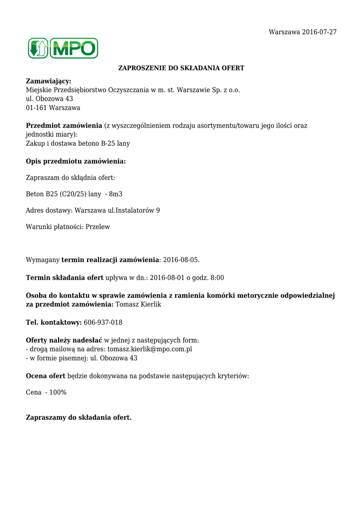 Warszawa 2016-07-27 ZAPROSZENIE DO SKŁADANIA OFERT Zamawiający: Miejskie Przedsiębiorstwo Oczyszczania w m. st. Warszawie Sp. z o.o. ul. Obozowa 43 01-161 Warszawa Przedmiot zamówienia (z wyszczególnieniem rodzaju asortymentu/towaru jego ilości oraz jednostki miary): Zakup i dostawa betono B-25 lany Opis przedmiotu zamówienia: Zapraszam do skłądnia ofert: Beton B25 (C20/25) lany - 8m3 Adres dostawy: Warszawa ul.Instalatorów 9 Warunki płatności: Przelew Wymagany termin realizacji zamówienia: 2016-08-05. Termin składania ofert upływa w dn.: 2016-08-01 o godz. 8:00 Osoba do kontaktu w sprawie zamówienia z ramienia komórki metorycznie odpowiedzialnej za przedmiot zamówienia: Tomasz Kierlik Tel. kontaktowy: 606-937-018 Oferty należy nadesłać w jednej z następujących form: - drogą mailową na adres: [email protected] - w formie pisemnej: ul. Obozowa 43 Ocena ofert będzie dokonywana na podstawie następujących kryteriów: Cena - 100% Zapraszamy do składania ofert.